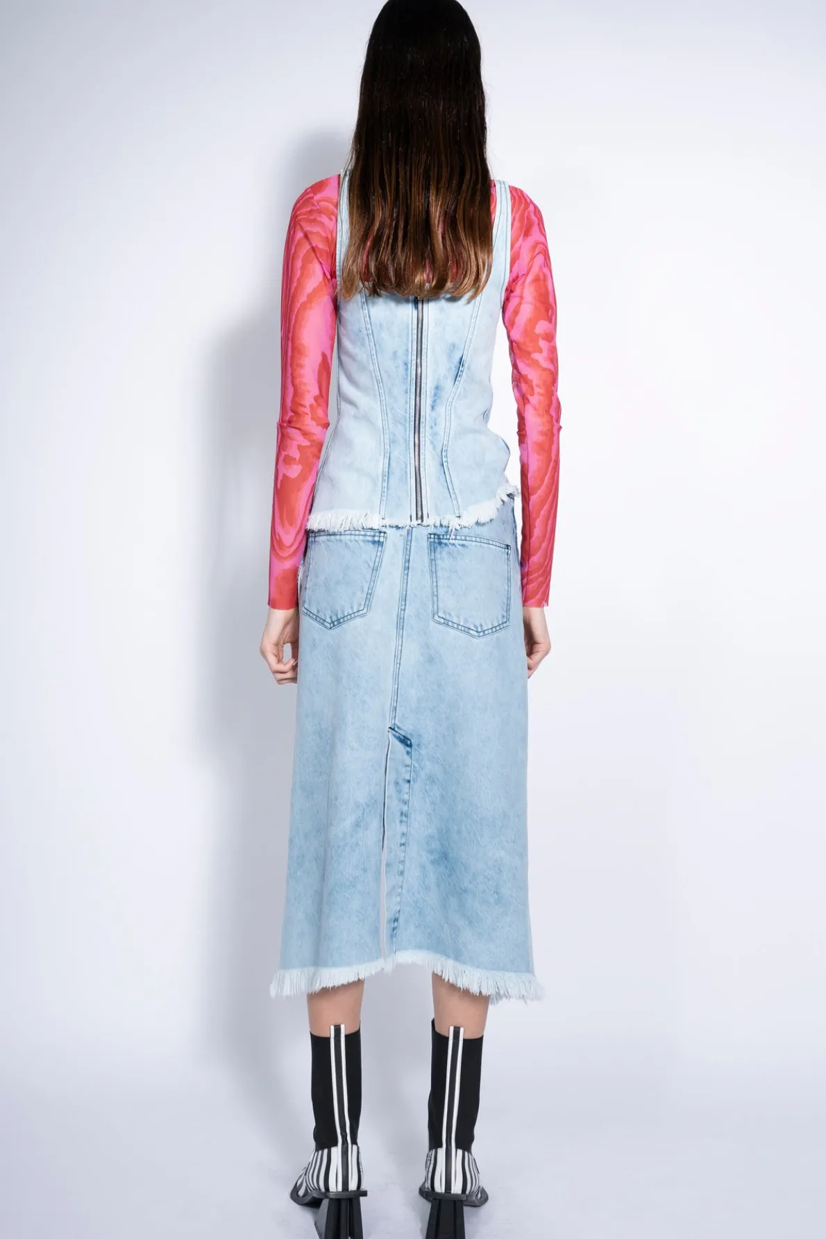 Description: Featuring a midi-length silhouette, this blue classic denim skirt is designed with a crossed front and a buckle for closure, offering an elegant side slit. Fabric: ACID DENIM 43% Refibra / 40% Recycled Cotton / 17% Organic Cotton size and fit: OVERSIZED Ariana is 5ft10 / 1.78 cm and is wearing a size