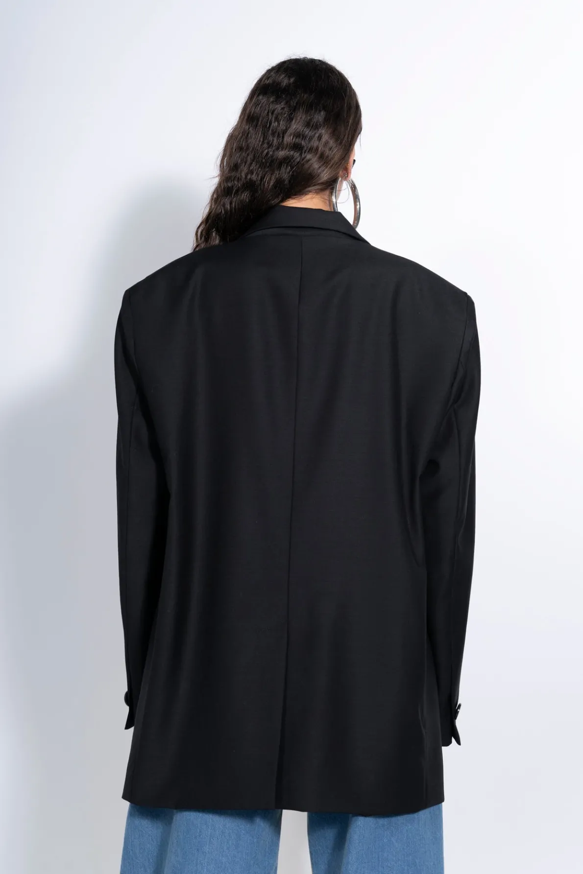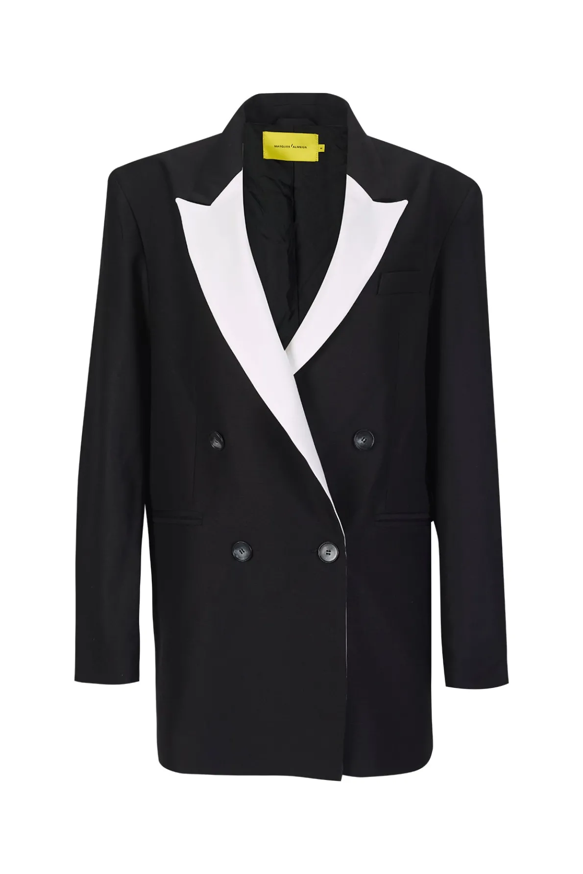 Crafted from luxurious woven wool, this black oversized blazer adds a bold statement to your wardrobe. It features a white collar, two side pockets, and buttons at the front. • Oversized• Black and white• Pointy collar • V neckline