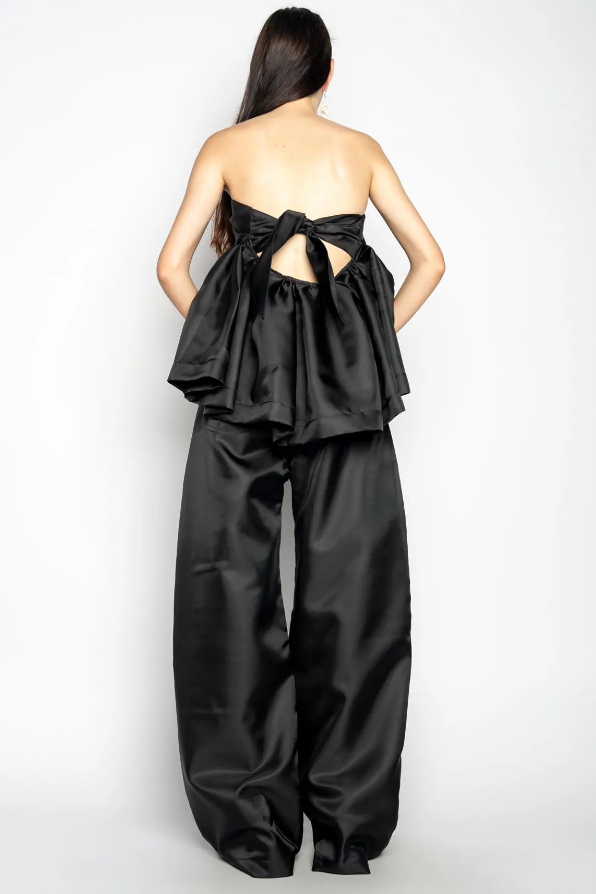 Description: Rock these boyfriend-style trousers crafted in luxe black mikado fabric! Classic pockets, a zipper and button closure, plus an oversized fit will make any look stand out. • Boyfriend style• Pockets• Oversized• Zipper and button closure Fabric: Mikado 100% Recycled Polyester size and fit: OversizedB
