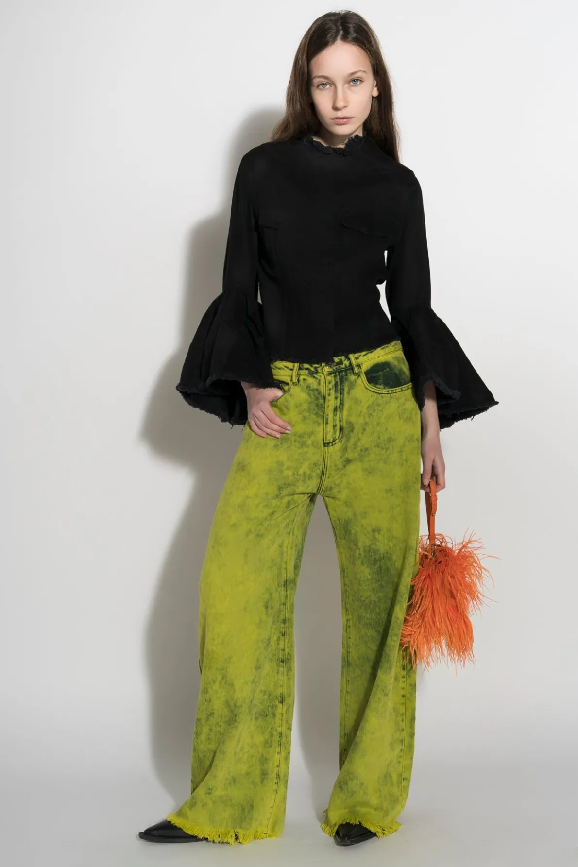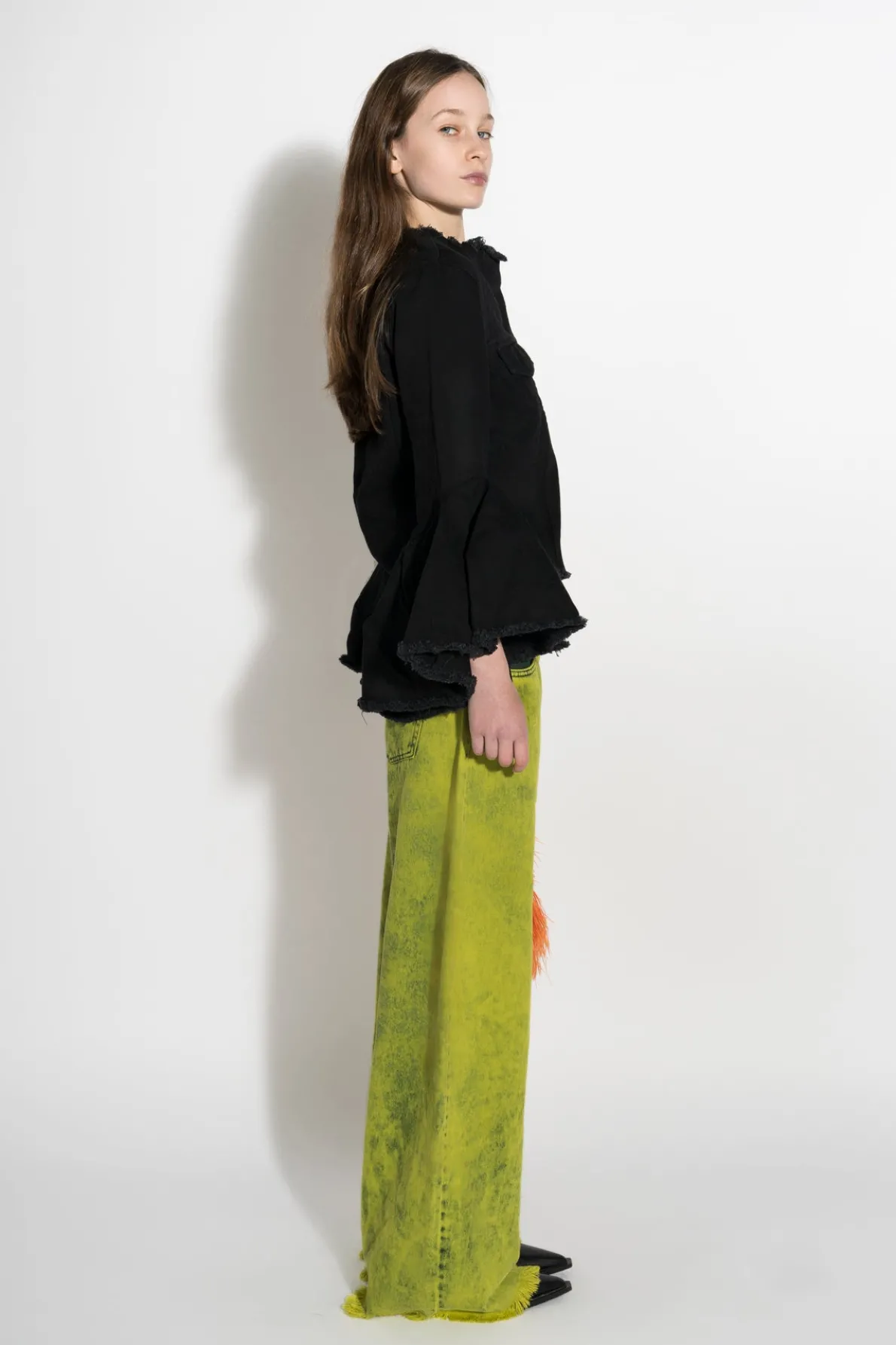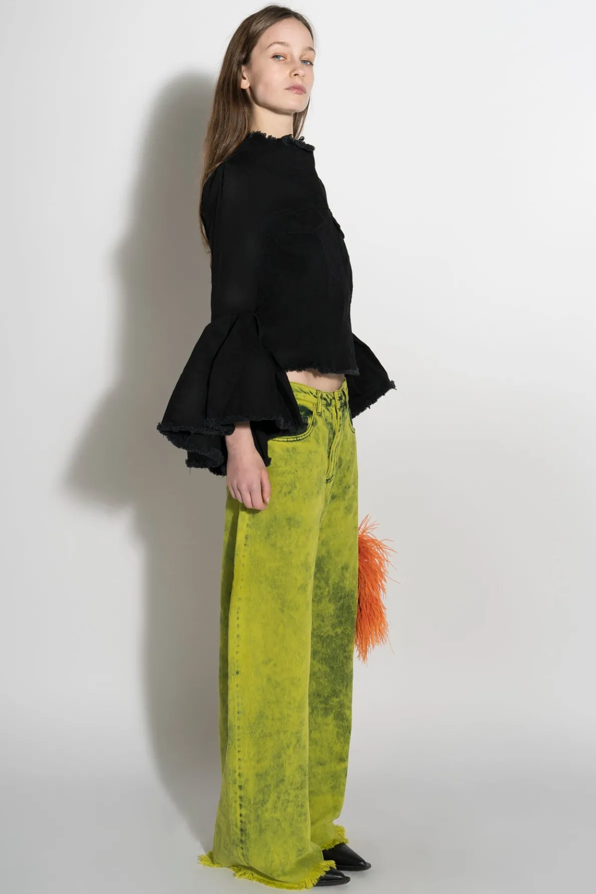 This denim classic jacket is fitted to perfection and finished with bell sleeves. Its frayed edges, round neckline, front button fastening, and two chest pockets create the ultimate look.• Black• Bell sleeves• Frayed edges• Chest pockets