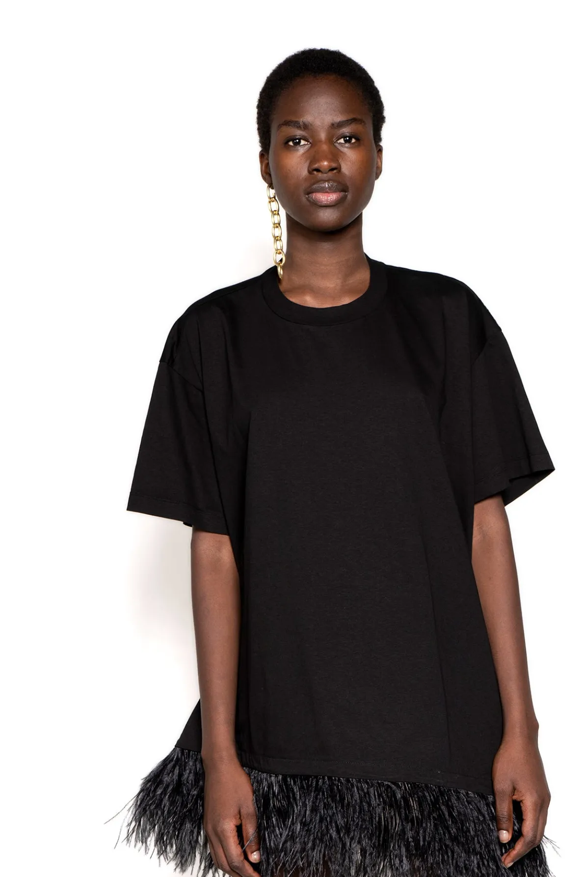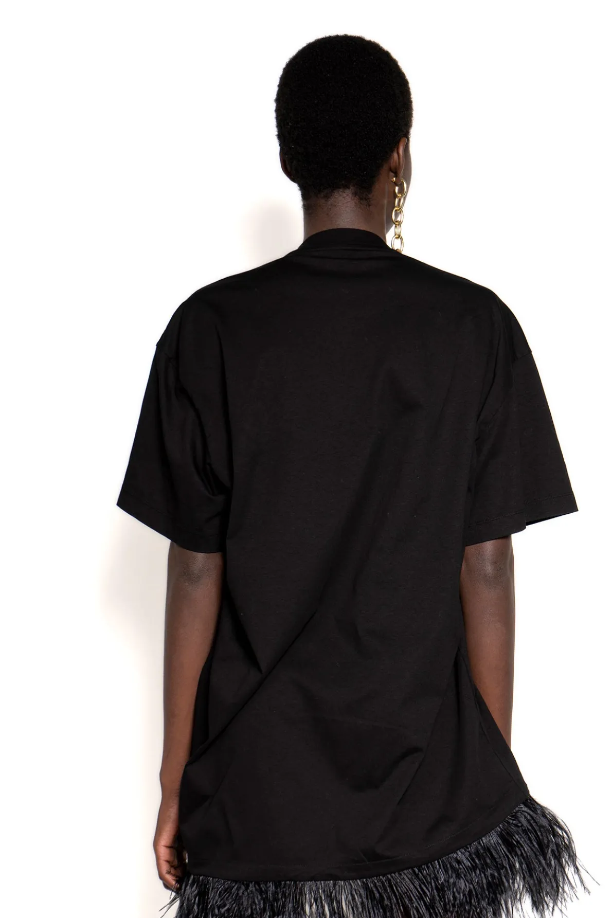 This oversized black t-shirt will be the highlight of your wardrobe! Featuring short sleeves, a round neckline and stunning feather trim, it's the perfect way to make a statement without sacrificing comfort.• Black• Feather hem• Crew neck• Oversized