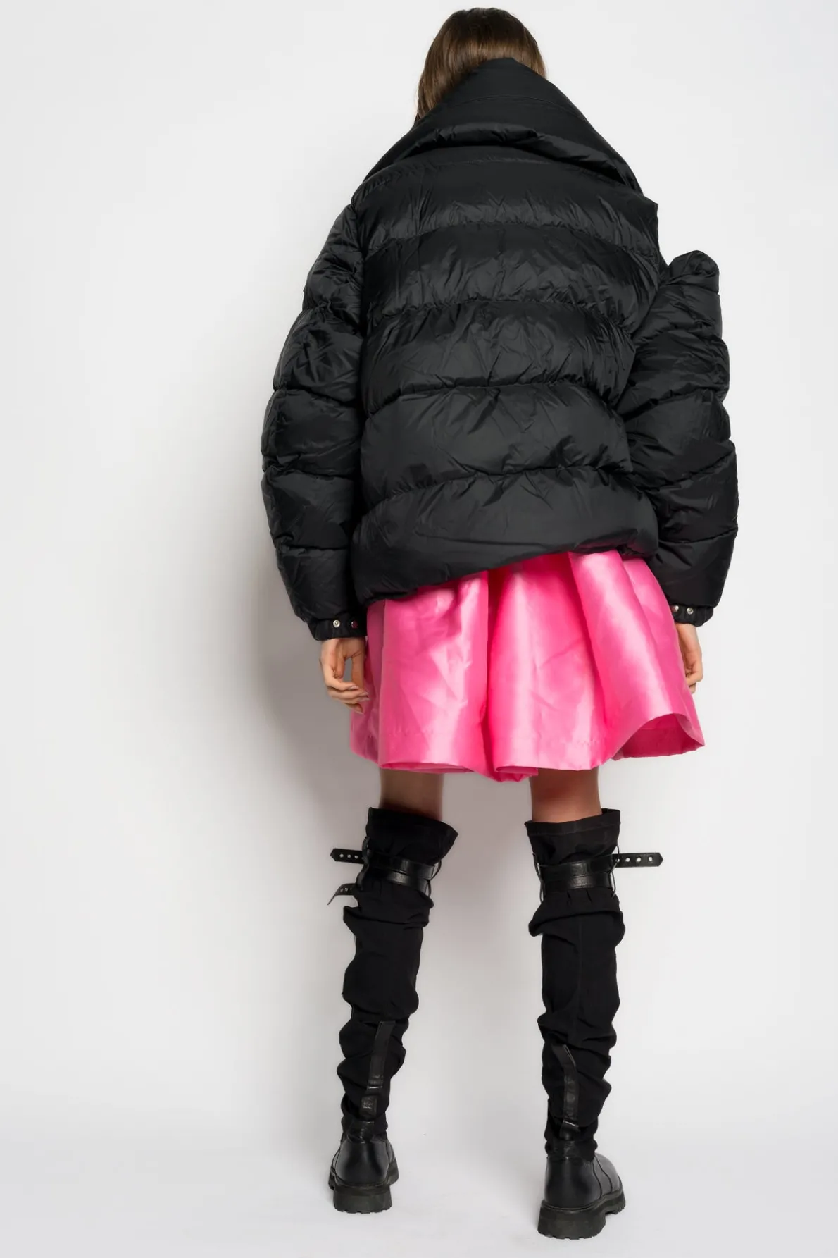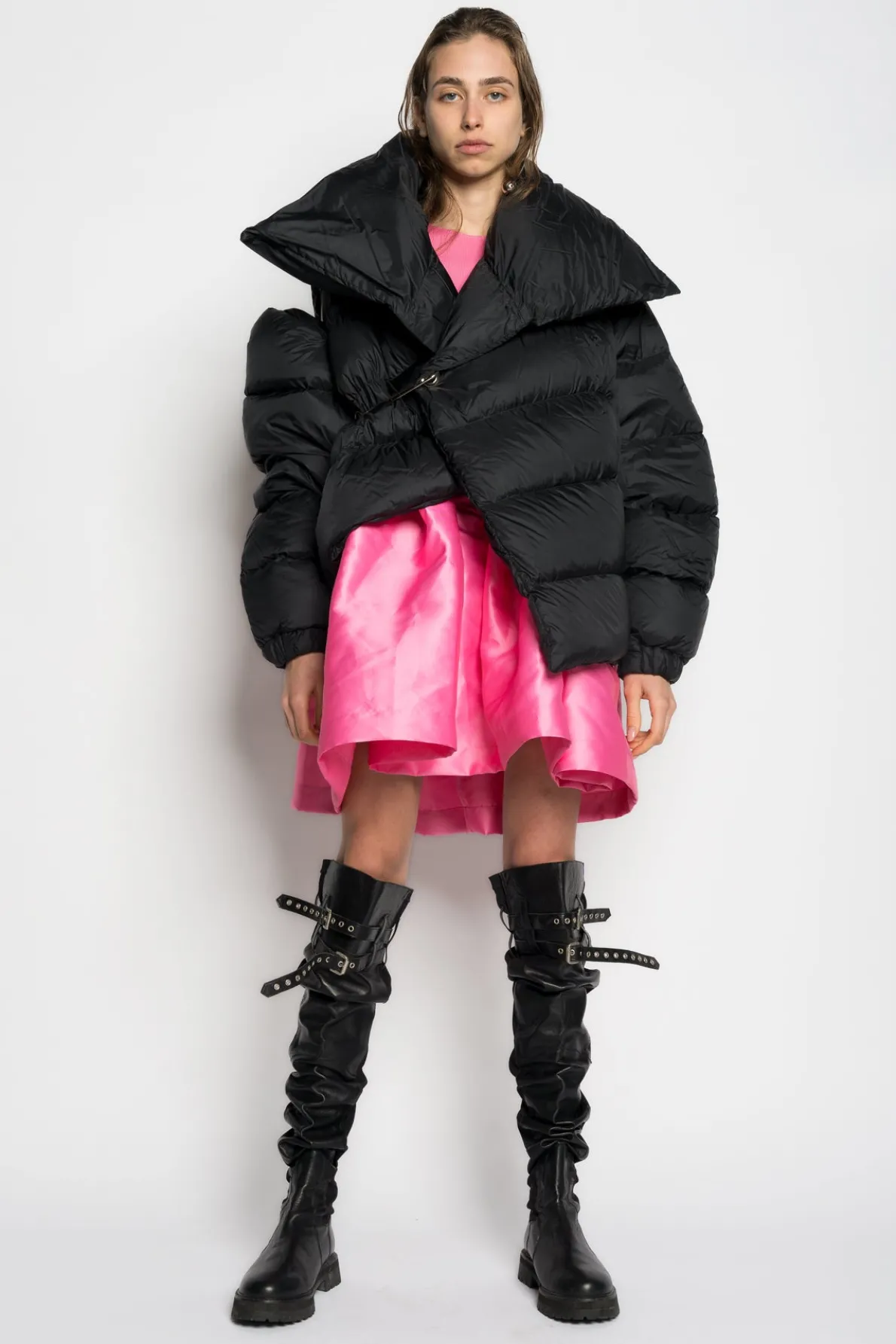 Classic M'A PUFFA Jacket in luxurious black! Flaunt this stylishly-pointed open-collar silhouette, secured by a striking silver safety pin closure. Boasting an asymmetric hem and an eye-catching opening on the left shoulder, this jacket is a must-have in your wardrobe.• Puffa• Asymmetric silhouette• Side shoulder opening• Silver safety pin closure