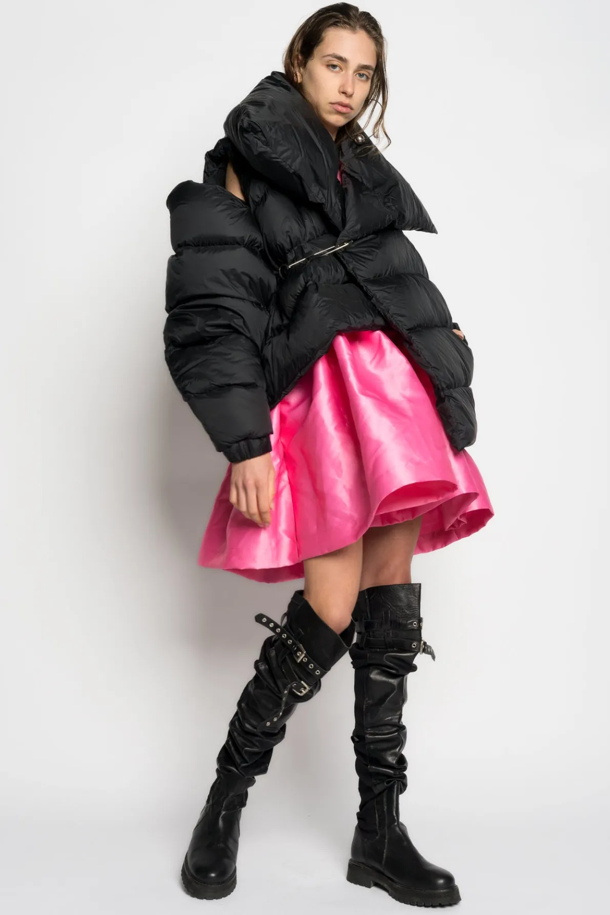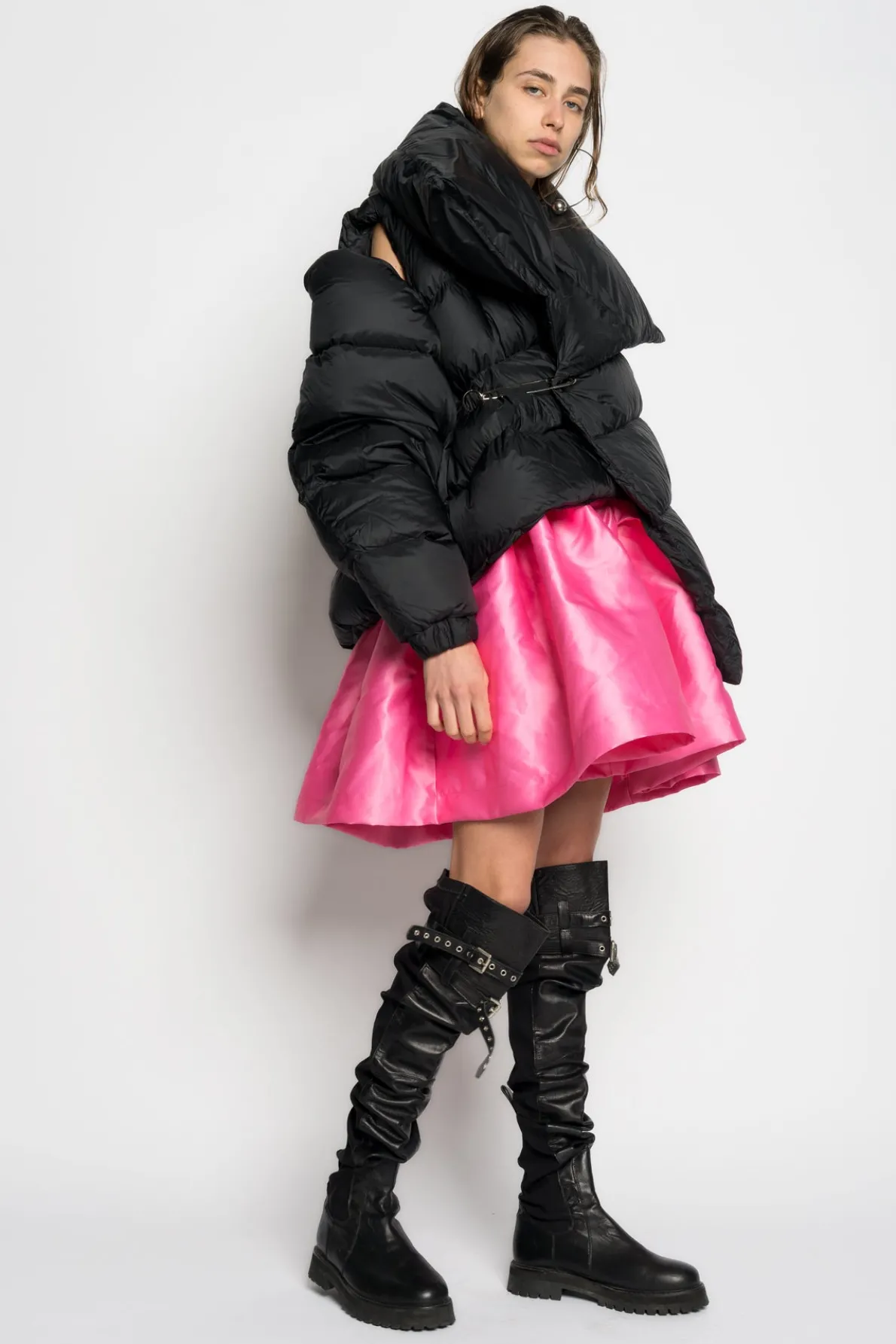 Description: Classic M'A PUFFA Jacket in luxurious black! Flaunt this stylishly-pointed open-collar silhouette, secured by a striking silver safety pin closure. Boasting an asymmetric hem and an eye-catching opening on the left shoulder, this jacket is a must-have in your wardrobe. Fabric: Main: 100% Recycled Polya