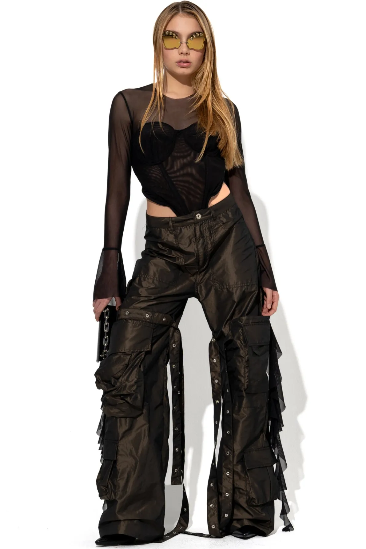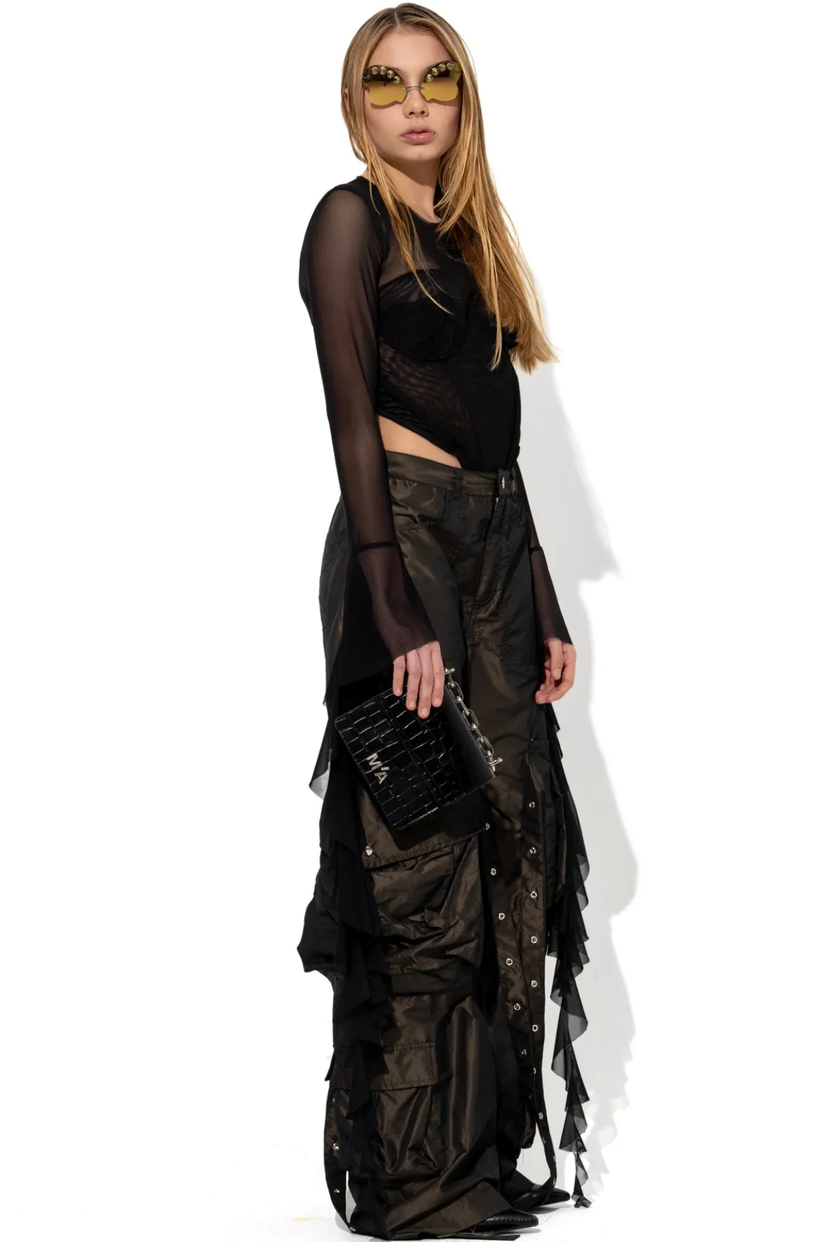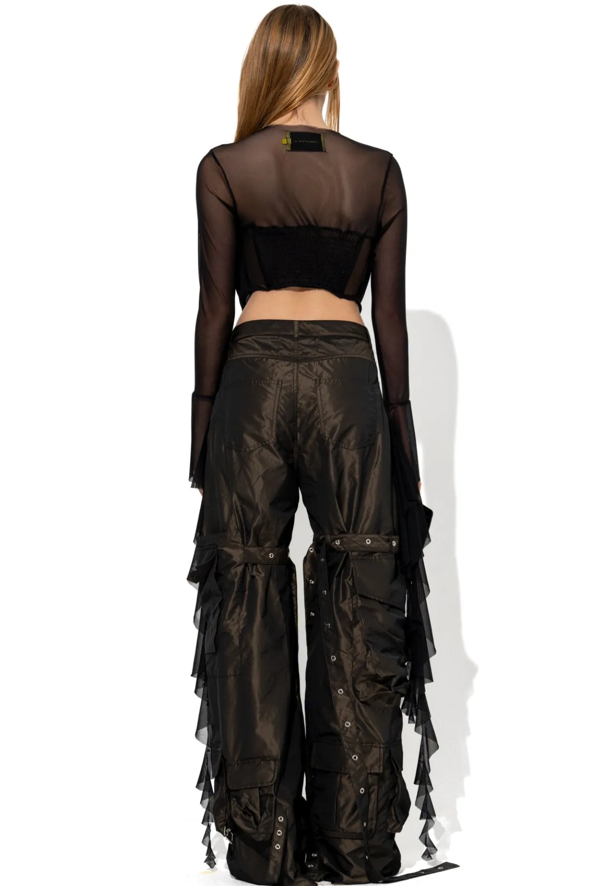 Description: Our black mesh corset top is sure to add a stylish look to any ensemble! This flattering piece features a round neckline, full-length sleeves with delicate frills, and a form-fitting silhouette for a stunning look. Fabric: Jersey Mesh 90% Recycled Polyester, 10% Spandex size and fit: Fitted Sofia i