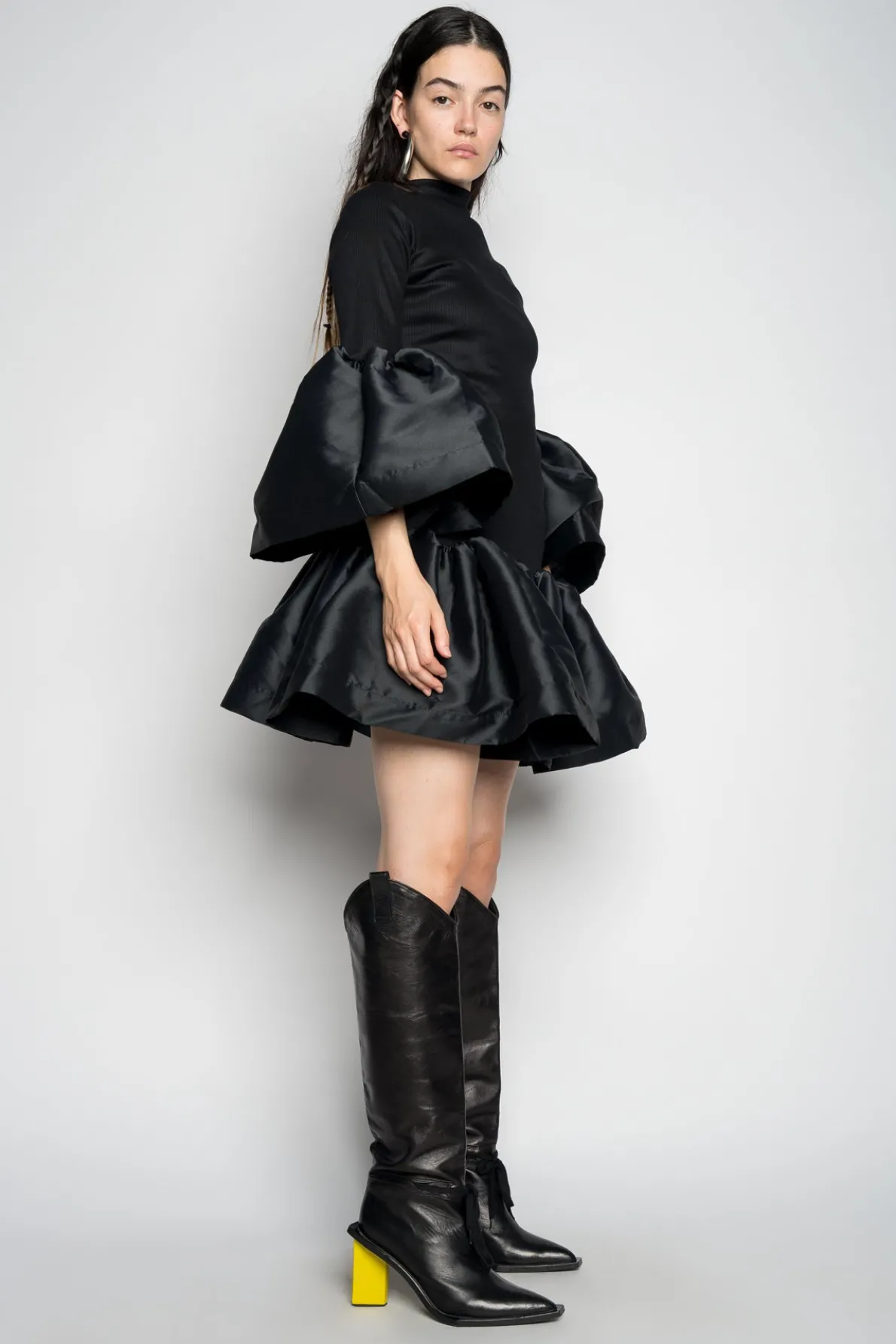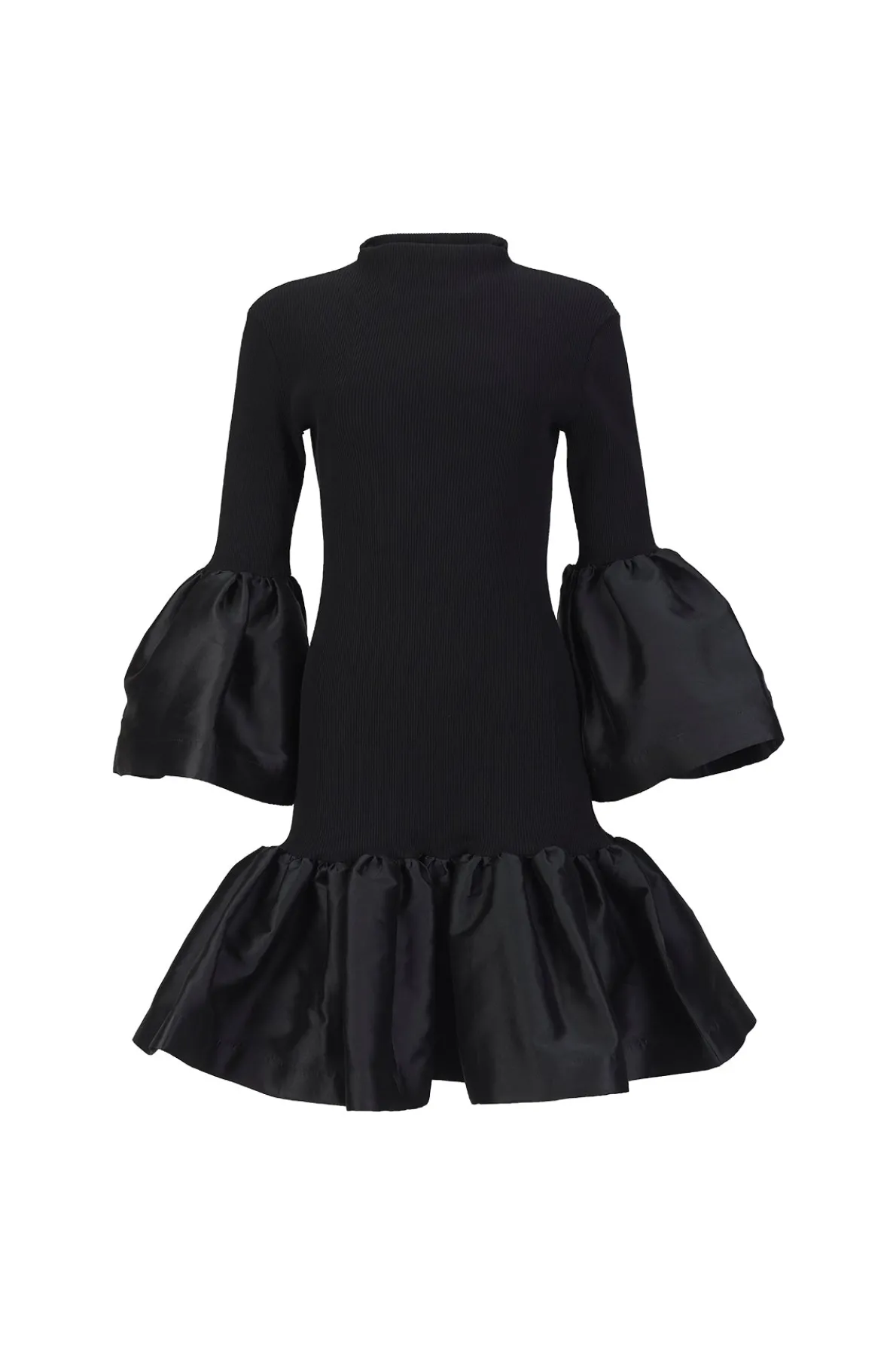 Enchanting black midi dress with a high neckline, captivating puff sleeves, and graceful puff hemline.• Black• High neckline• Puff sleeves• Puff hem