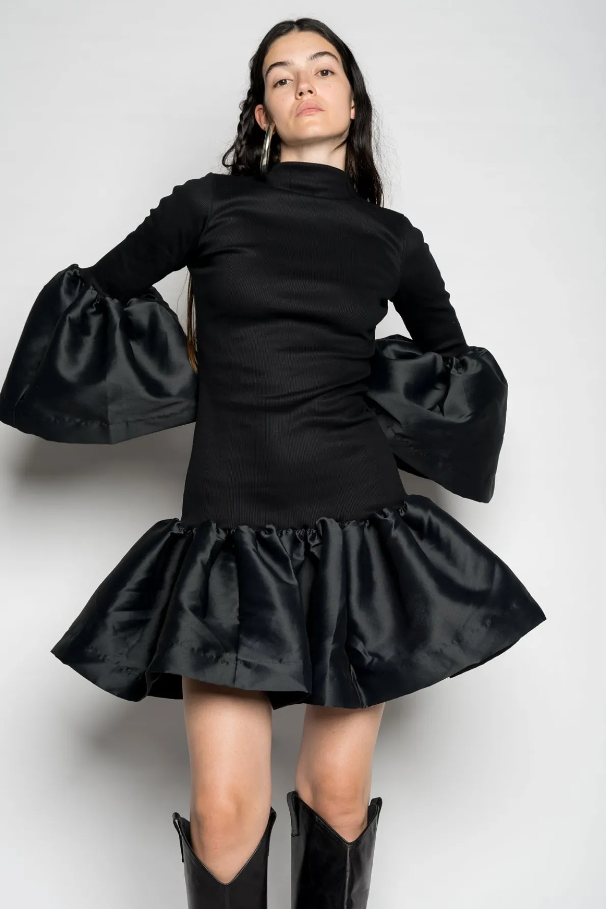 Description: Enchanting black long dress with a high neckline, captivating bell sleeves, and graceful bell hemline. Fabric: RIB JERSEY 100% ORGANIC COTTON, 100% RECYCLED POLYESTER Jersey made of Certified GOTS Organic Cotton and fabric made of Recycled Polyester and Biodegradable natural fibres. size and fit: Sli