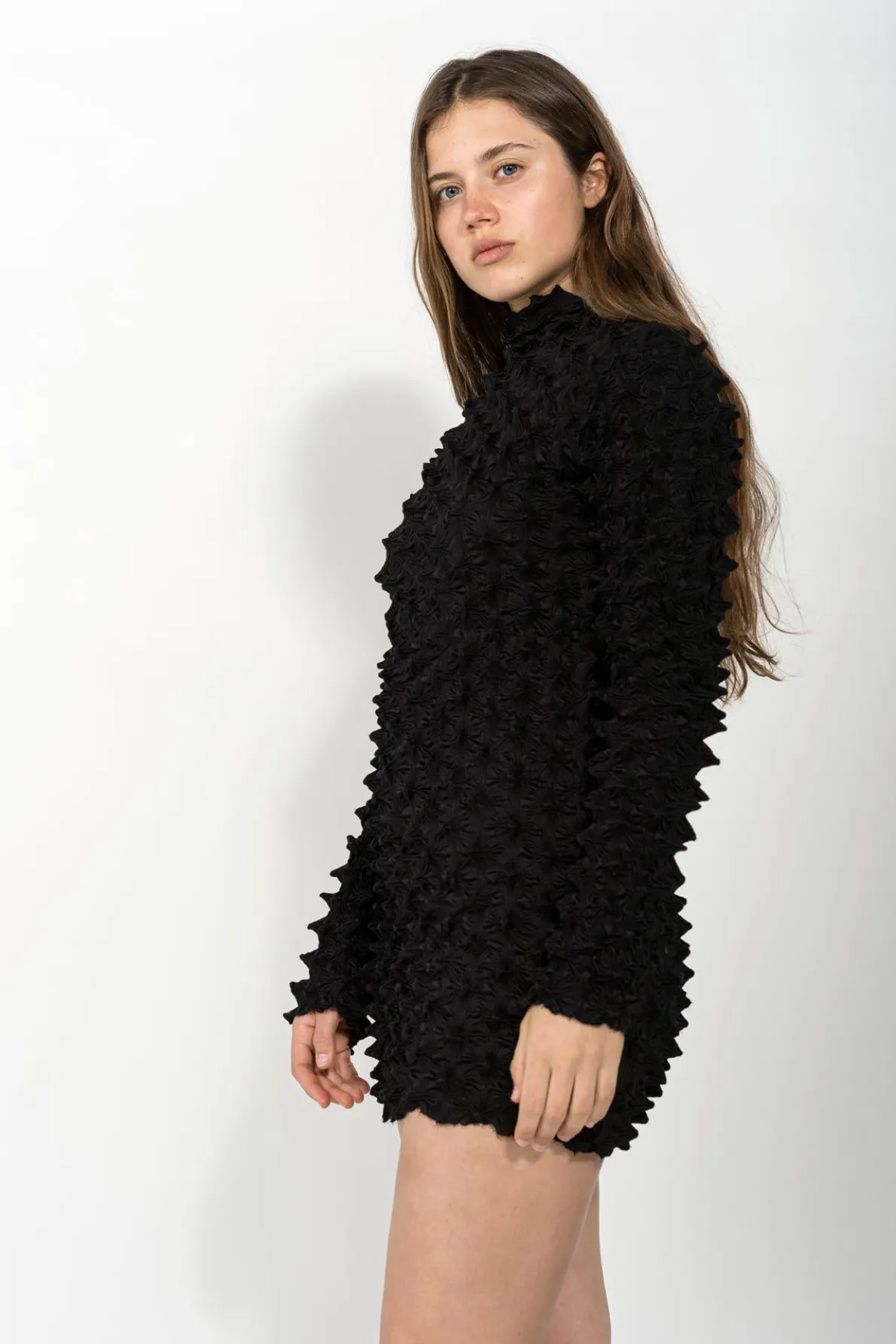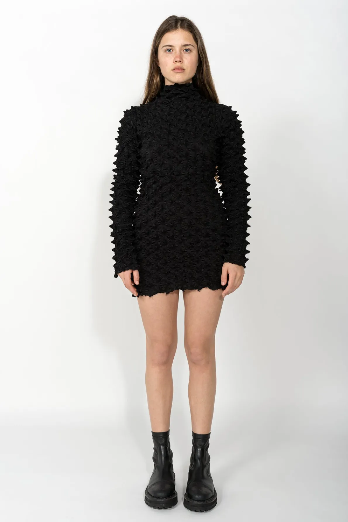 This sleek black dress is adorned with a dynamic spiked elastic pattern. The short length, high neck, and long sleeves make it perfect for any occasion.• Black• Spikes• Long sleeves• High neckline