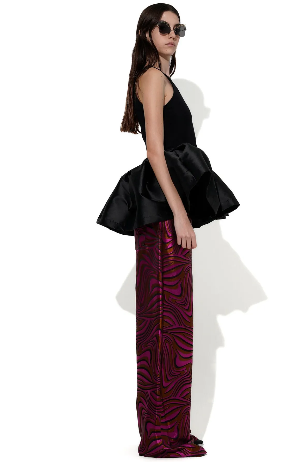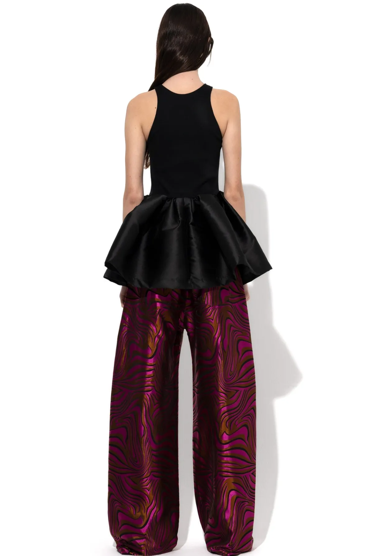 Experience the sleek style of our black rib jersey tank top, finished with a taffeta peplum for an effortlessly stylish look! With its bold yet polished silhouette, it's sure to become a staple in your wardrobe.• Black• Sleeveless • Puff hem• Fitted