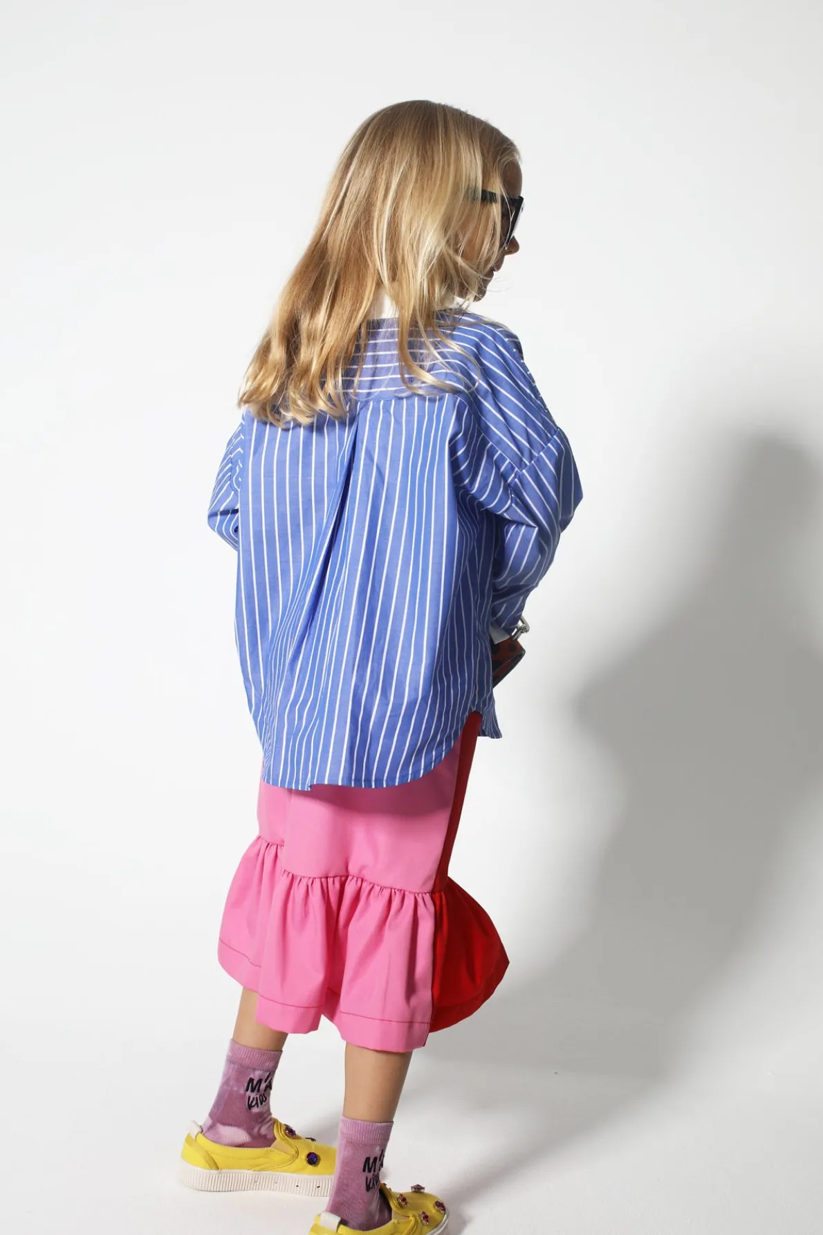 This comfy kid-sized shirt has blue and white stripes, long sleeves, a white point collar, and fold-up white cuffs. No need to be a grown-up when you're styling in this sweet top!• Blue and white• Stripes• Long sleeves• Front buttons
