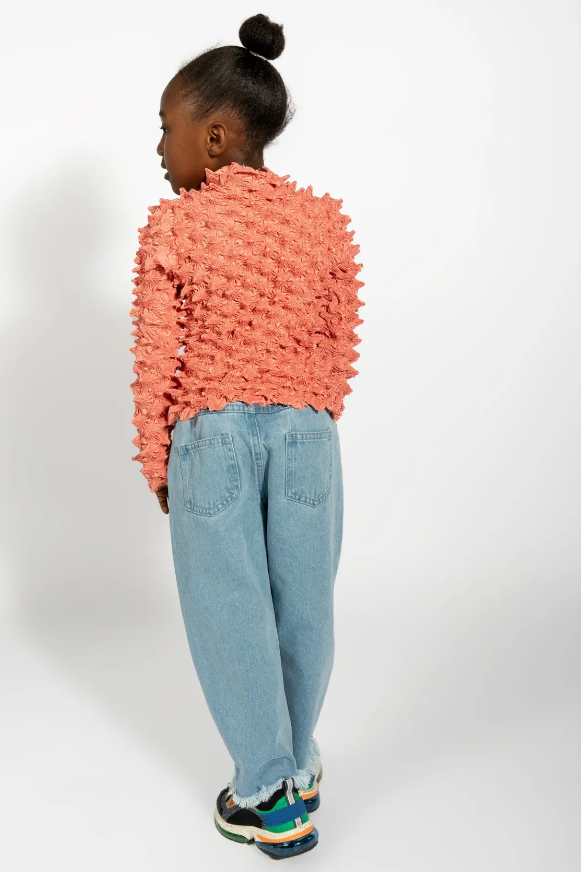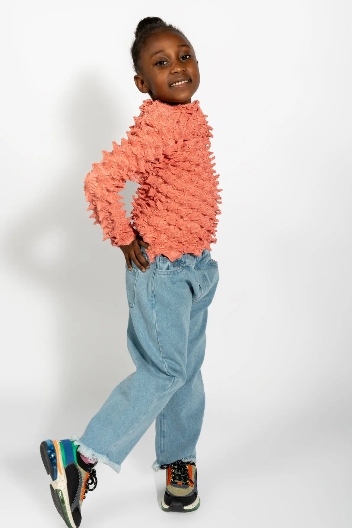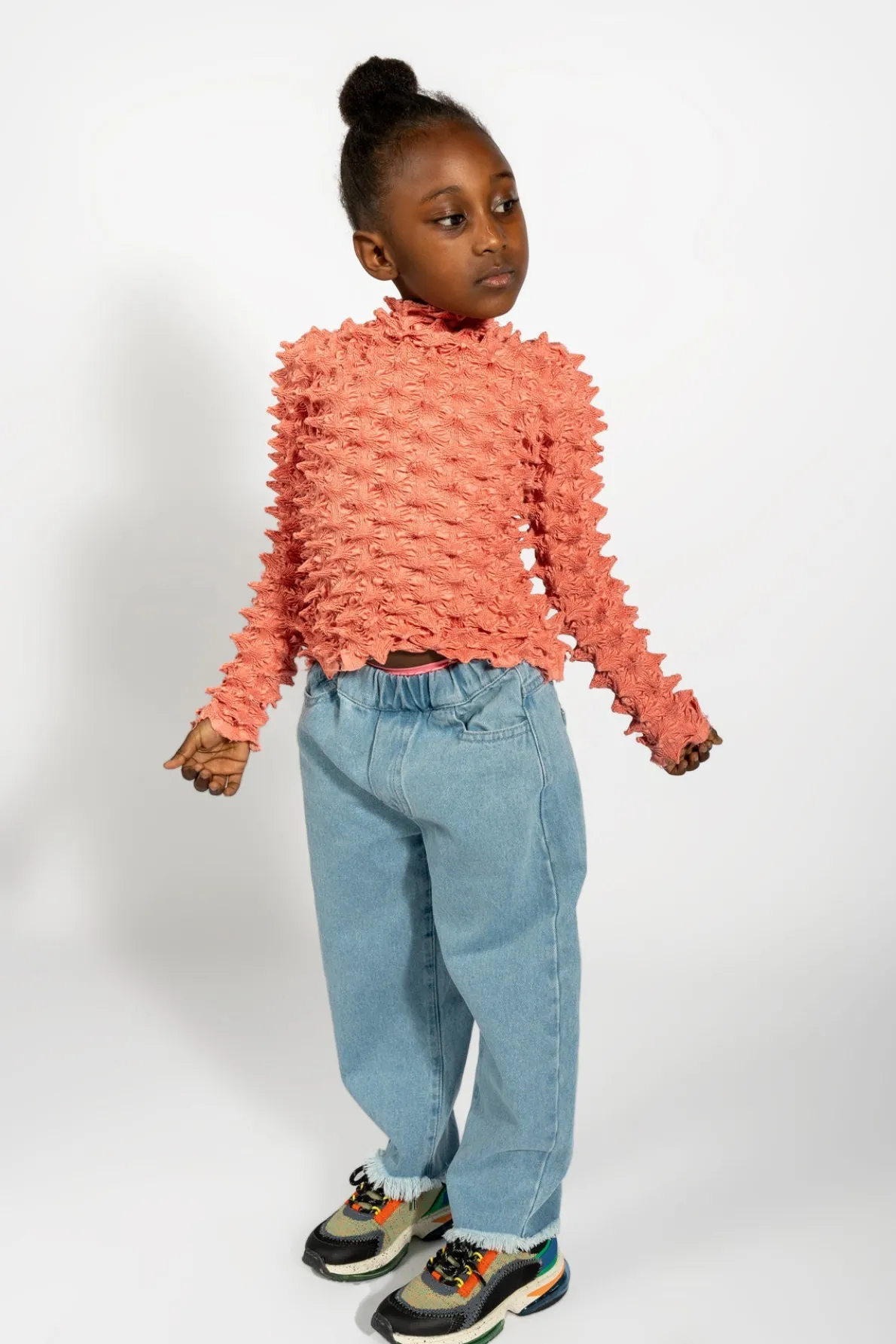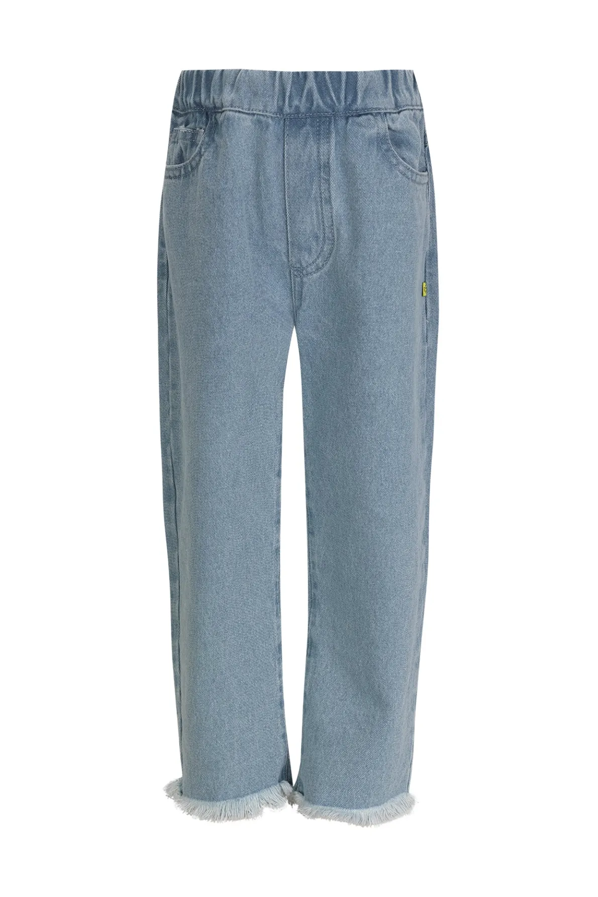 Denim 5 pocket baggy jeans with wide leg, elastic waist and raw hem. Fabric: Denim 85% Cotton, 15% Recycled Cotton size and fit: Product in pictures is size 5 years