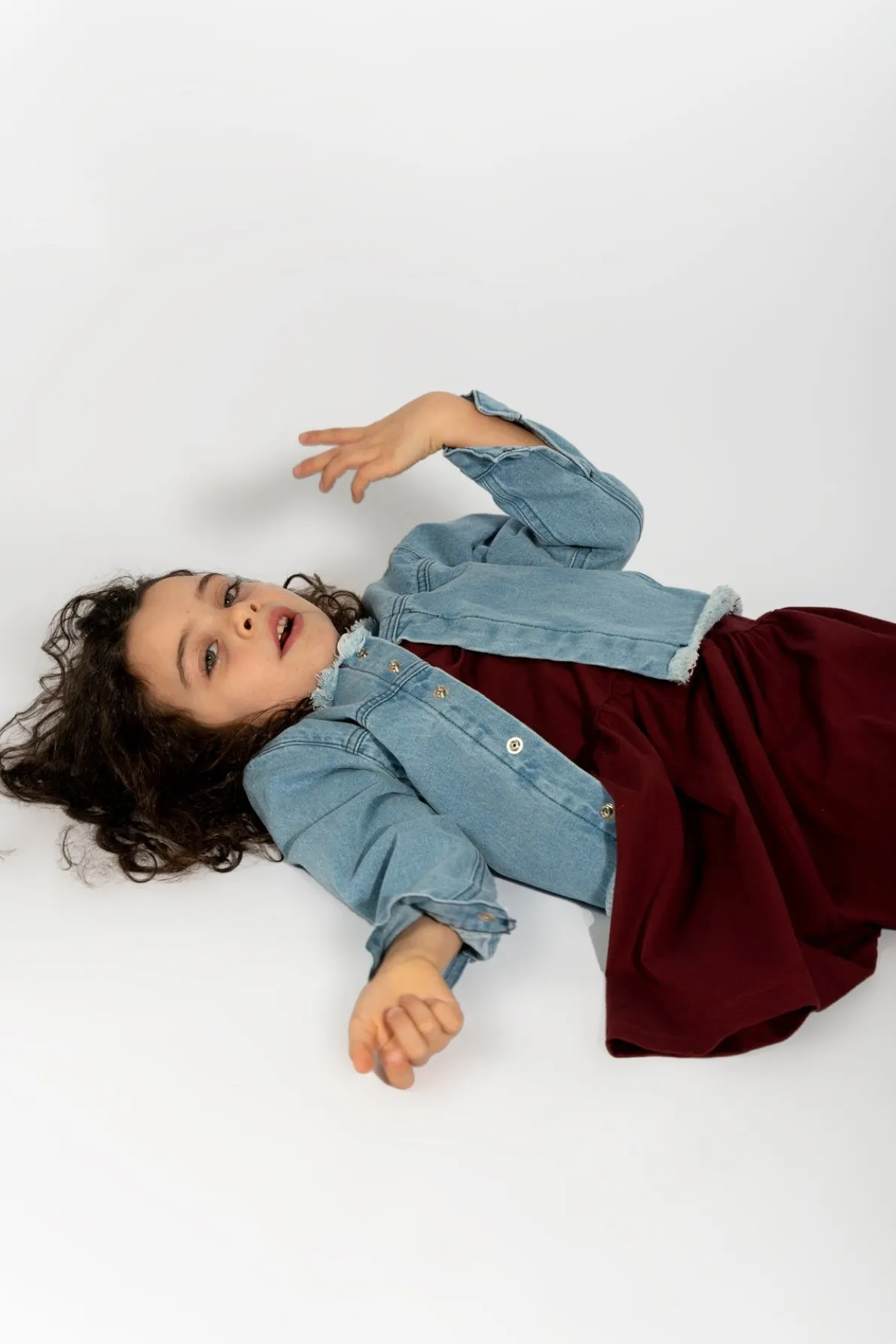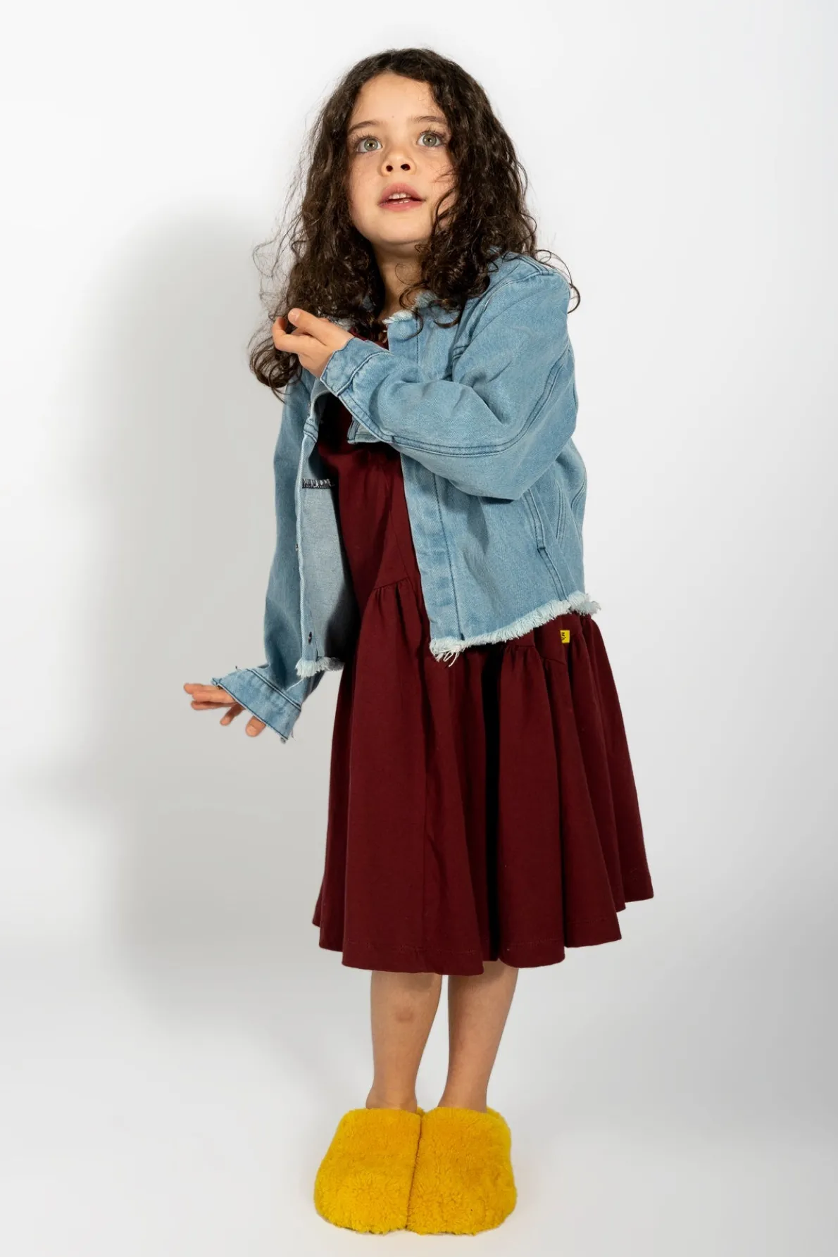 Loose collarless denim jacket with raw frayed hem and fitted sleeves with structured cuffs. Fabric: Denim 85% Cotton, 15% Recycled Cotton size and fit: Product in pictures is size 5 years