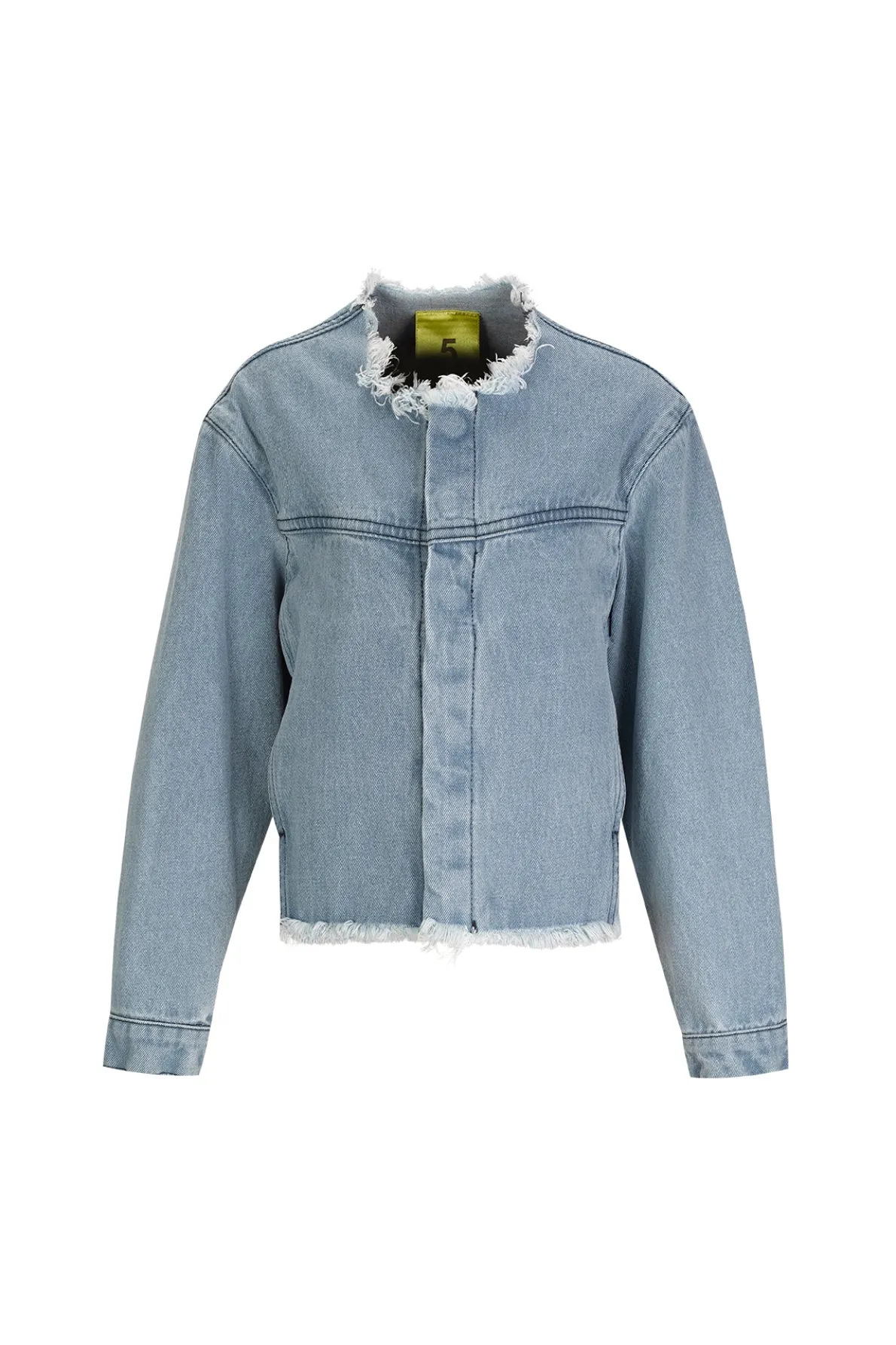 Refresh your wardrobe with this loose collarless denim jacket, complete with raw frayed hem, curved sleeves, and tailored cuffs.• Blue• Loose• Collarless• Curved sleeves