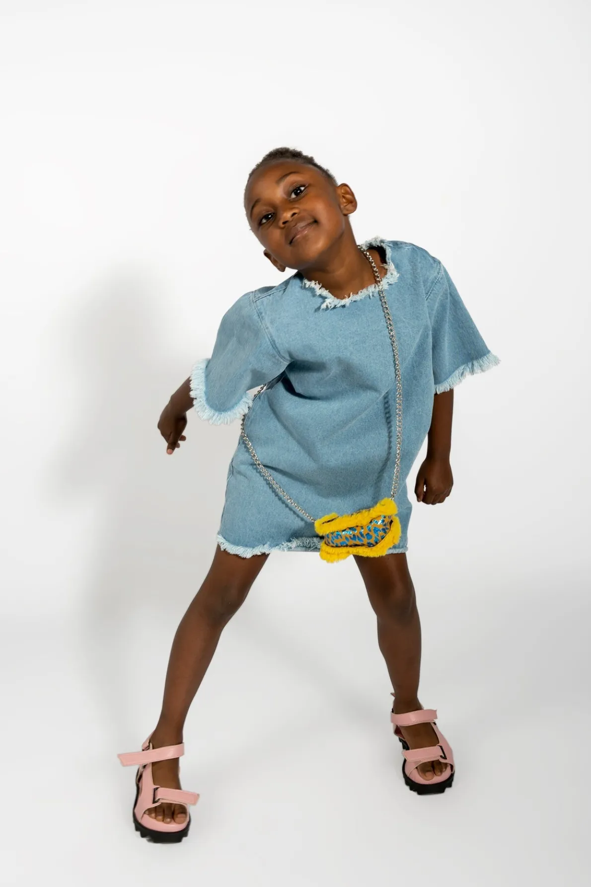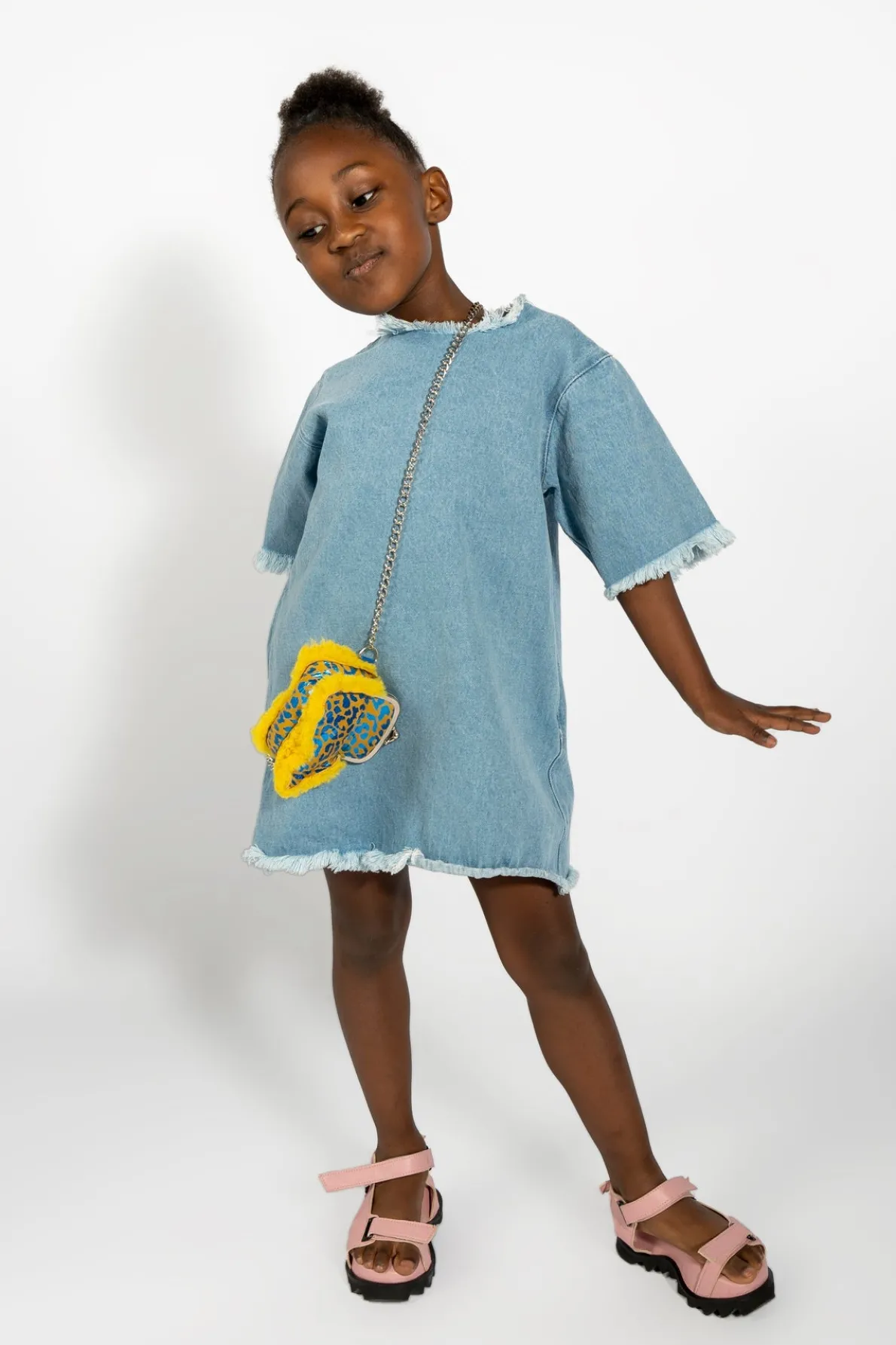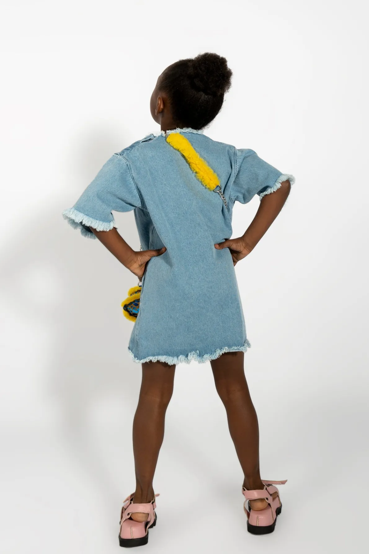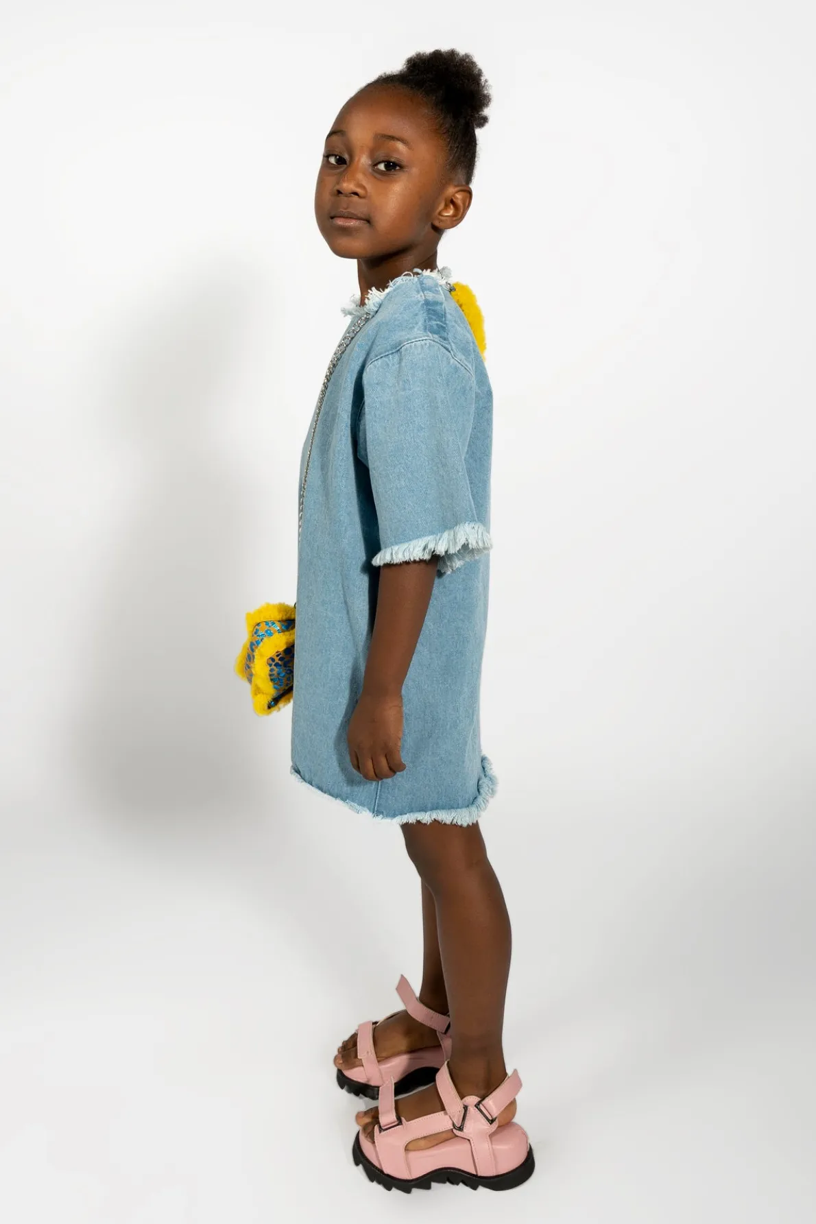 Signature M'A T-shirt dress in denim with frayed edges and side collar opening. Fabric: Denim 85% Cotton, 15% Recycled Cotton size and fit: Product in pictures is size 5 years