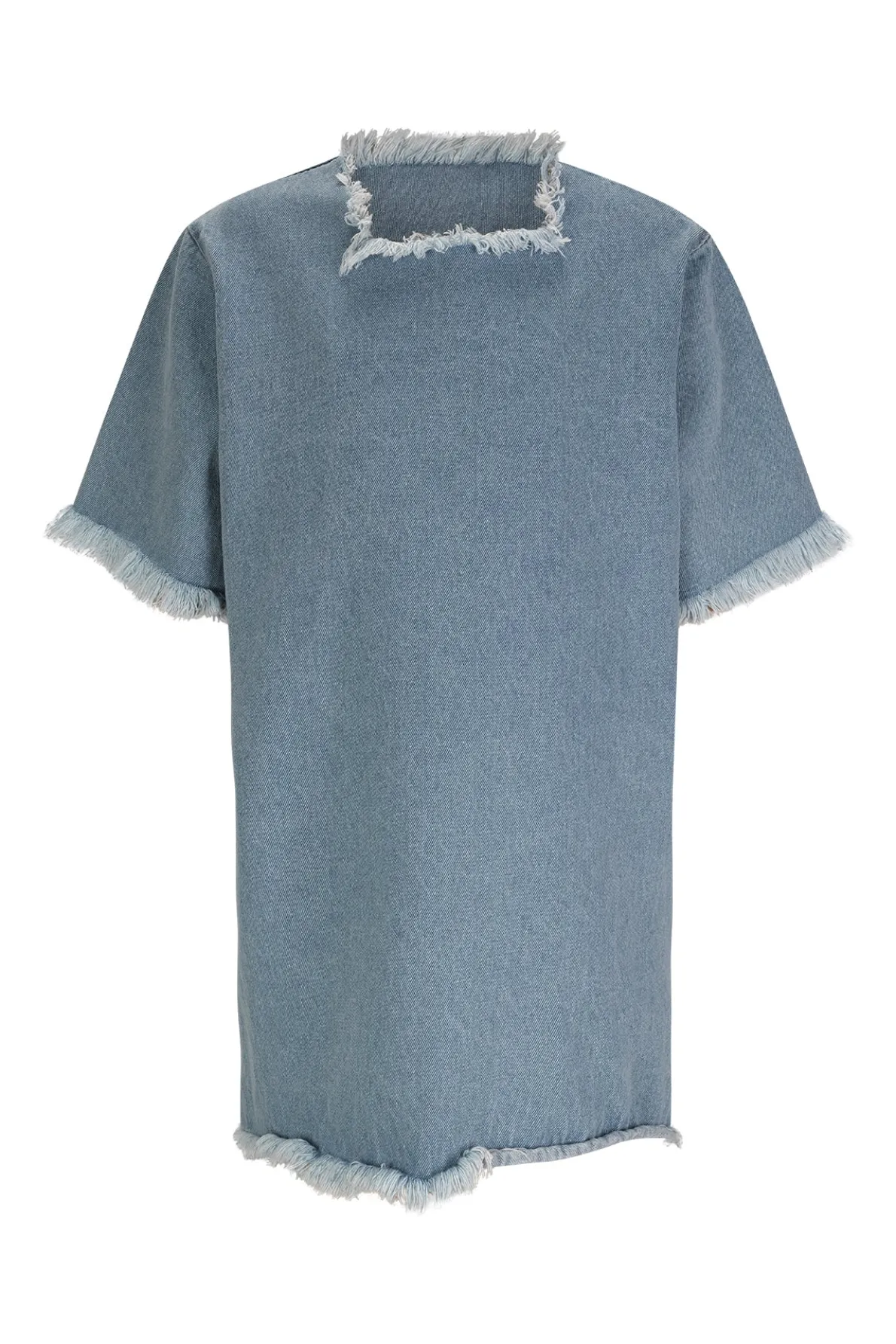 Our signature M'A t-shirt dress with its frayed edges is a perfect addition to your wardrobe in a timeless blue denim.• Blue• Oversized• Frayed hem• Short sleeves