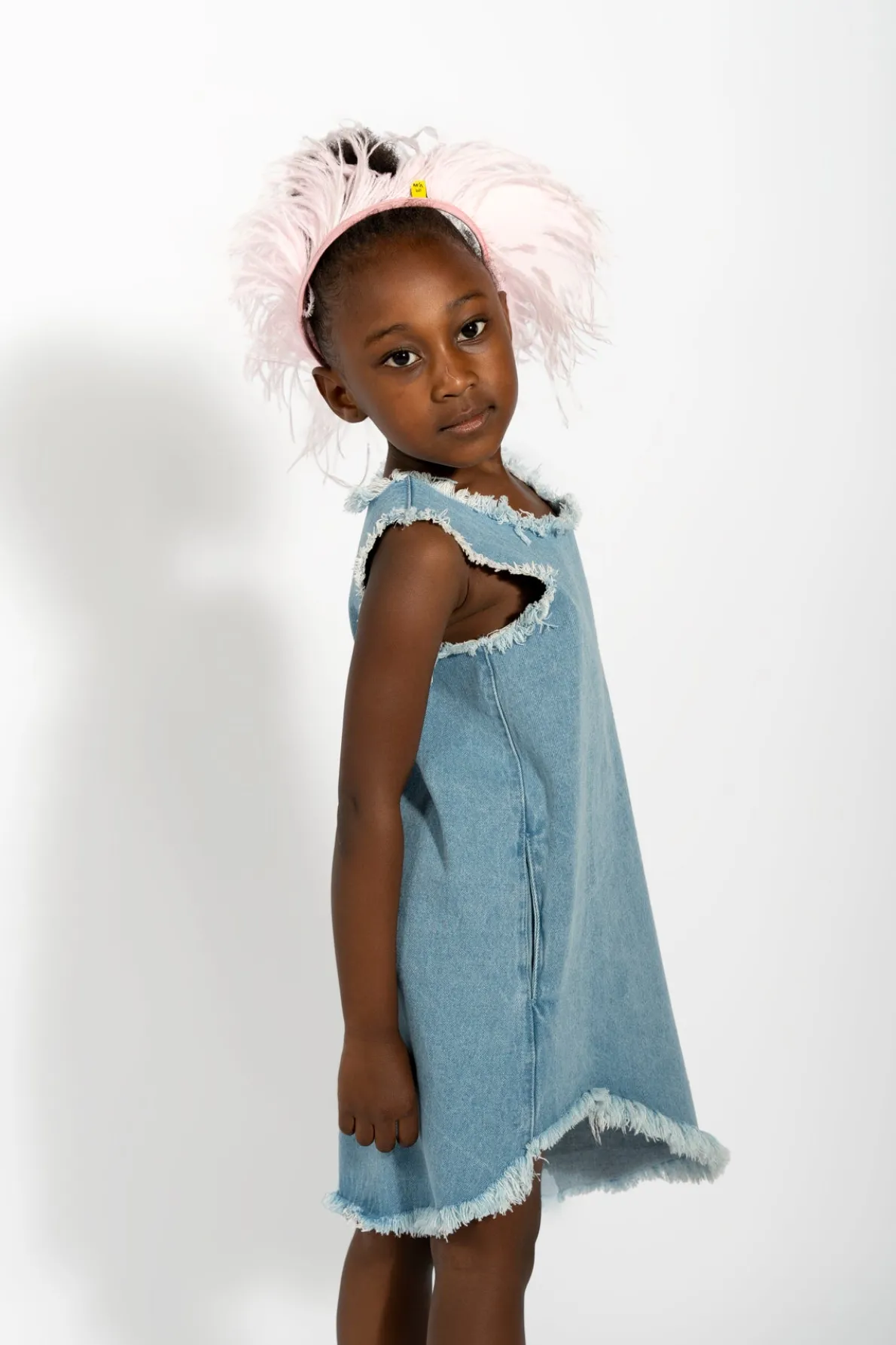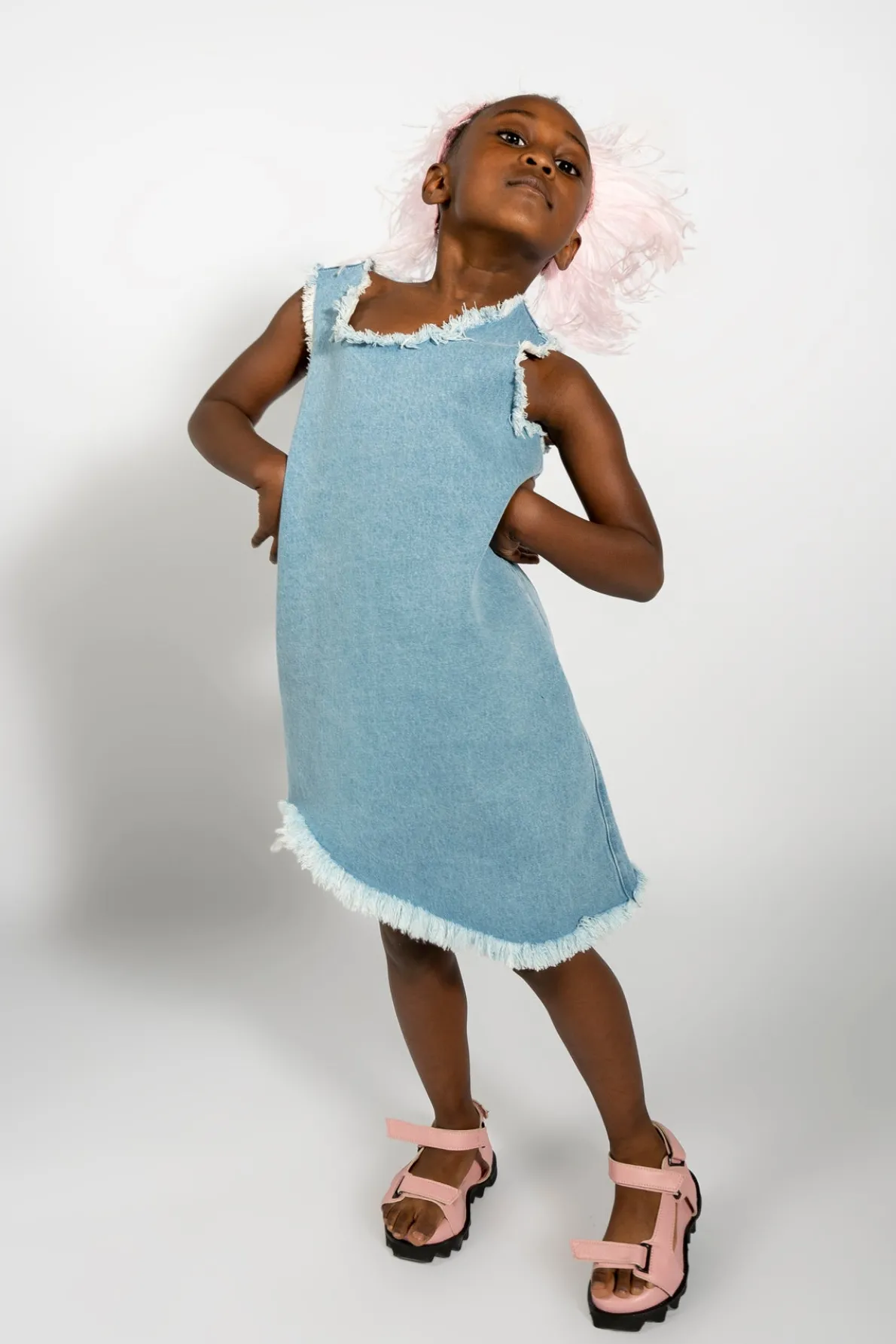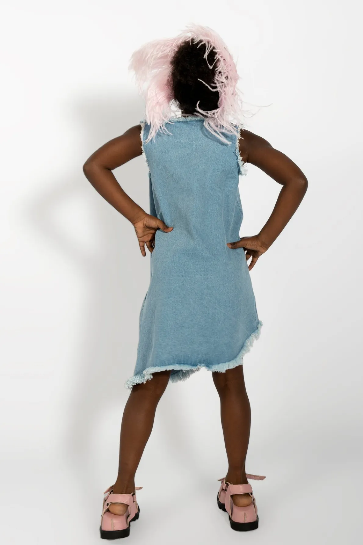 Denim sleeveless dress with an asymmetric and frayed hem, round collar and short length. Fabric: Denim 85% Cotton, 15% Recycled Cotton size and fit: Product in pictures is size 5 years