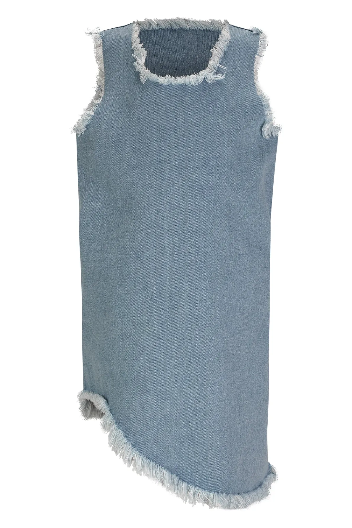 This denim sleeveless dress stuns with its round collar, asymmetric hem and edgy fraying, all expertly crafted into a petite silhouette.• Blue• Sleeveless• Asymmetric• Frayed hem