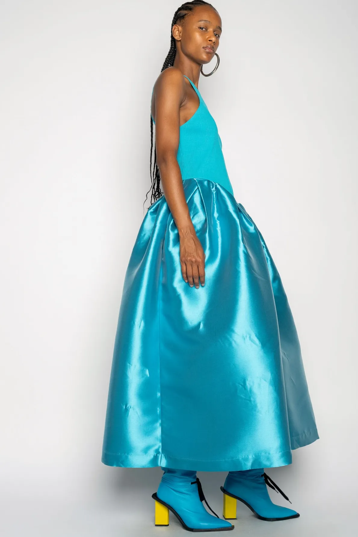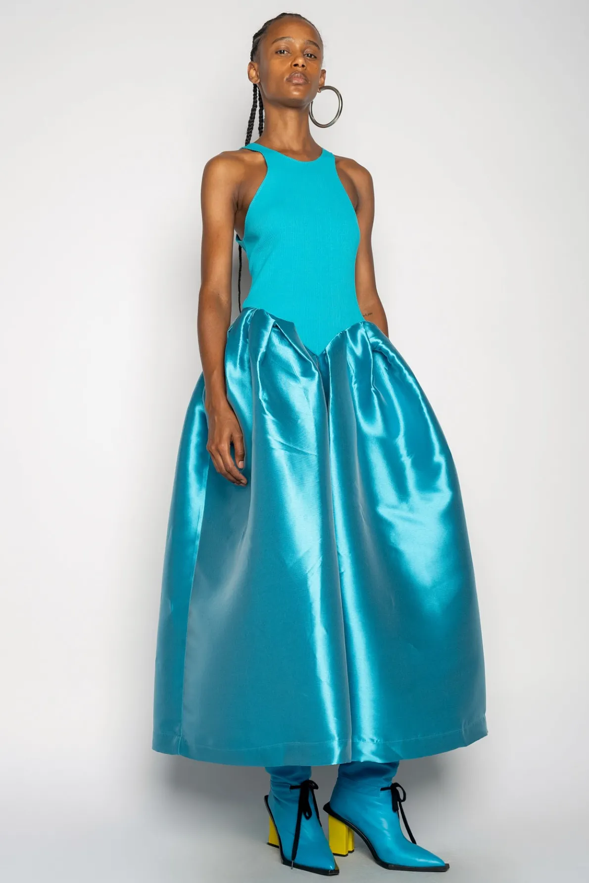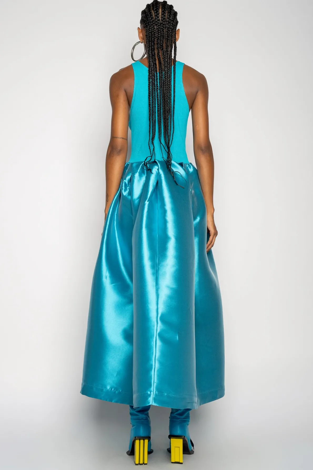 Description: Long dress with a turquoise fitted tank top in rib jersey and turquoise puff long skirt. Fabric: Rib Jersey Rib: 97% Organic Cotton, 3% Elastane / Fabric: 85% Recycled Polyester, 15% Silk Made with organic cotton, recycled polyester and silk size and fit: Fitted Gabriela is 5ft10 / 1.78 cm and is