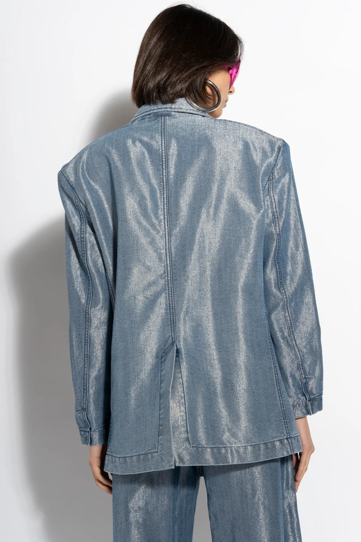 This oversized blazer flares up with blue luscious lurex denim, silver buttons cascading down the front, and two pockets to each side – a stylish addition to any wardrobe!• Blue• Silver buttons• Front pockets• Shiny