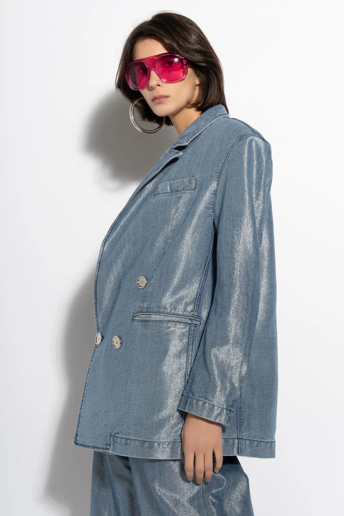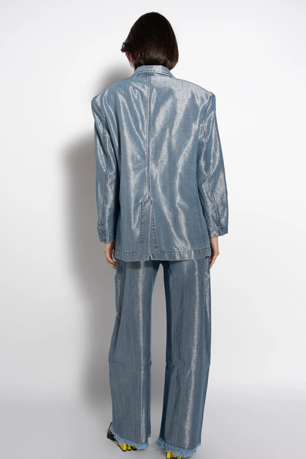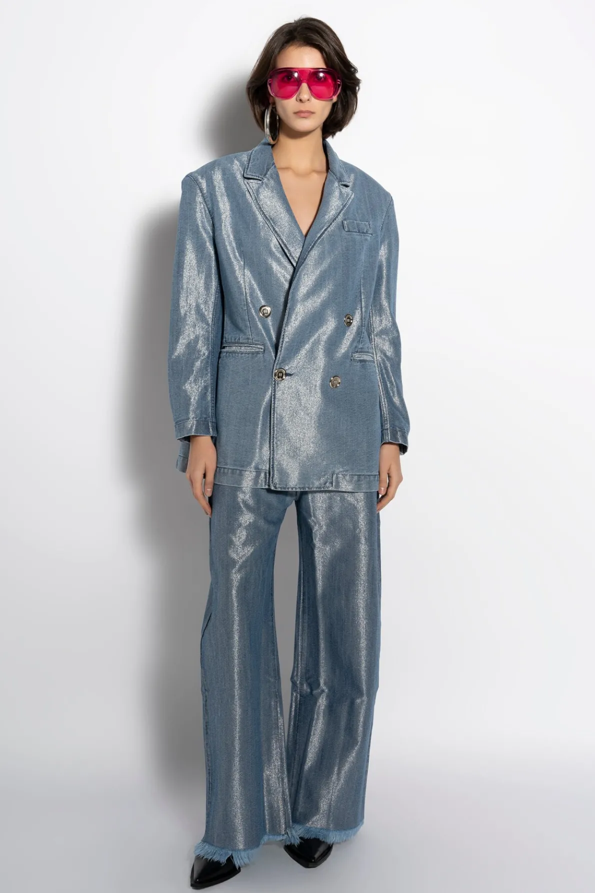 Description: This oversized blazer flares up with blue luscious lurex denim, silver buttons cascading down the front, and two pockets to each side – a stylish addition to any wardrobe! Fabric: Lurex Denim 70% Cotton, 20% Rayon, 10%Polyester size and fit: Oversized Gabriela is 5ft10 / 1.78 cm and is wearing a size S