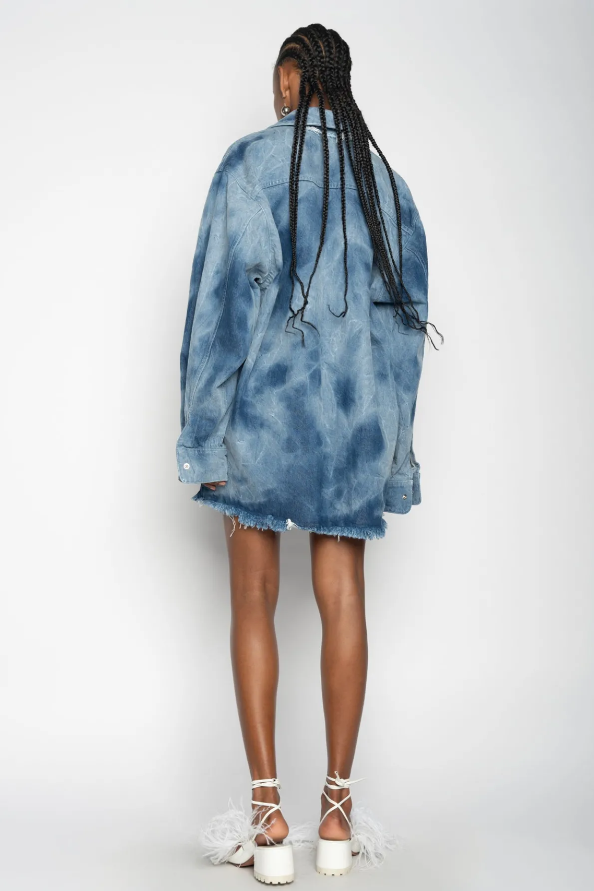 This oversized classic shirt radiates coolness with its blue tie dye denim and signature front buttons! Its stylish design makes it a wardrobe essential!• Blue• Tie dye • Front buttons• Raw hem