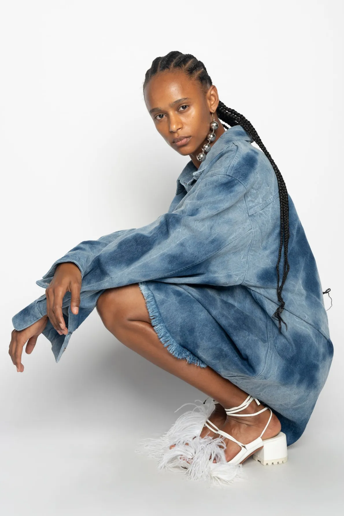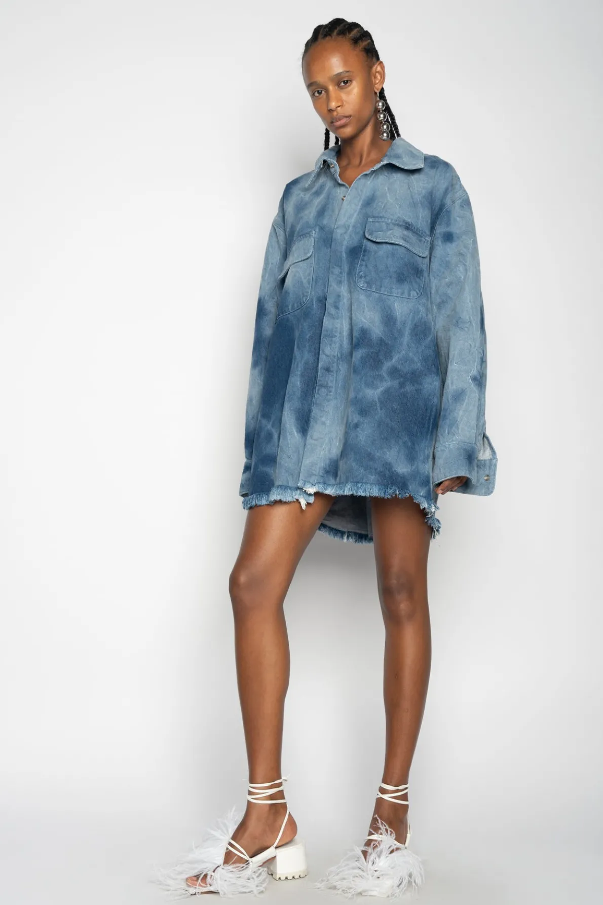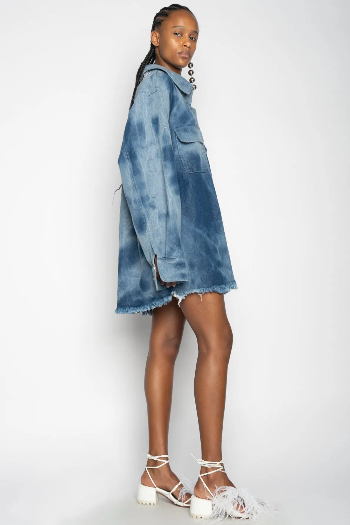 Description: This oversized classic shirt radiates coolness with its blue tie dye denim and signature front buttons! Its stylish design makes it a wardrobe essential! Fabric: DENIM 43% Refibra / 40% recycled cotton / 17% organic cotton Made with recycled cotton and dyed using water responsibly size and fit: OVE