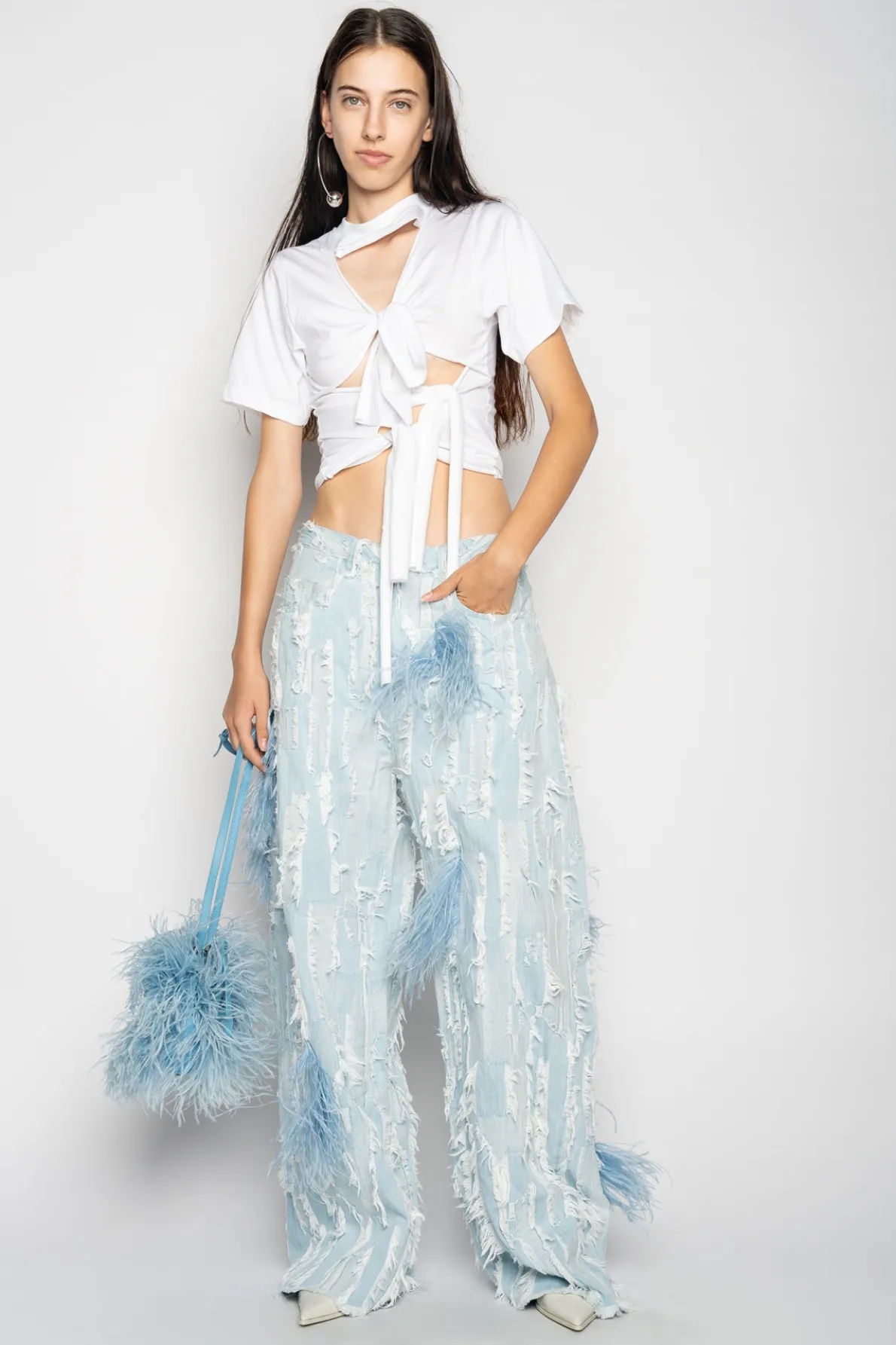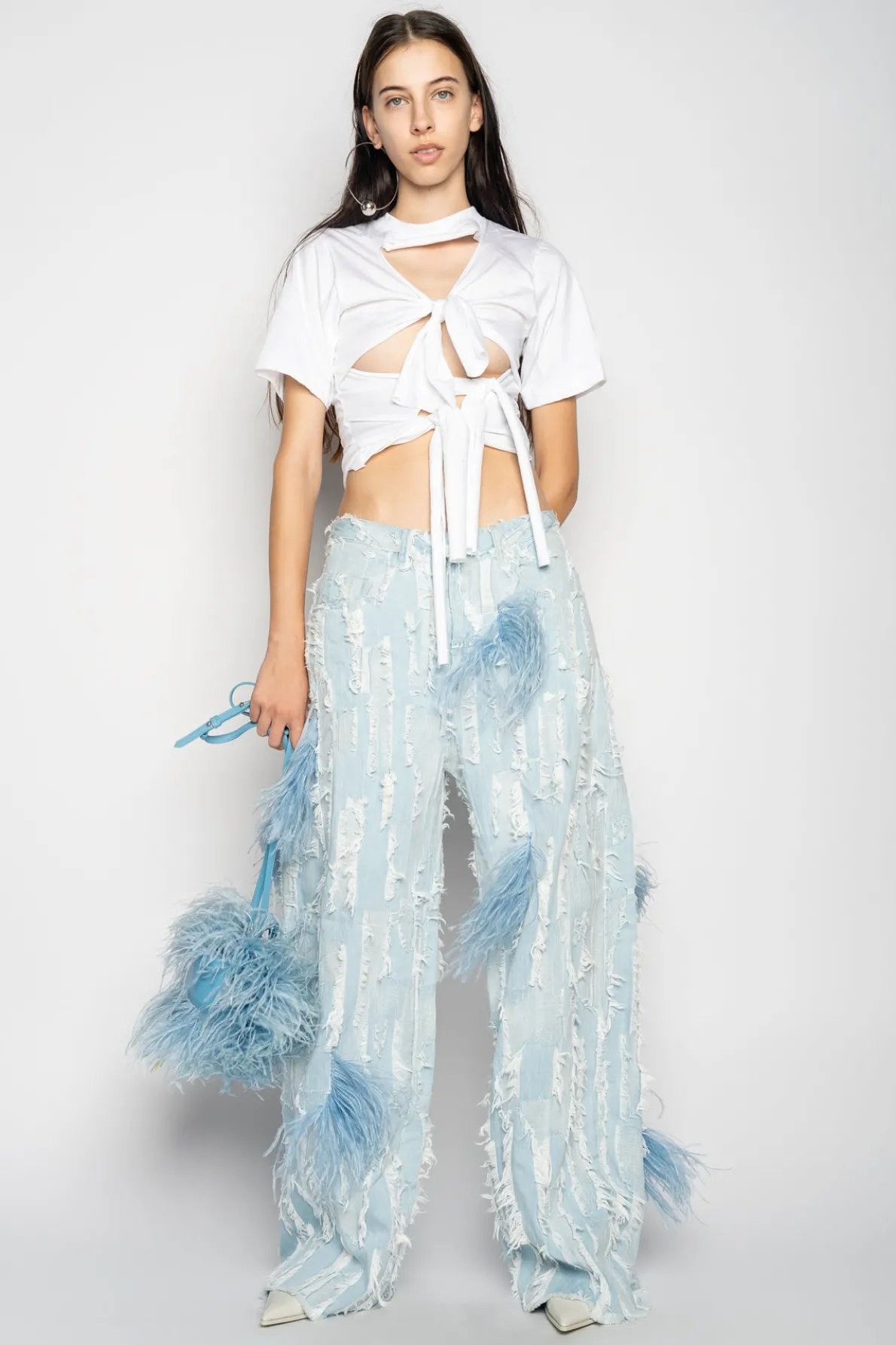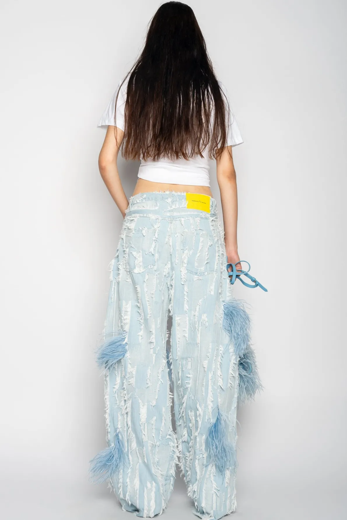 Description: Sporting classic M'A 5-pocket style, these boyfriend jeans exude street-savvy style with their shredded light blue denim and light blue feather accents. The raw hem wide-leg design ensures a relaxed fit and dropped waist with a hint of rise. Fabric: Shredded Denim 71% COTTON 29% POLYESTER size and fit