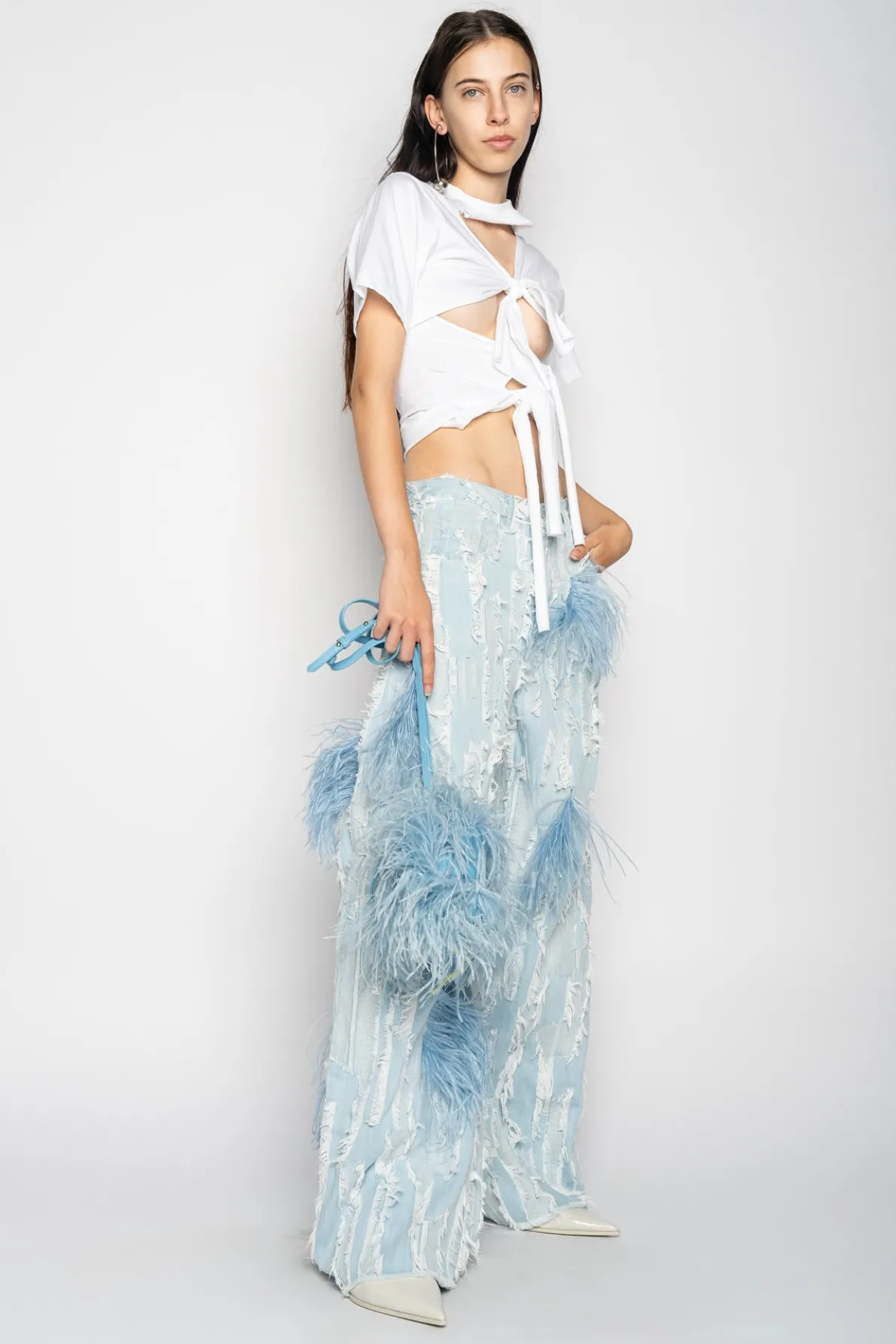 Sporting classic M'A 5-pocket style, these boyfriend jeans exude street-savvy style with their shredded light blue denim and light blue feather accents. The raw hem wide-leg design ensures a relaxed fit and dropped waist with a hint of rise.• Light blue• Shredded• Feathers• Wide leg