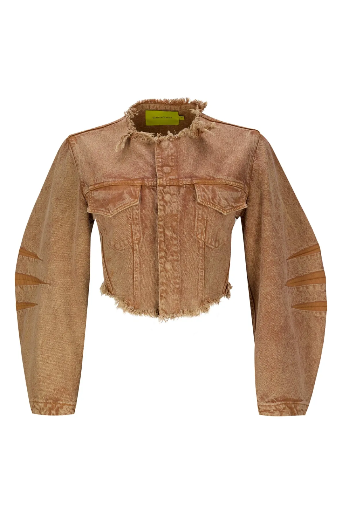 Rock this chic round-sleeved cropped jacket made of brown drill fabric! Boasting raw hems, snap buttons, and a round neckline, you'll make a stylish statement wherever you go.• Cropped• Round sleeves• Front snap buttons• Raw hem