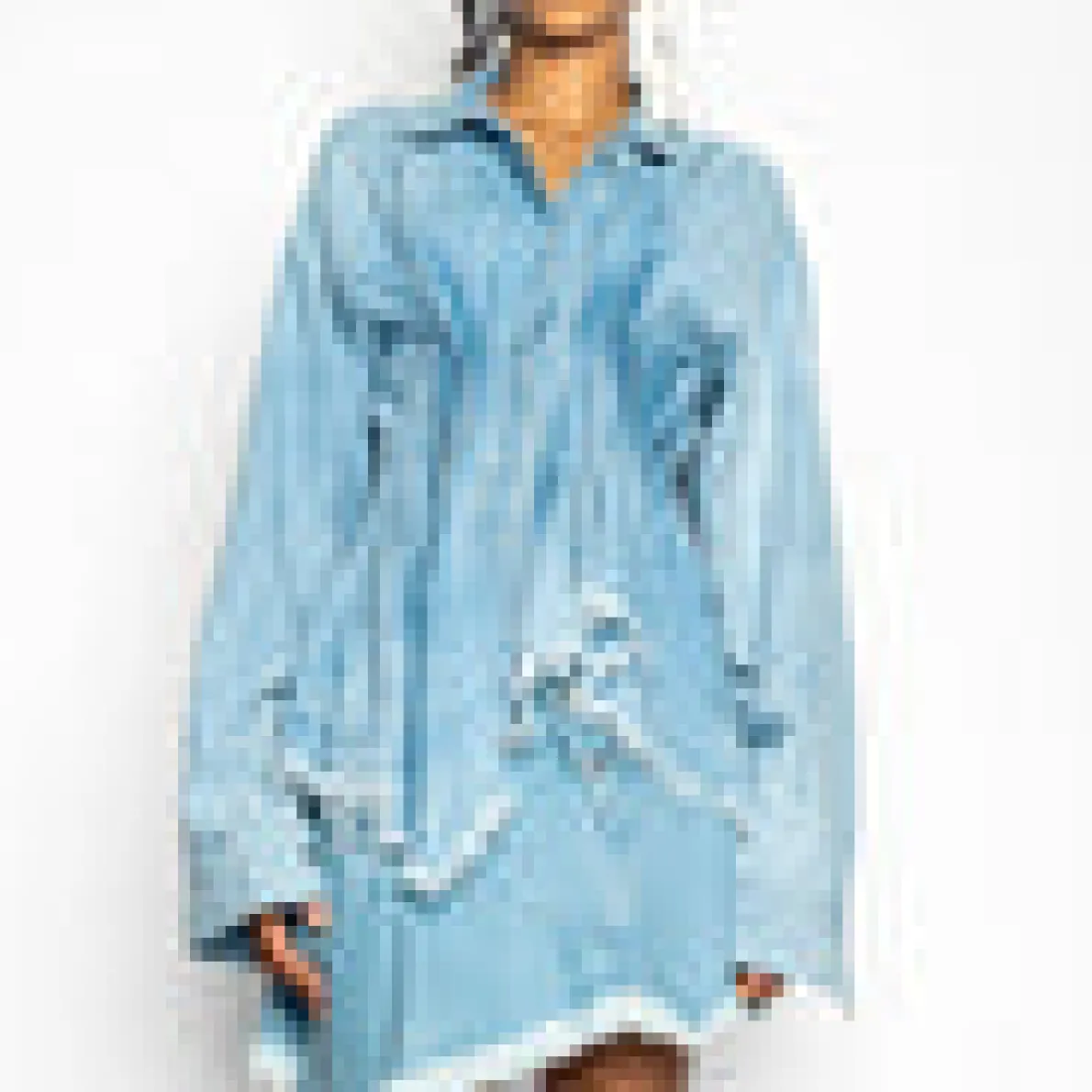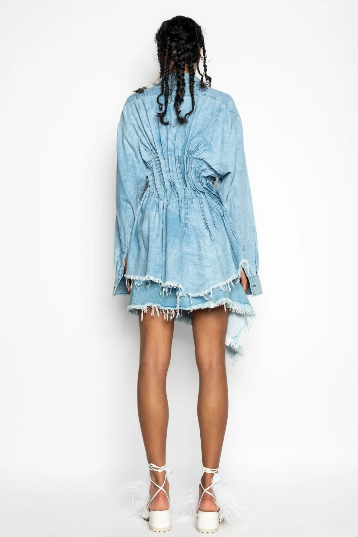 Light blue chambray shirt boasting a cinched pleated waist for a fitted silhouette, asymmetric hemline, and long sleeves with oversized cuffs• Cinched waist• Fitted• Asymmetric hem• Long sleeves