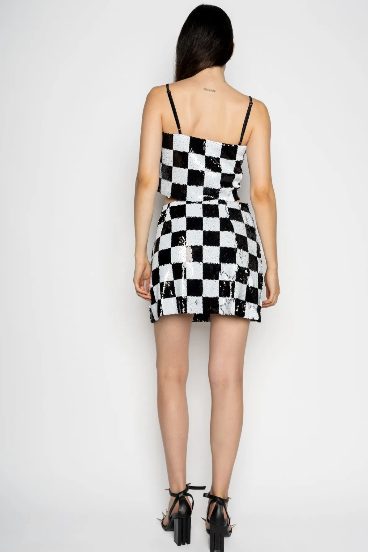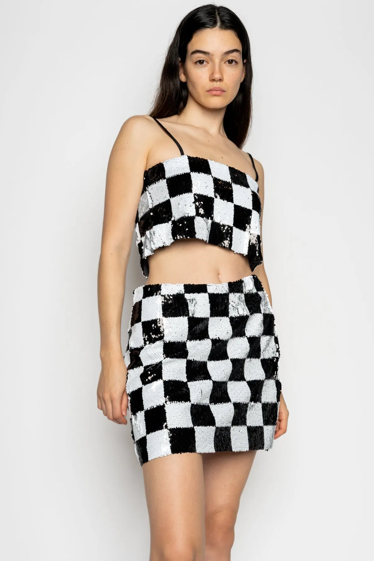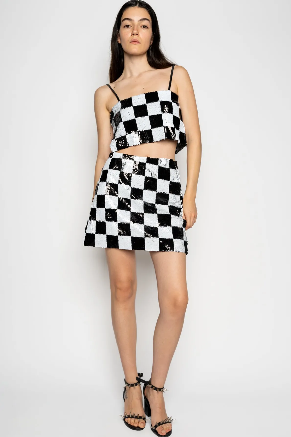 This classic mini skirt is crafted with a black and white check sequin design and a side zip fastening.• Checked sequins• Mini• Side zip fastening• A-line