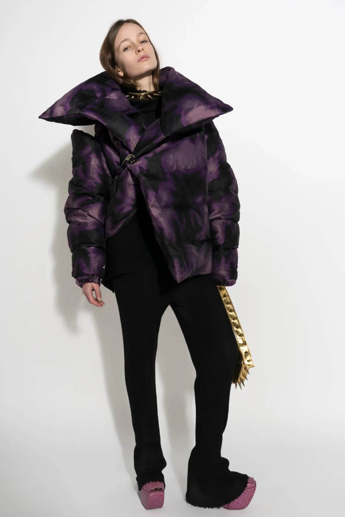 Elevate your style with this remarkable Classic M'A asymmetric duvet puffa jacket in a purple tie-dye brocade. Flaunt the pointed open collar and silver safety pin closure, while the asymmetrical hem adds a one-of-a-kind feel. Make a statement with the opening on the left shoulder.• Puffa Style• Asymmetric silhouette• Side shoulder opening• Silver safety pin closure