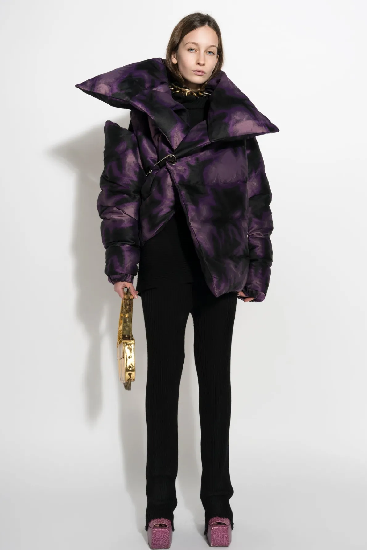 Description: Elevate your style with this remarkable Classic M'A asymmetric duvet puffa jacket in a purple tie-dye brocade. Flaunt the pointed open collar and silver safety pin closure, while the asymmetrical hem adds a one-of-a-kind feel. Make a statement with the opening on the left shoulder. Fabric: Main: 100% Pol