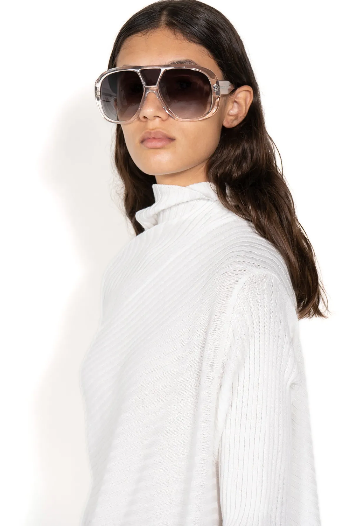 Be stylish as you enjoy the sun with these sophisticated aviator sunglasses featuring clear frames and sleek black and clear gradient lenses.• Clear frame• Black lenses• Aviator shape• Silver logo