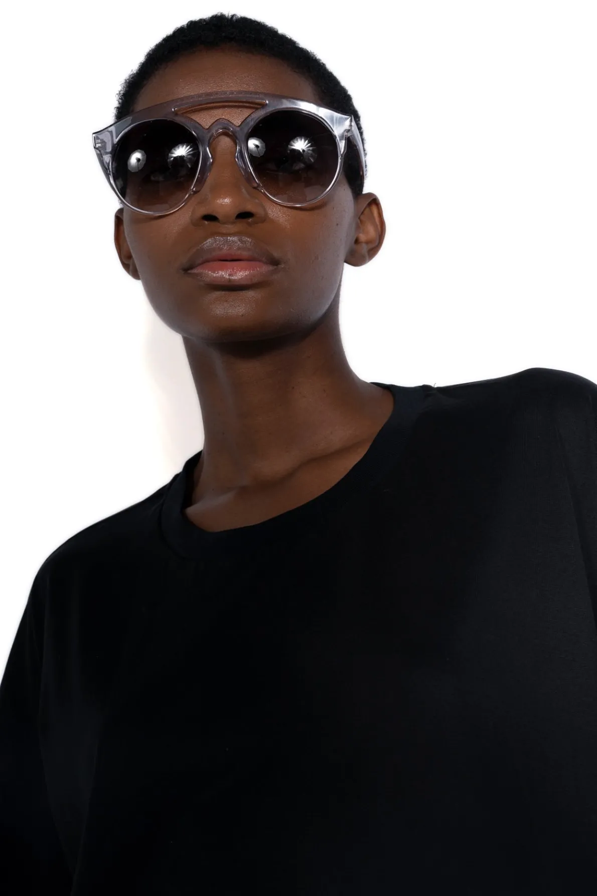 Description: Elevate your style with these bridged sunglasses featuring a sleek clear black frame and jet black lens. Material: 100% Acetate care instructions: – Store in the provided case – Clean with a soft, dry cloth – If needed, use a damp cloth and mild detergent. Do not use solvents (e.g. alcohol, ace