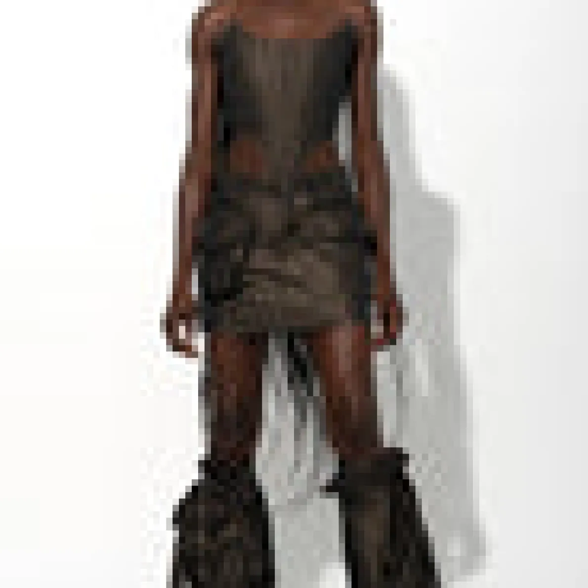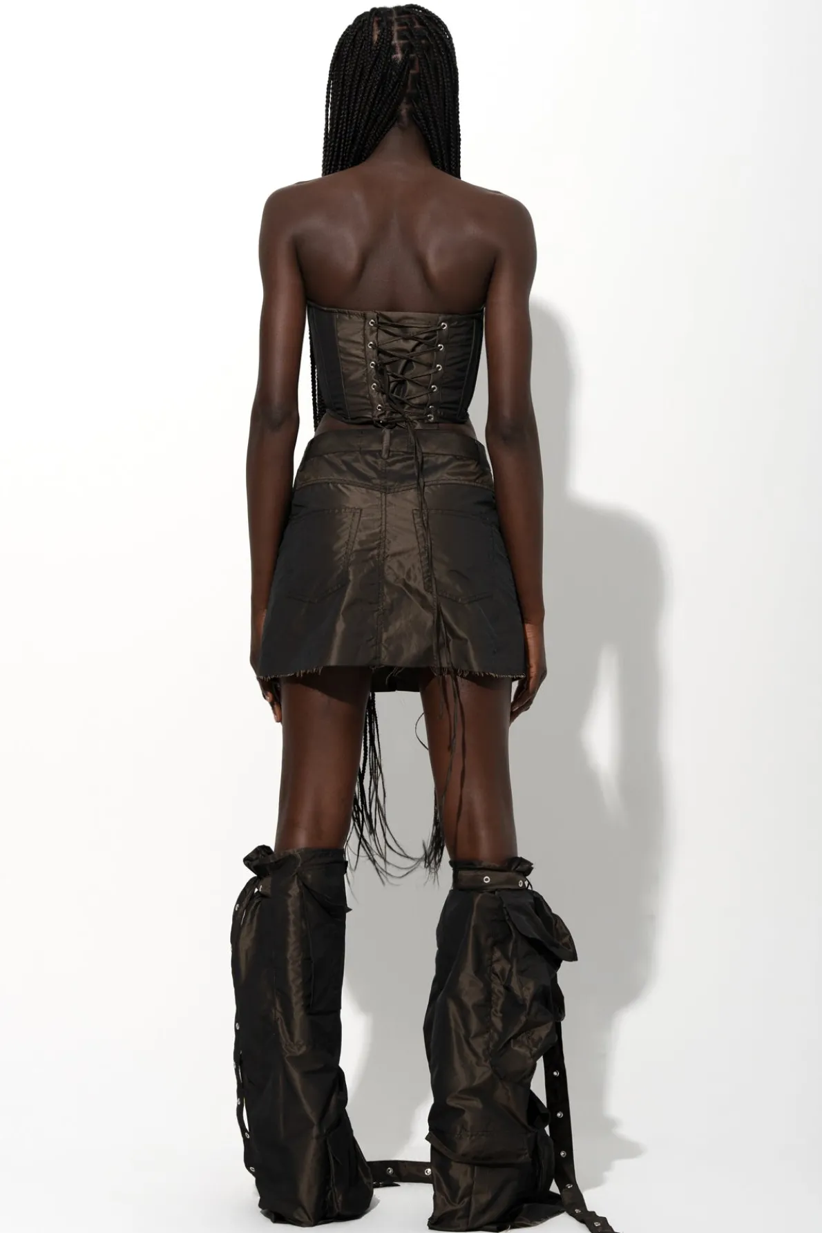 Description: Fitted mini skirt in dark brown taffeta with multi pockets. Fabric: Taffeta 100% Recycled Polyester size and fit: Fitted Angelica is 5ft11 / 1.82 cm and is wearing a size Small (UK8)