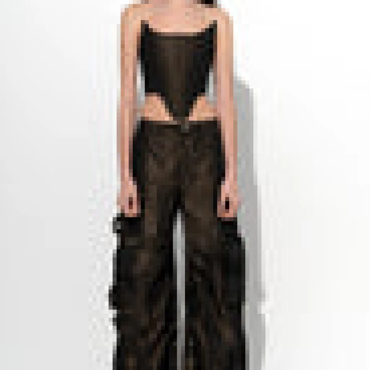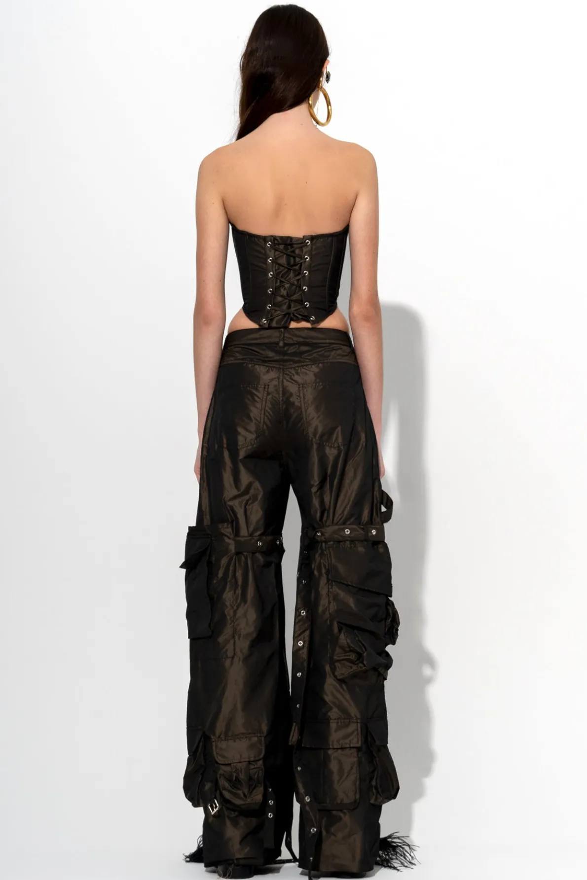 Description: Multipocket boyfriend cargo trousers in dark brown taffeta. These raw hem wide-leg jeans have a relaxed fit with dropped waist and rise. Fabric: Taffeta 100% Recycled Polyester size and fit: Oversized Ariana is 5ft10 / 1.78 cm and is wearing a size Small (UK8)
