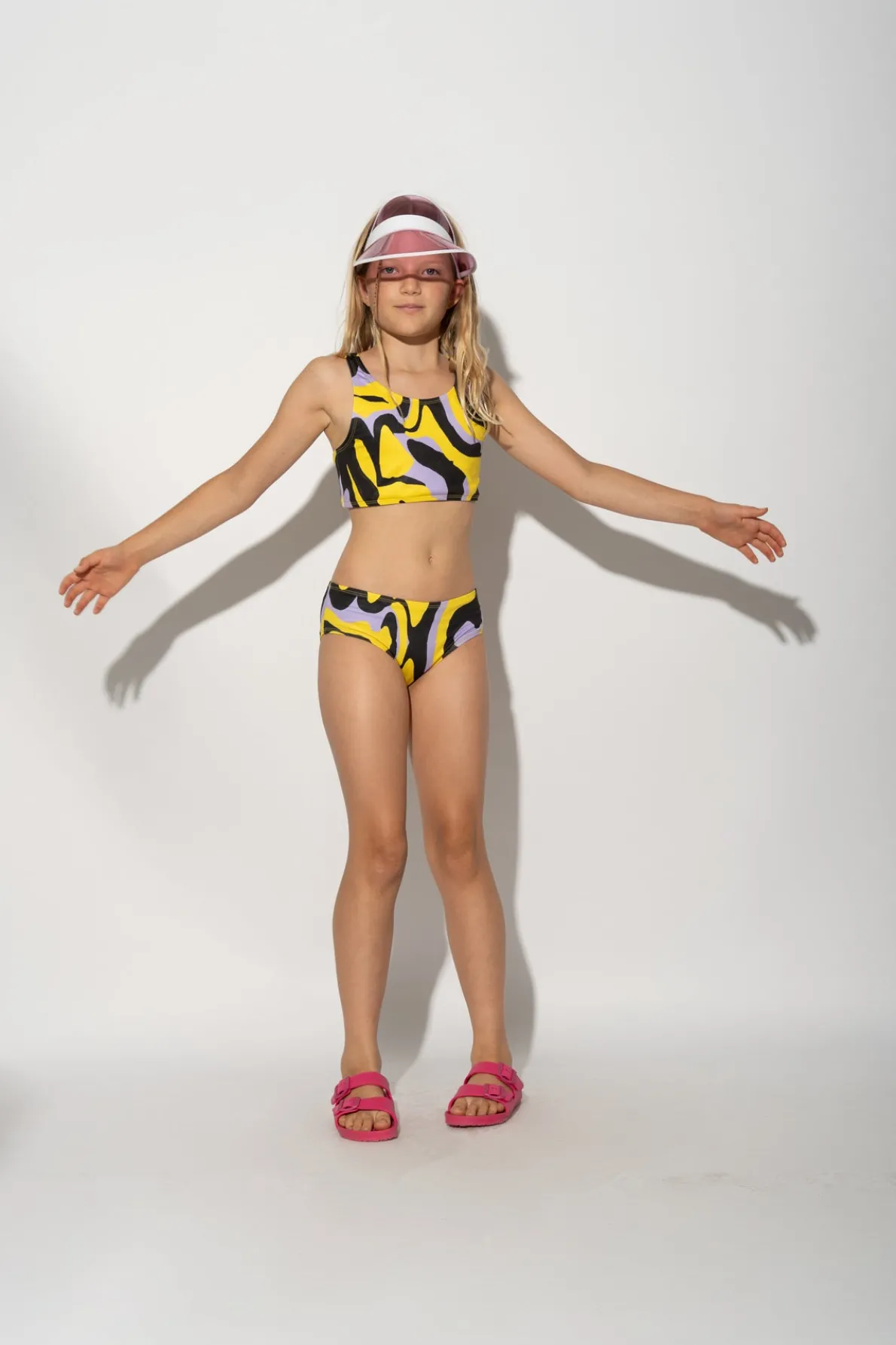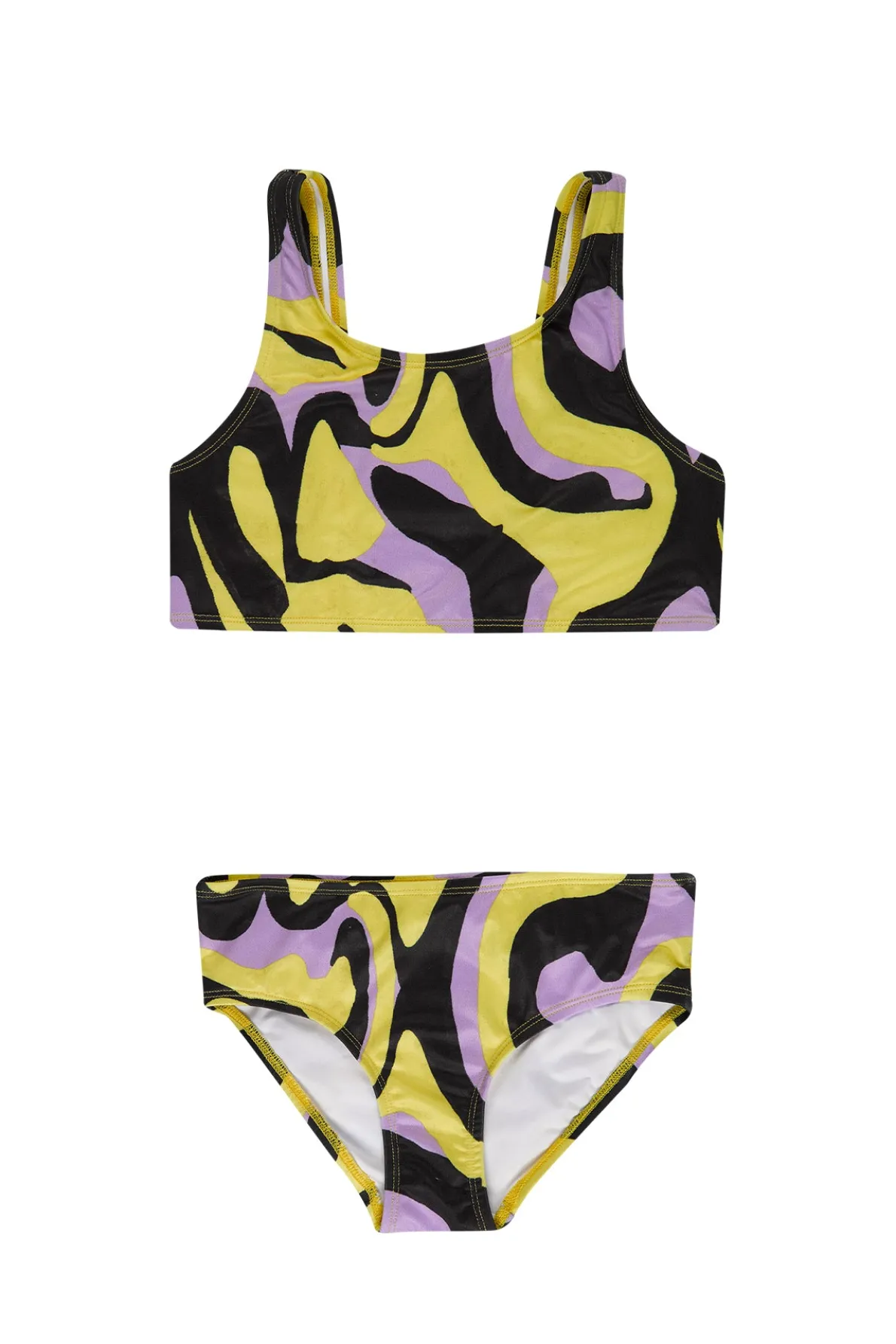 Get ready to dive into summer fun with this playful bikini set! The dark wavy print briefs and strap top, with a unique 'U' neckline, add a touch of quirky charm. And with enough elasticity to make a splash, you'll be the life of the pool party! Enjoy the sweetness of this set while soaking up the sun.• Dark wavy print• Strap top and briefs• Elastic• U neckline