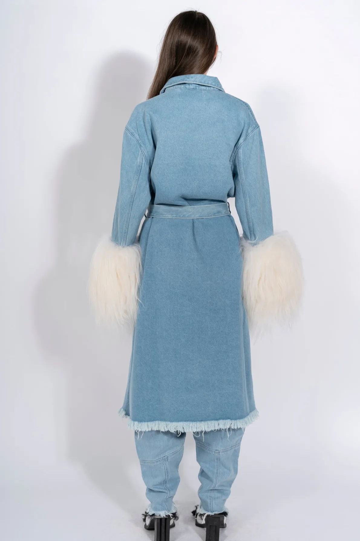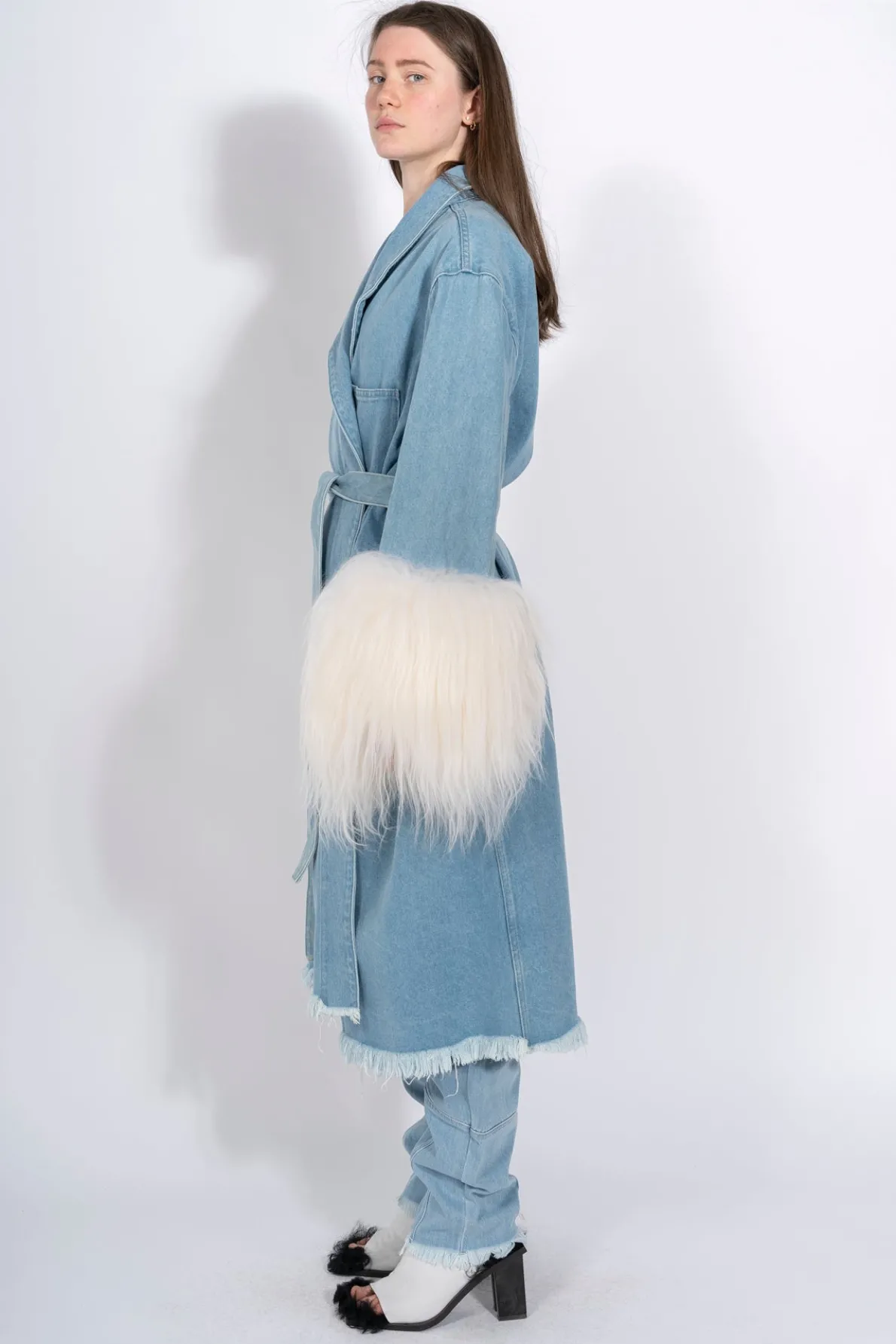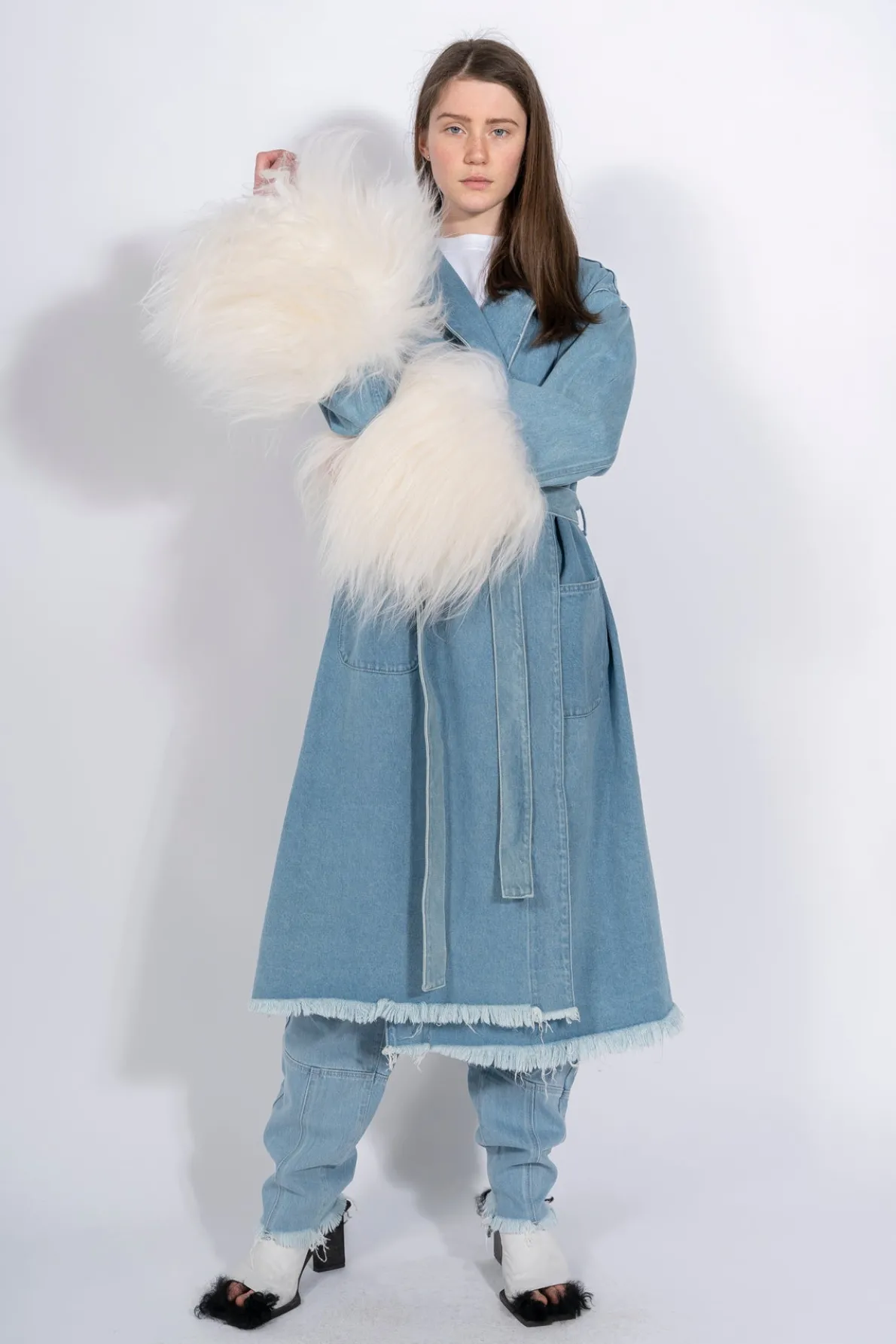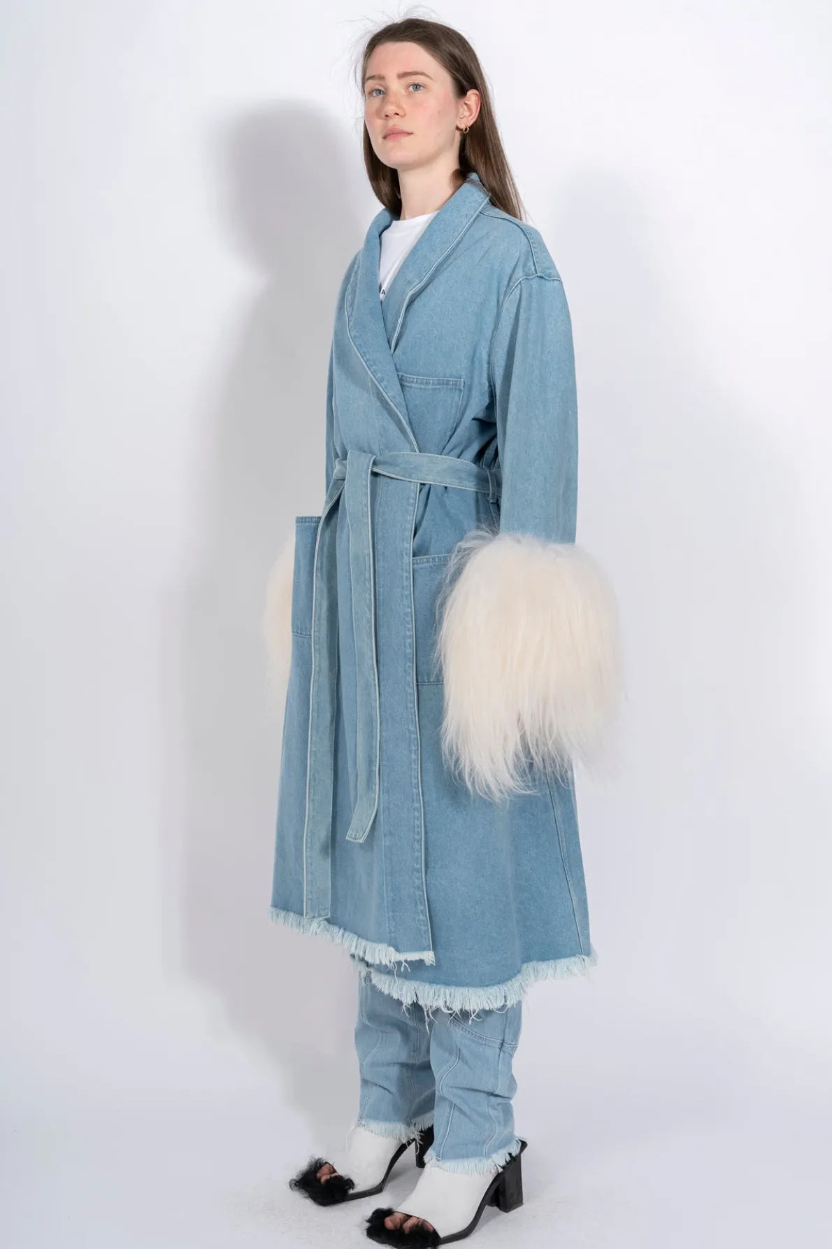 A wardrobe staple made of soft blue denim, this coat brings together classic dressing gown-style with statement removable white shearling cuffs. Wide lapels, a denim belt fastening, plus the signature M'A frayed hem elevate this piece for truly special occasions.• Long coat• Removable shearling cuffs• Waist belt• Raw hem
