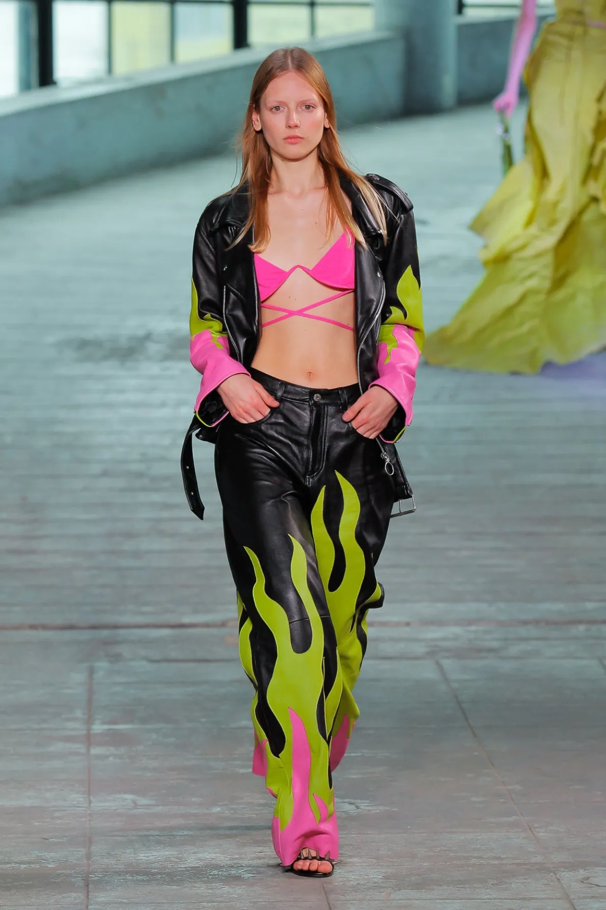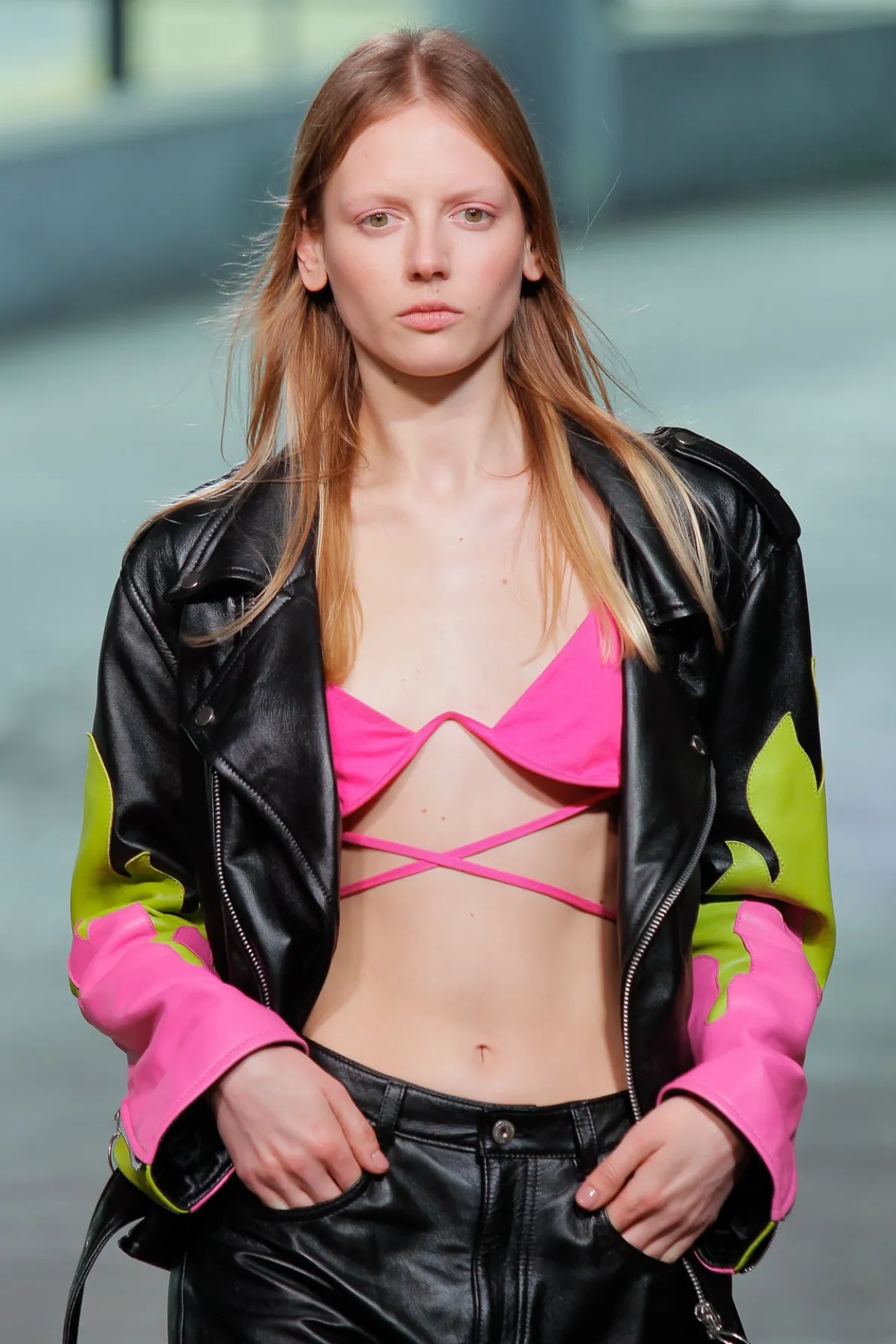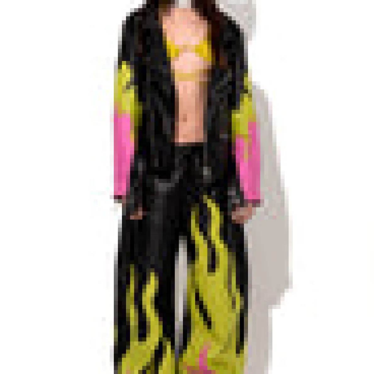 Description: Leather biker jacket with eye-catching flame detail embellishing the sleeves and a belt closure that adds an extra touch of style. This must-have features 3 zip pockets and one flap pocket with snap button closure. Fabric: LEATHER 100% Leather size and fit: Oversized Ariana is 5ft10 / 1.78 cm and is