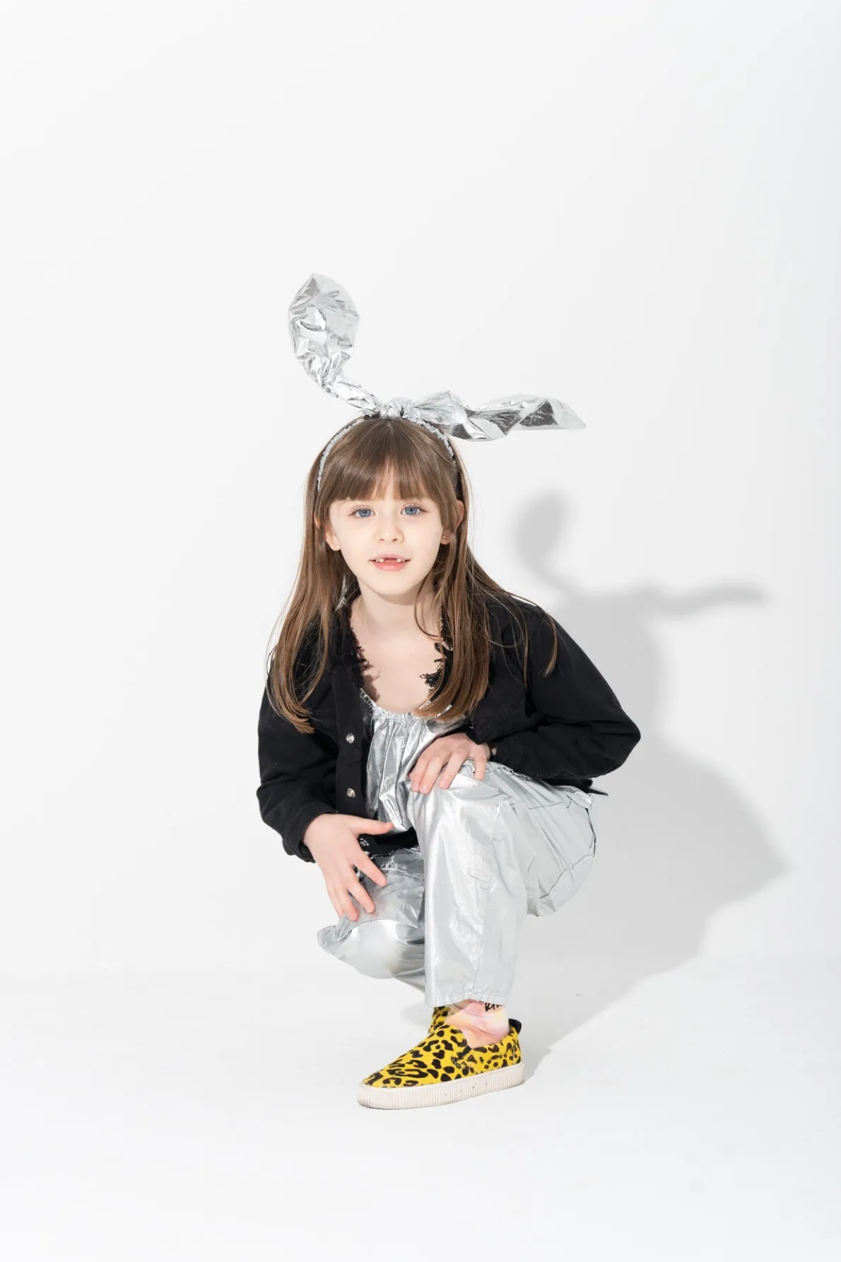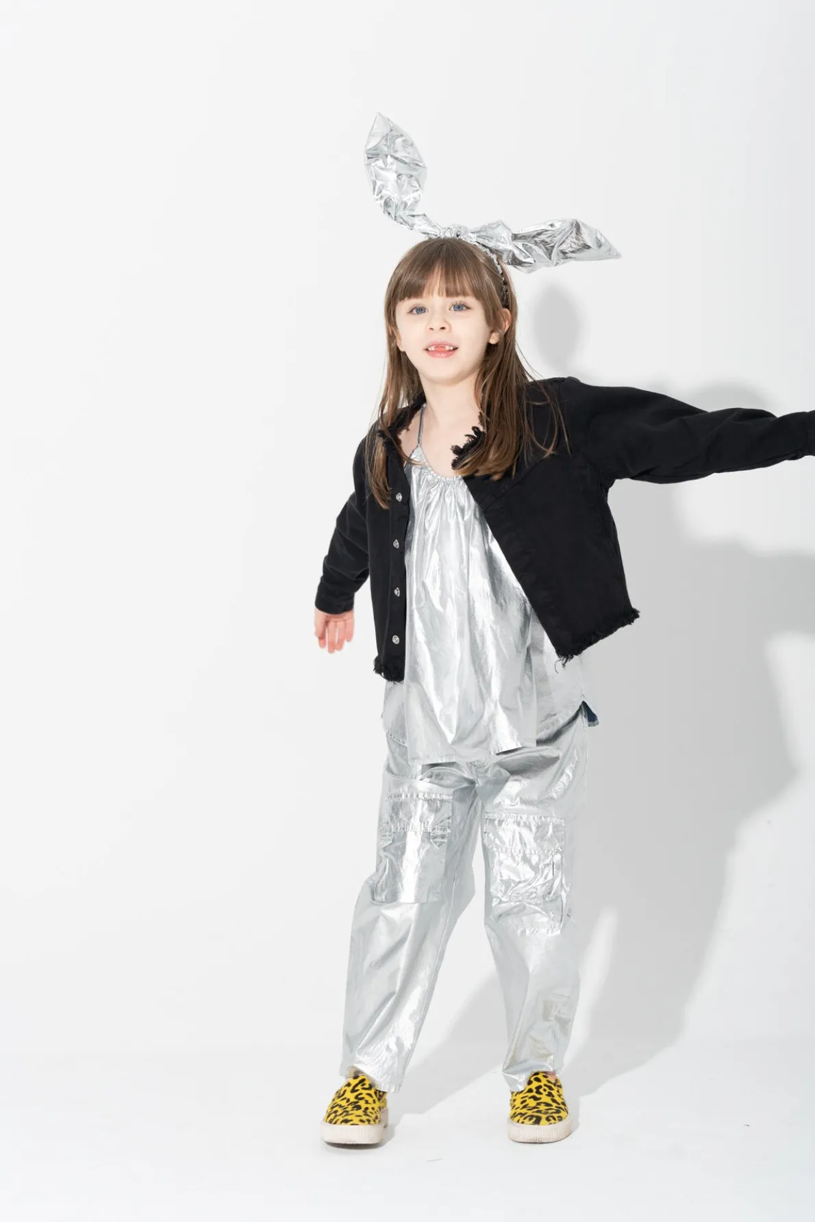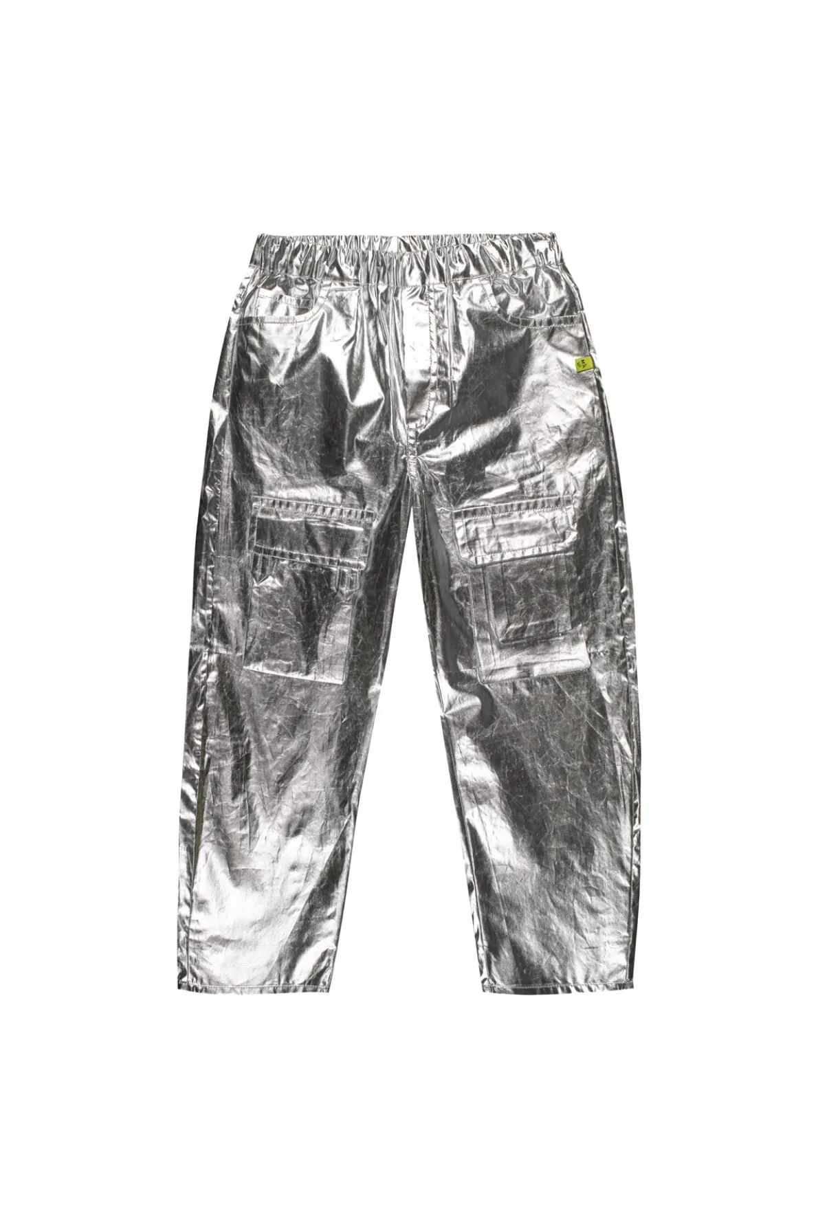 Crafted from shirting with foil, these baggy jeans feature wide legs, an adjustable elastic waist, and front pockets for a casual look. • Elastic waist• Wide leg• Multi pockets• Silver foil