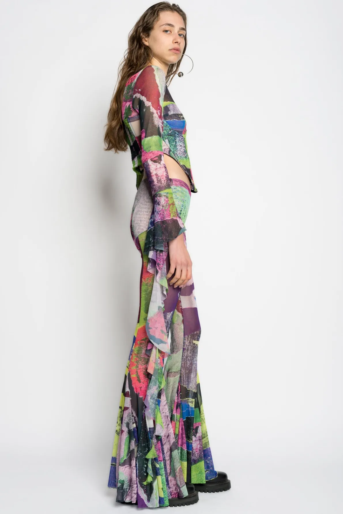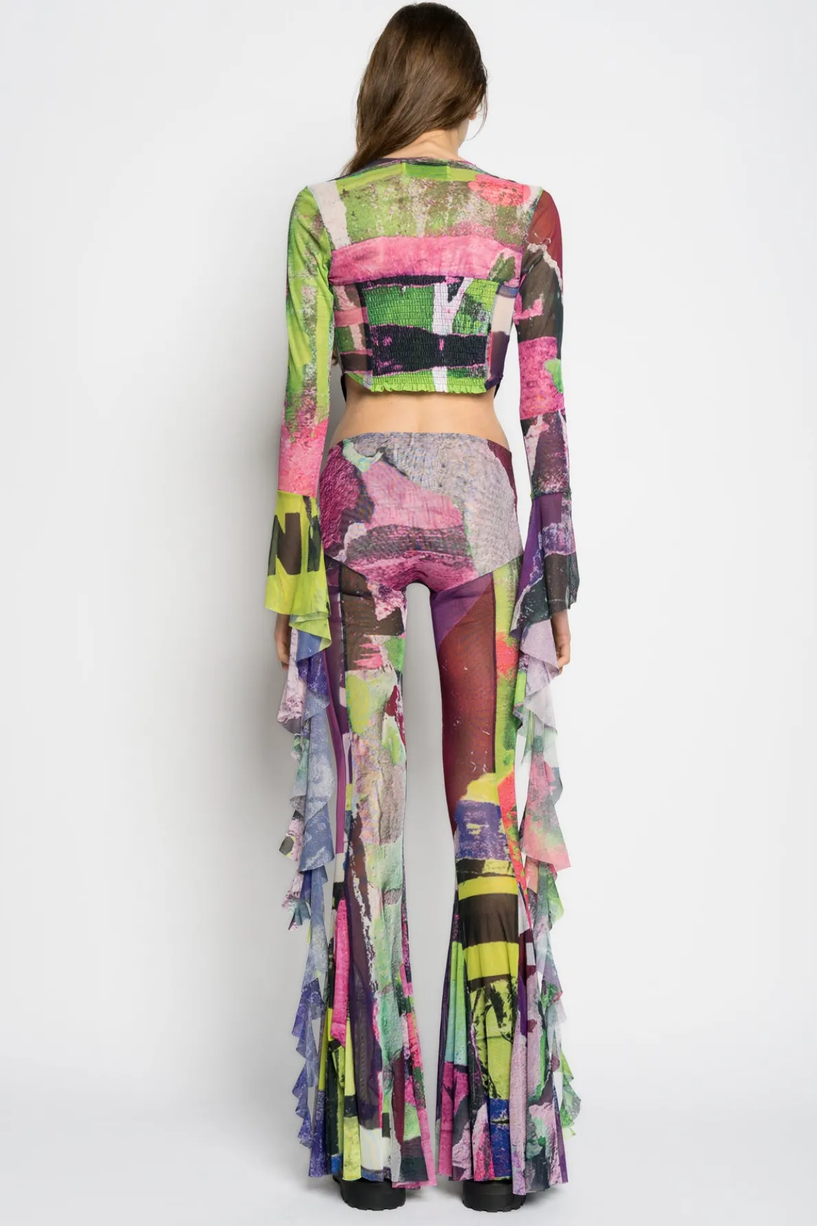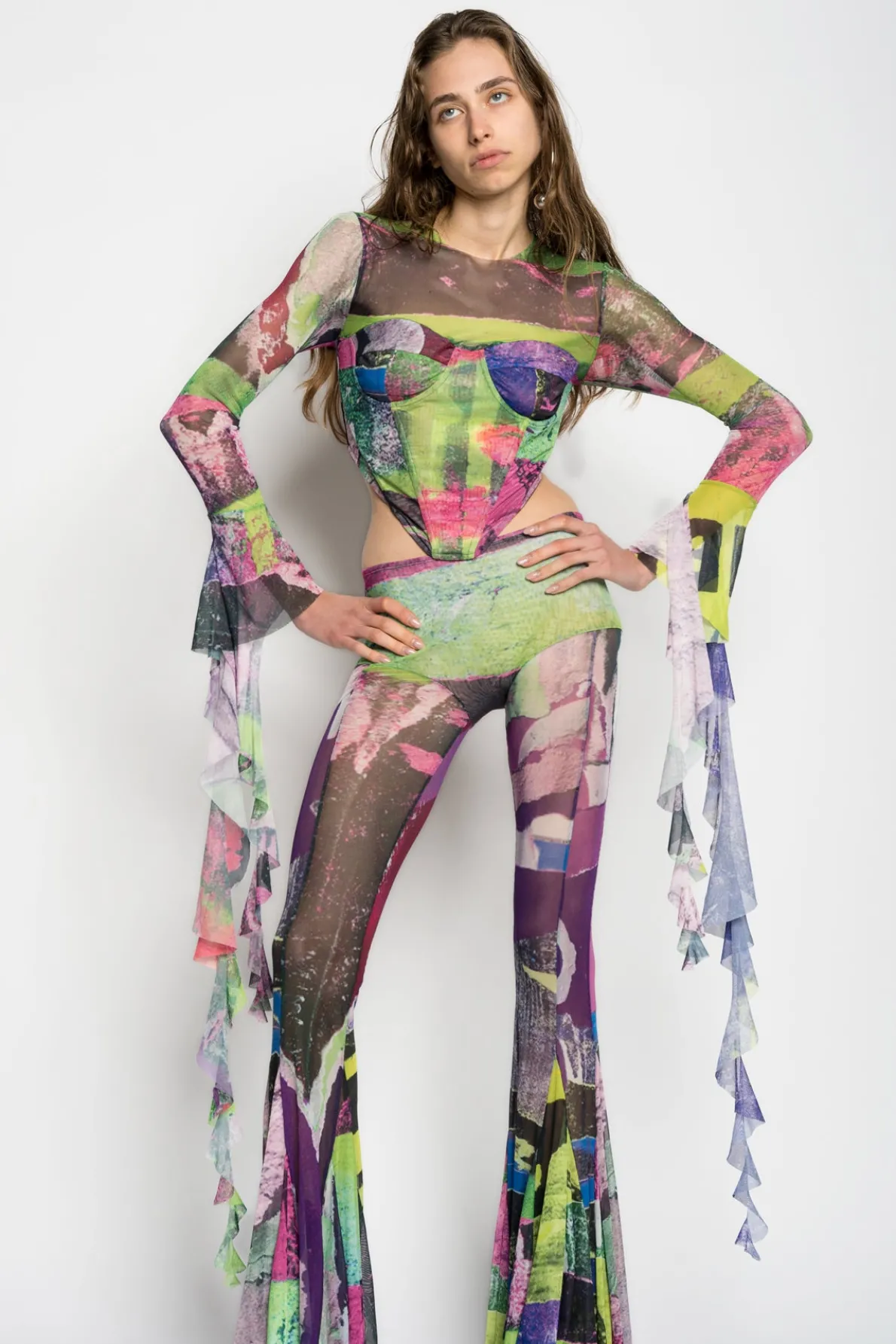 Description: Make a colorful statement in this graffiti-painted mesh corset top! Crafted with a classic round neck and flirty frills on the full-length sleeves, it'll be sure to turn heads. Fabric: Jersey Mesh 90% Recycled Polyester, 10% Spandex size and fit: Fitted Joana is 5ft8 / 177cm and is wearing a size S