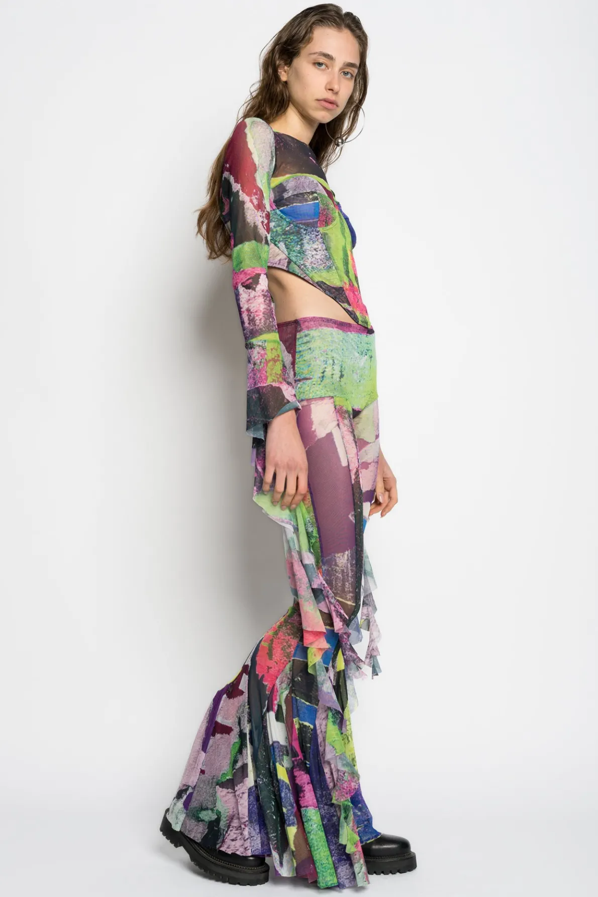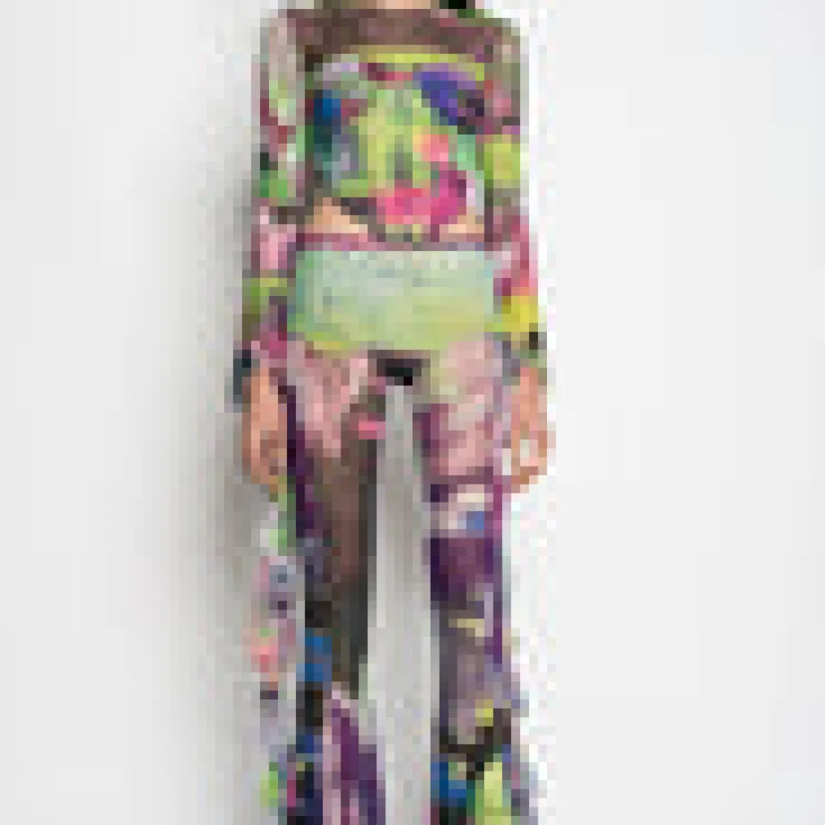 Description: Show off your bold style with these see-through trousers featuring graffiti-printed jersey mesh and a ruffled hem – perfect for a daring fashion moment! Fabric: Jersey Mesh 90% Recycled Polyester, 10% Spandex size and fit: True to Size Joana is 5ft8 / 177cm and is wearing a size Small (UK8). Please n