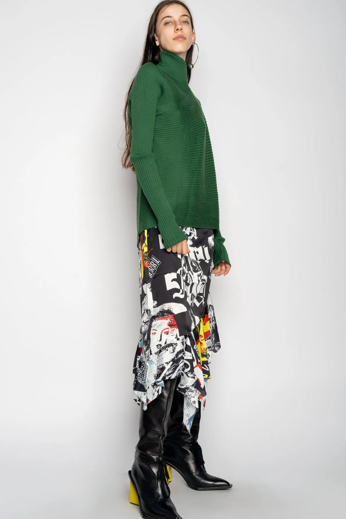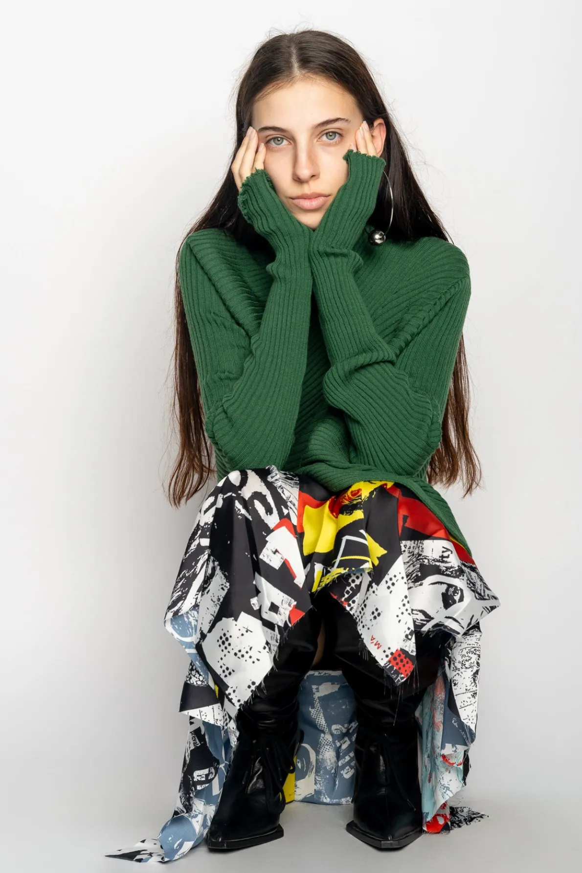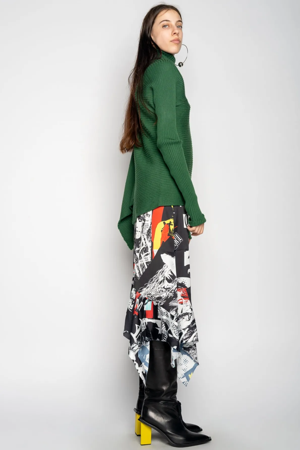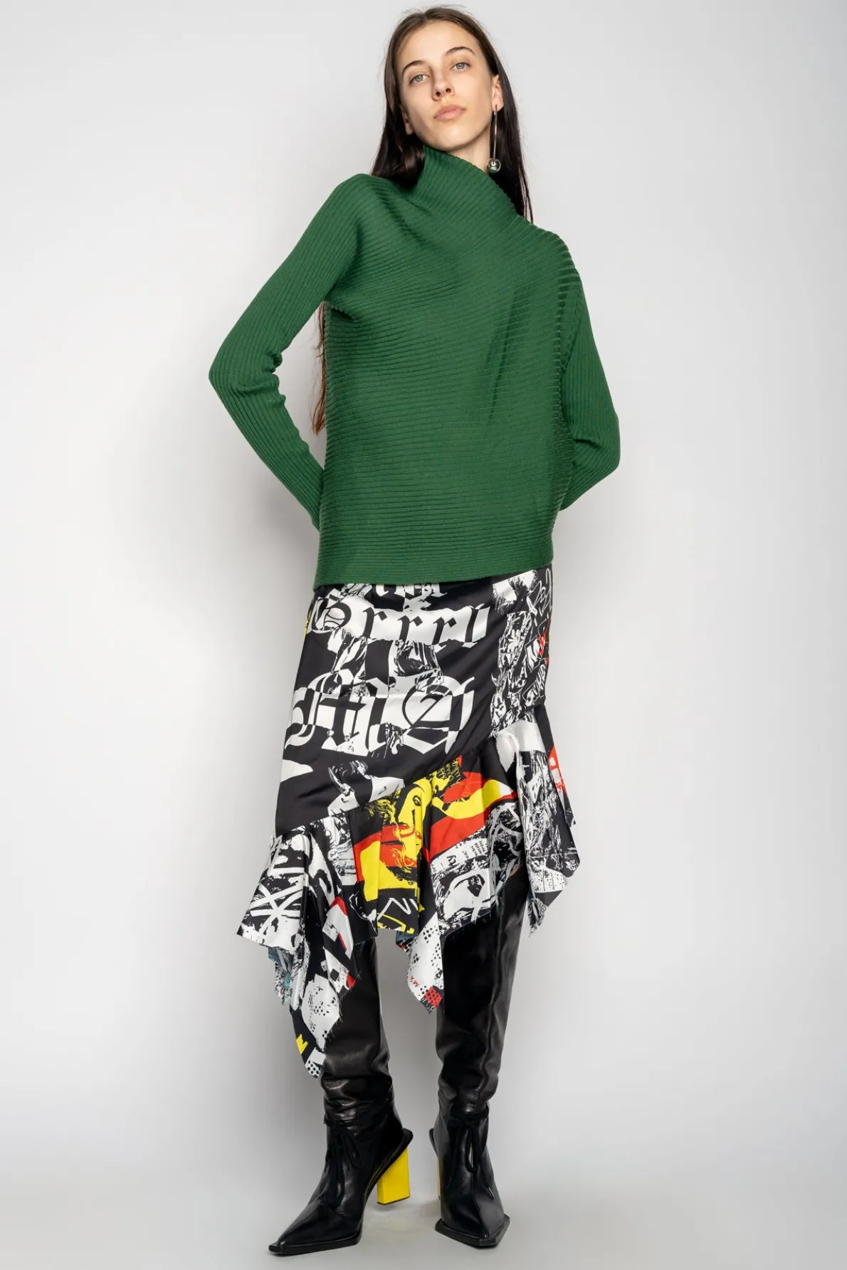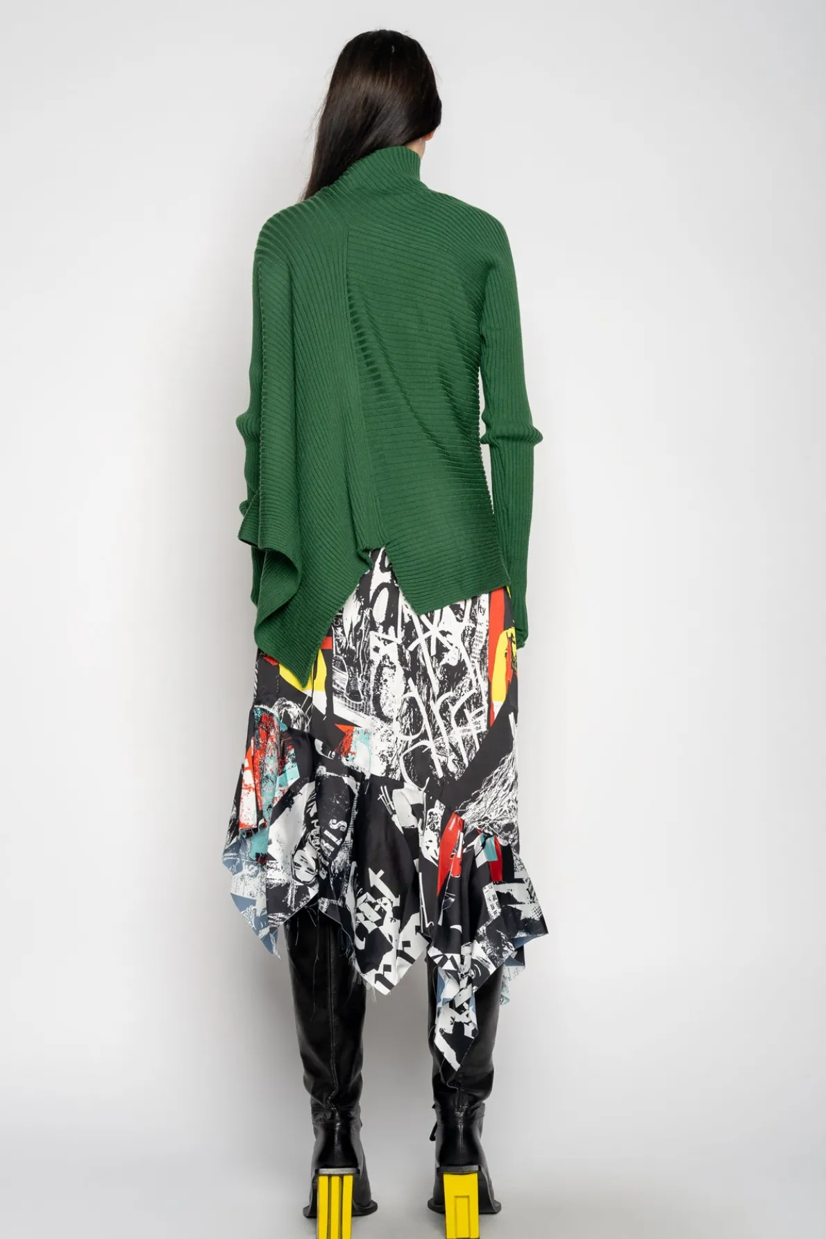 Description: Luxuriate in the luscious green merino knit of this asymmetric sweater! The slashed cowl neck, raw hemlines, and longline sleeves combine to craft a dreamily draped silhouette that's sure to captivate! Fabric: Merino Knit 100% Merino Wool Made of mulesing free wool – animal cruelty free. size and fit