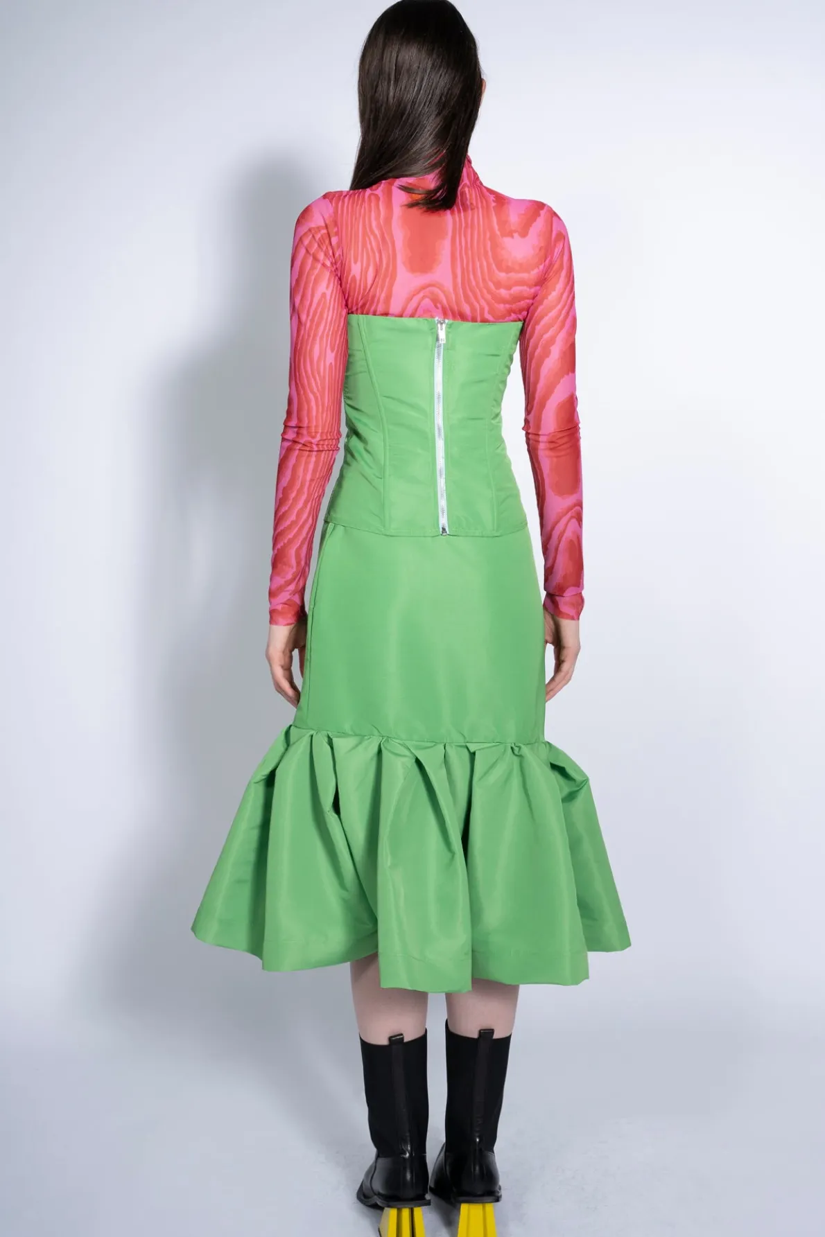 Luxurious taffeta envelops this alluring green fitted skirt, exquisitely adorned by romantic ruffles at the bottom.• Mid-length• Puff hem• Green taffeta• Invisible zip