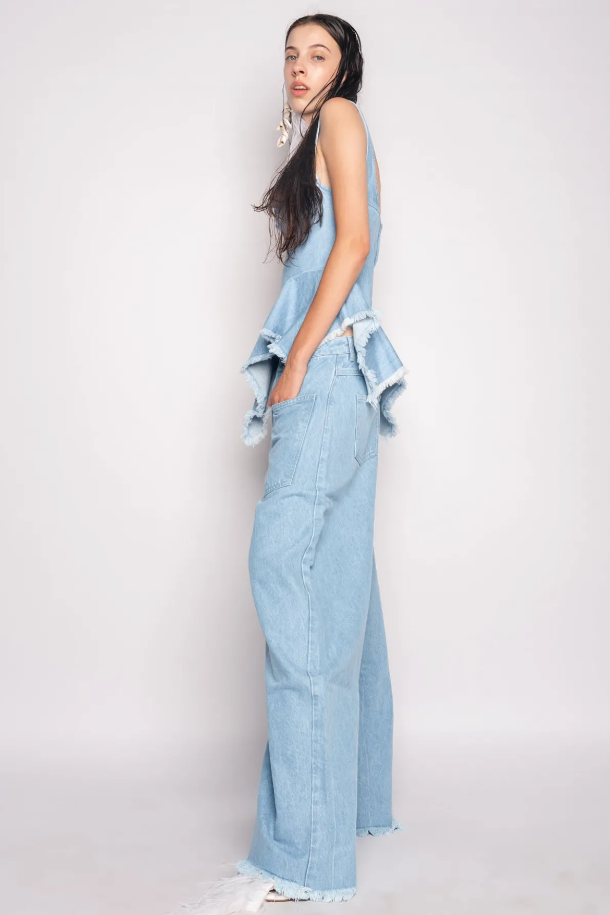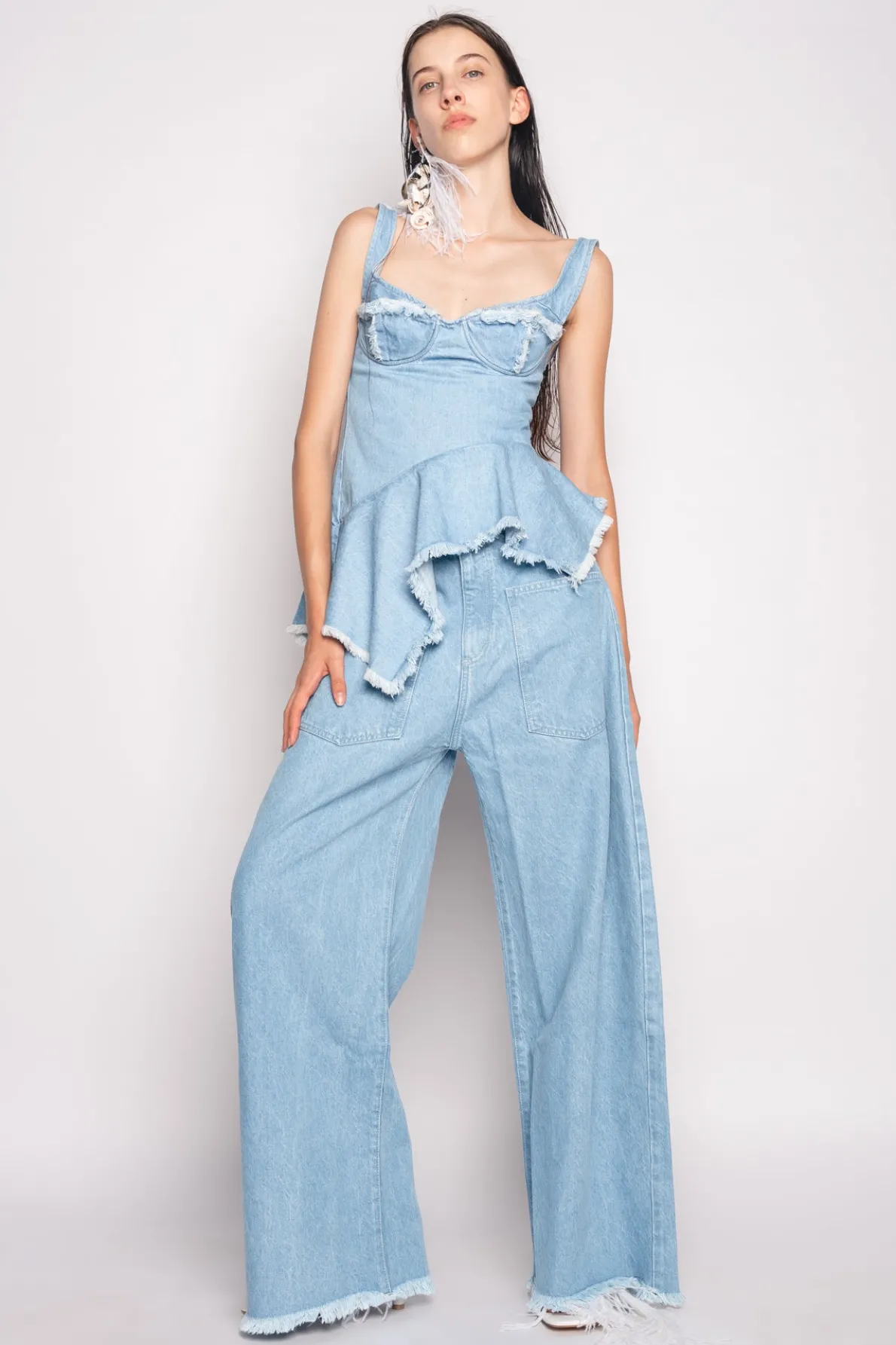 Description: Classic M'A 5-pocket boyfriends in vibrant turquoise overdyed denim. These wide-leg jeans provide a relaxed, dropped-waist fit with an irresistibly raw hem.• Overdye• Oversized• Drop waist• Five pockets Fabric: Denim 62% Cotton 38% Recycled Cotton size and fit: Oversized Beatriz is 5ft8 / 174 cm an