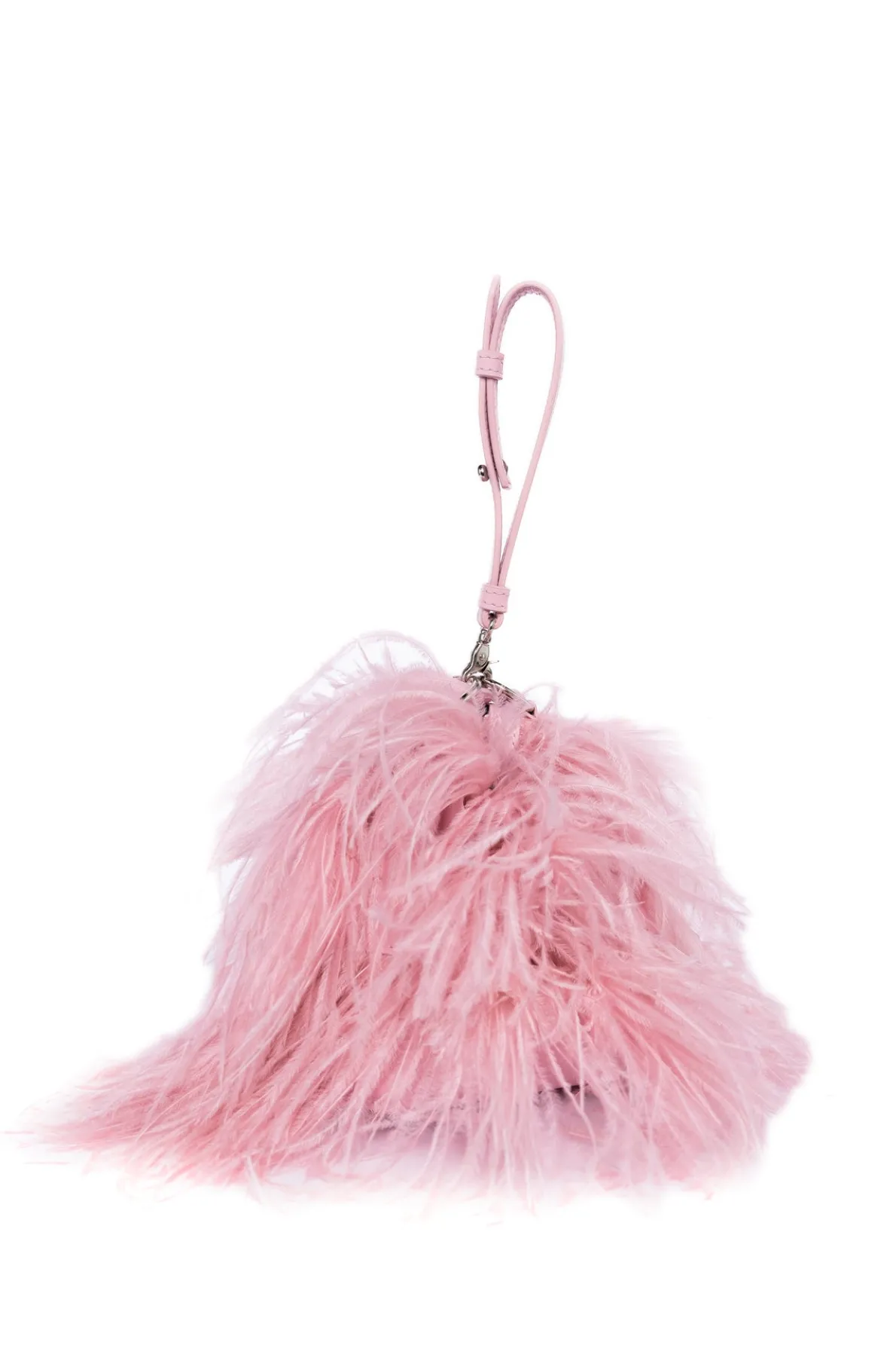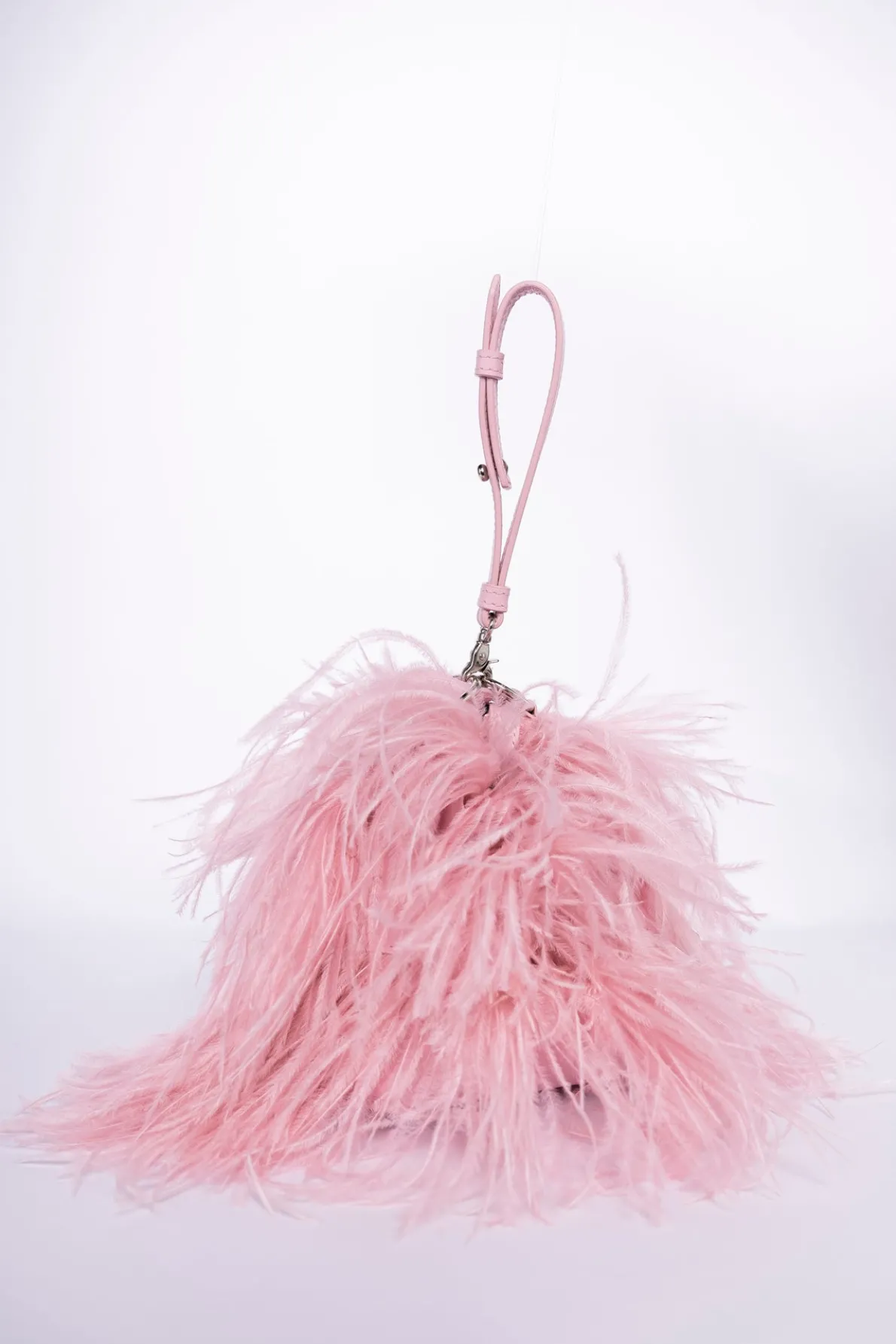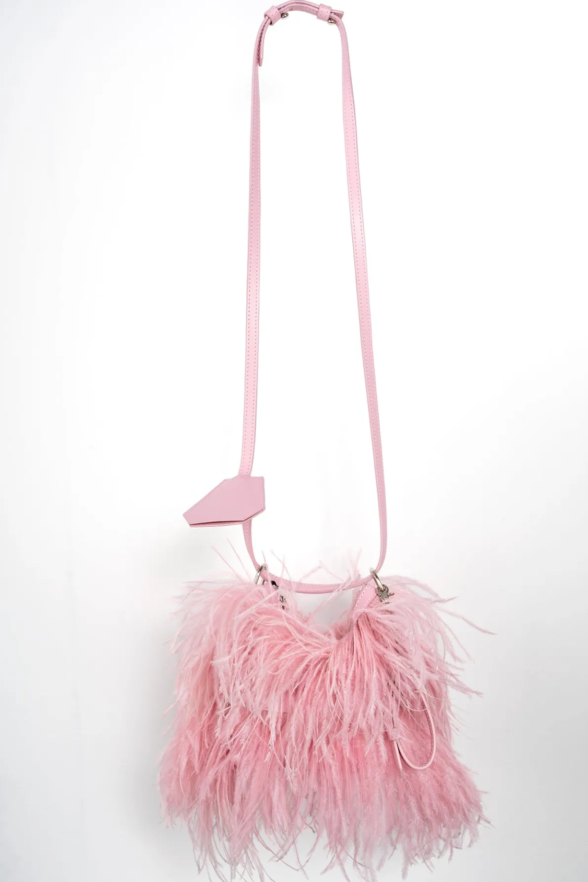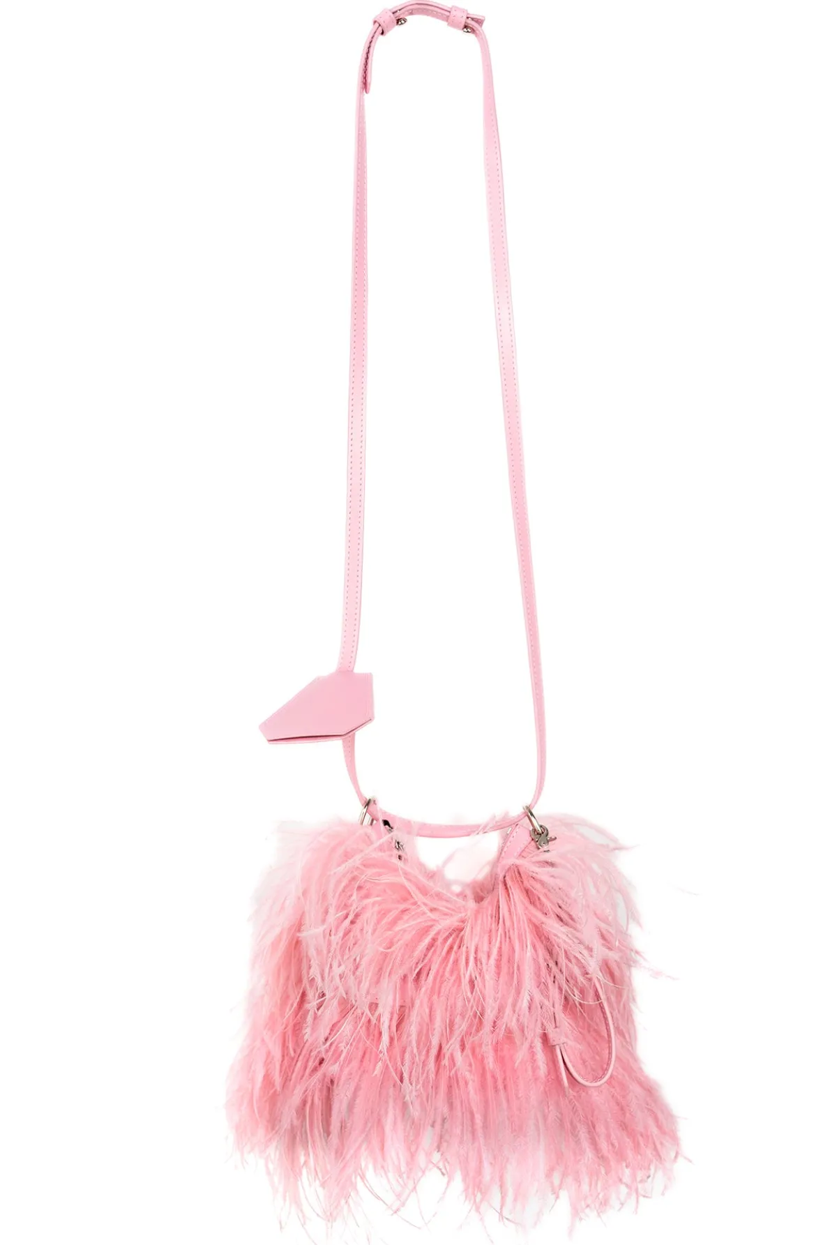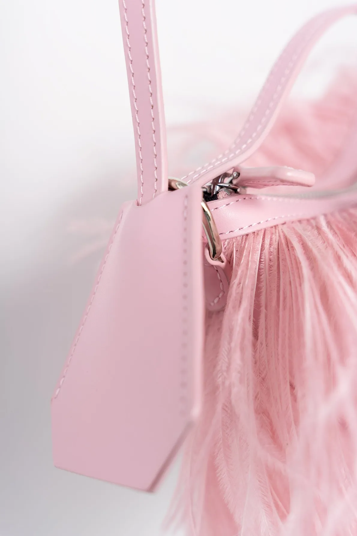 Description: This Baby Pink Leather Bag is adorned with sensational pink feathers, running along its exterior. It fastens with a zip, and boasts an inner pocket. For ultimate convenience, the shoulder strap can be worn as a crossbody, shortened to a handheld purse, or even wrapped around your wrist as a clutch! F