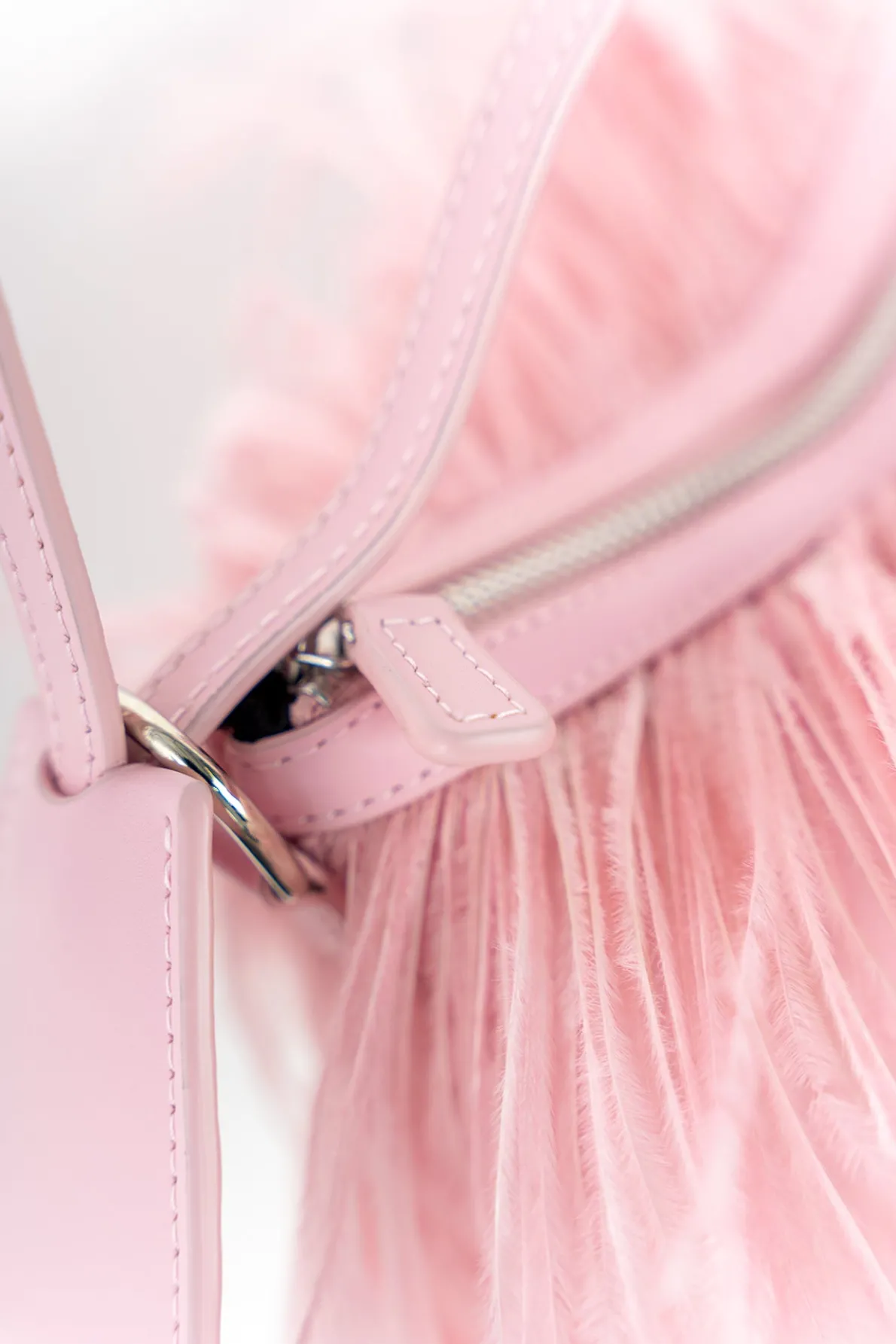 This light pink leather bag is adorned with sensational pink feathers, running along its exterior. It fastens with a zip, and boasts an inner pocket. For ultimate convenience, the shoulder strap can be worn as a crossbody, shortened to a handheld purse, or even wrapped around your wrist as a clutch!• Light pink• Leather• Feathers• Shoulder and hand straps