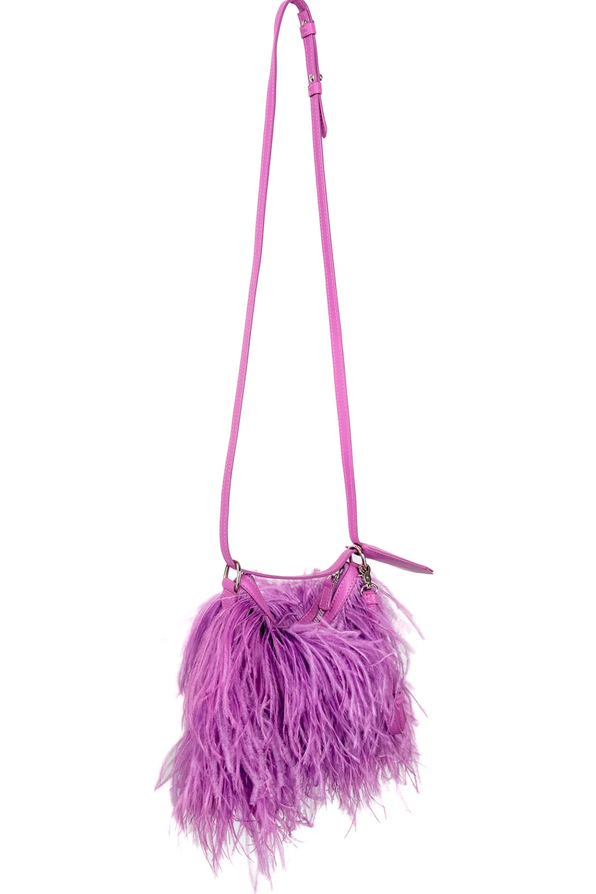 Glam up your wardrobe with this beautiful lilac feather bag! Crafted from luxe leather and decorated with delicate feathers, it has a secure zip closure, an inner pocket, and an adjustable strap that can be worn as a crossbody, a handbag, or even a wrist clutch.• Lilac• Feathers• Leather• Adjustable strap