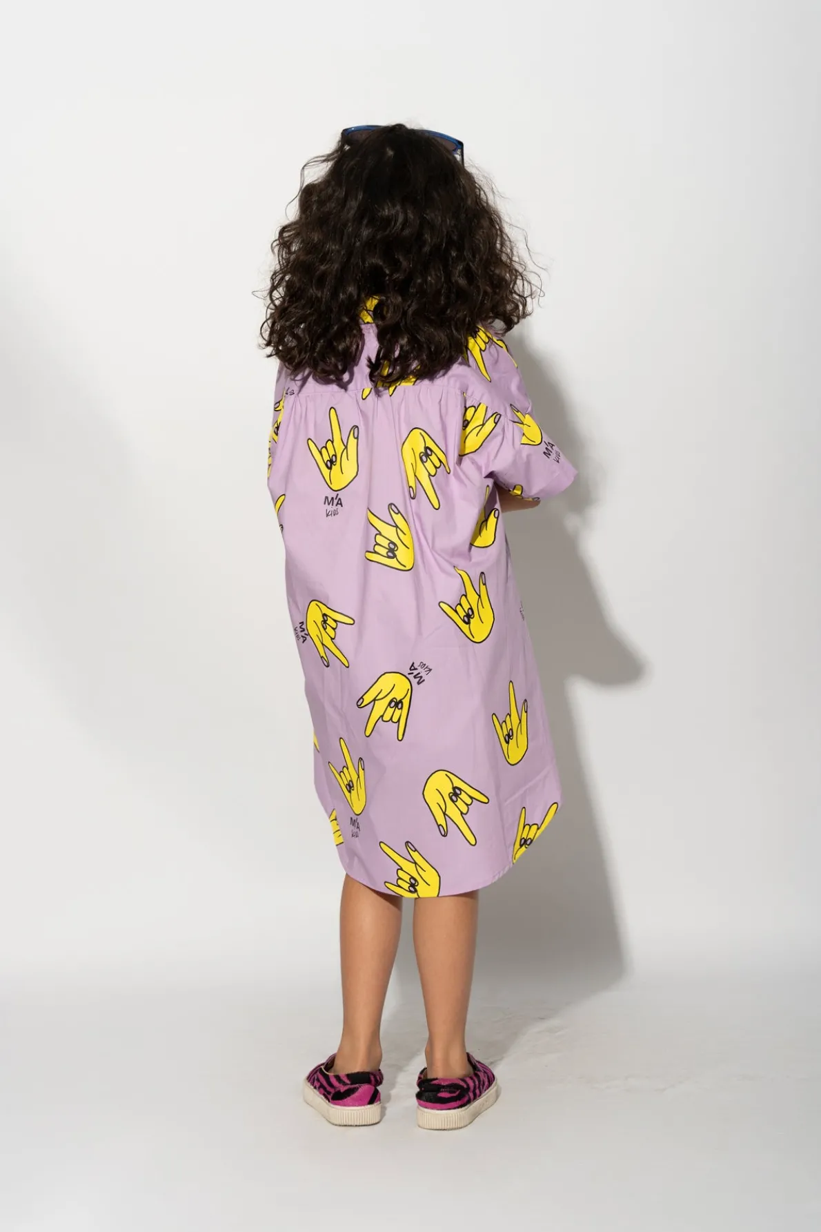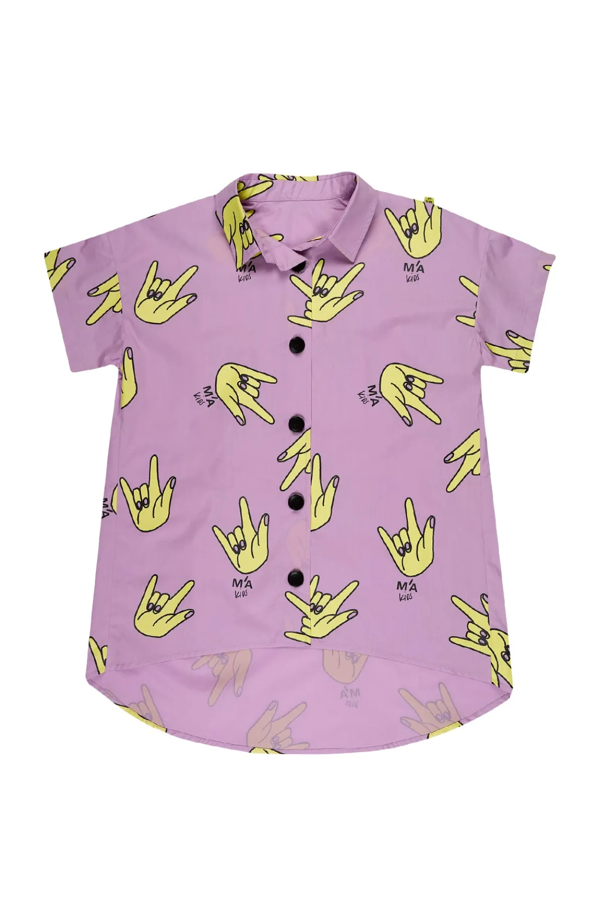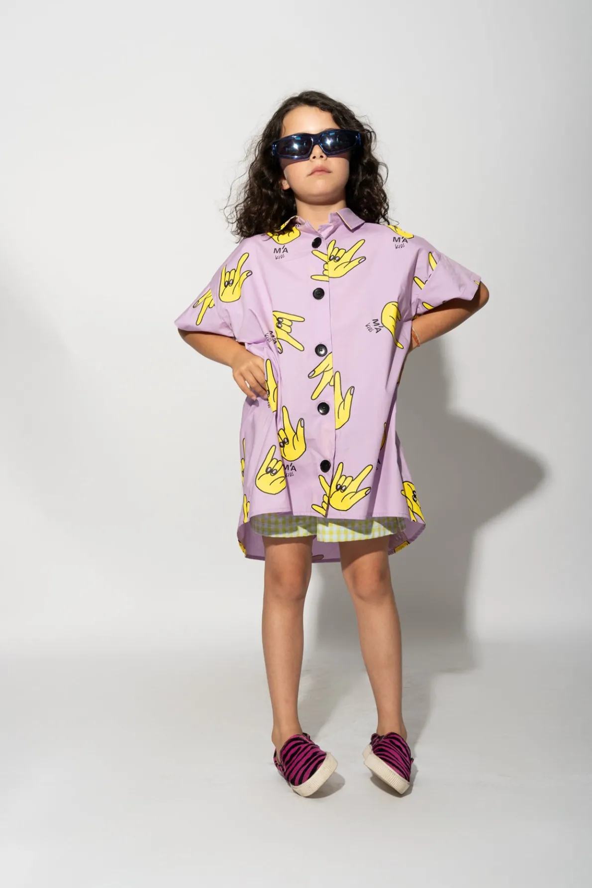 Oversized shirt in lilac with all-over hands printed shirting with short sleeves, pleated back and front buttons. Get hands-on fashion for kids. This shirt is as comfy as it is cool, perfect for their daily adventures! • Hands print• Short sleeves• Pleated back• Button up front
