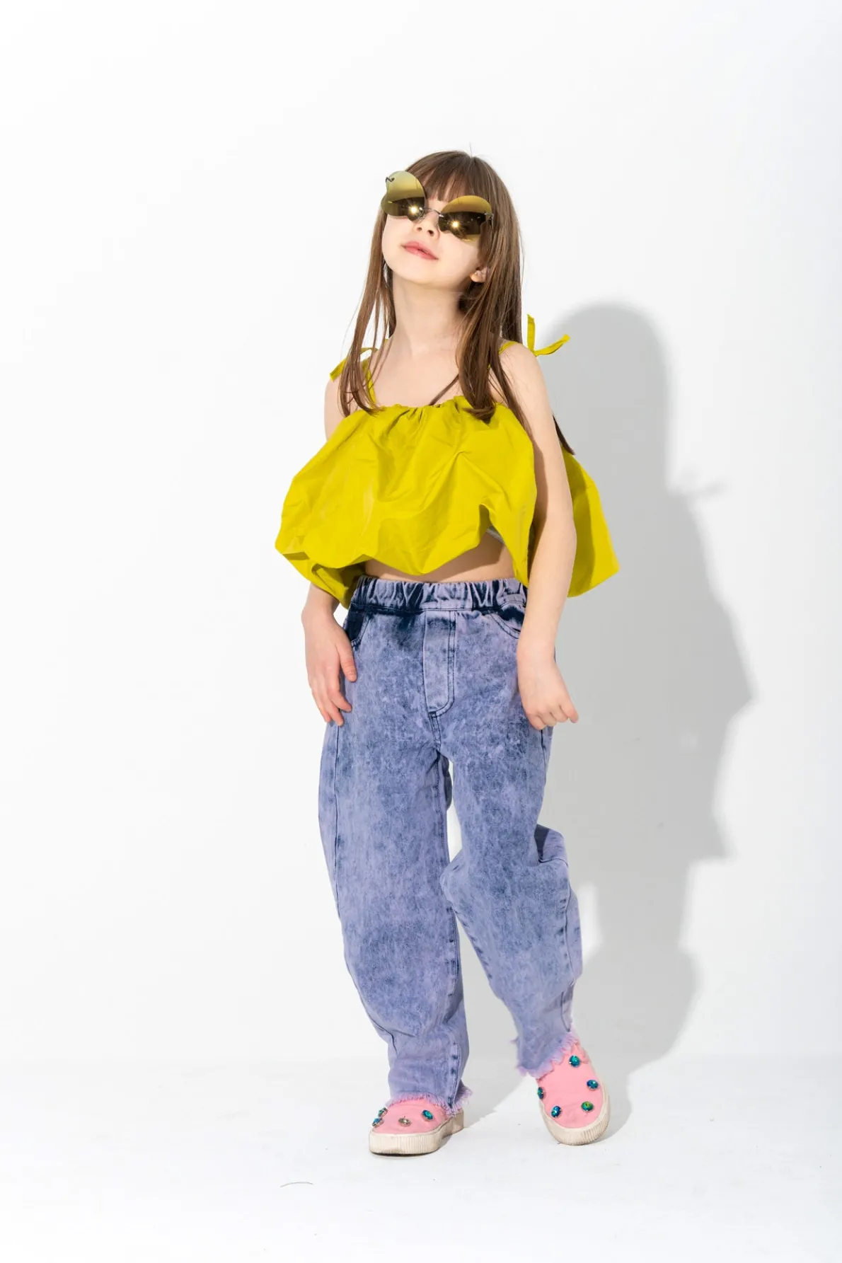 One shoulder top in denim with asymmetric and frayed hem. Fabric: Denim 85% Cotton, 15% Recycled Cotton size and fit: Product in pictures is size 5 years